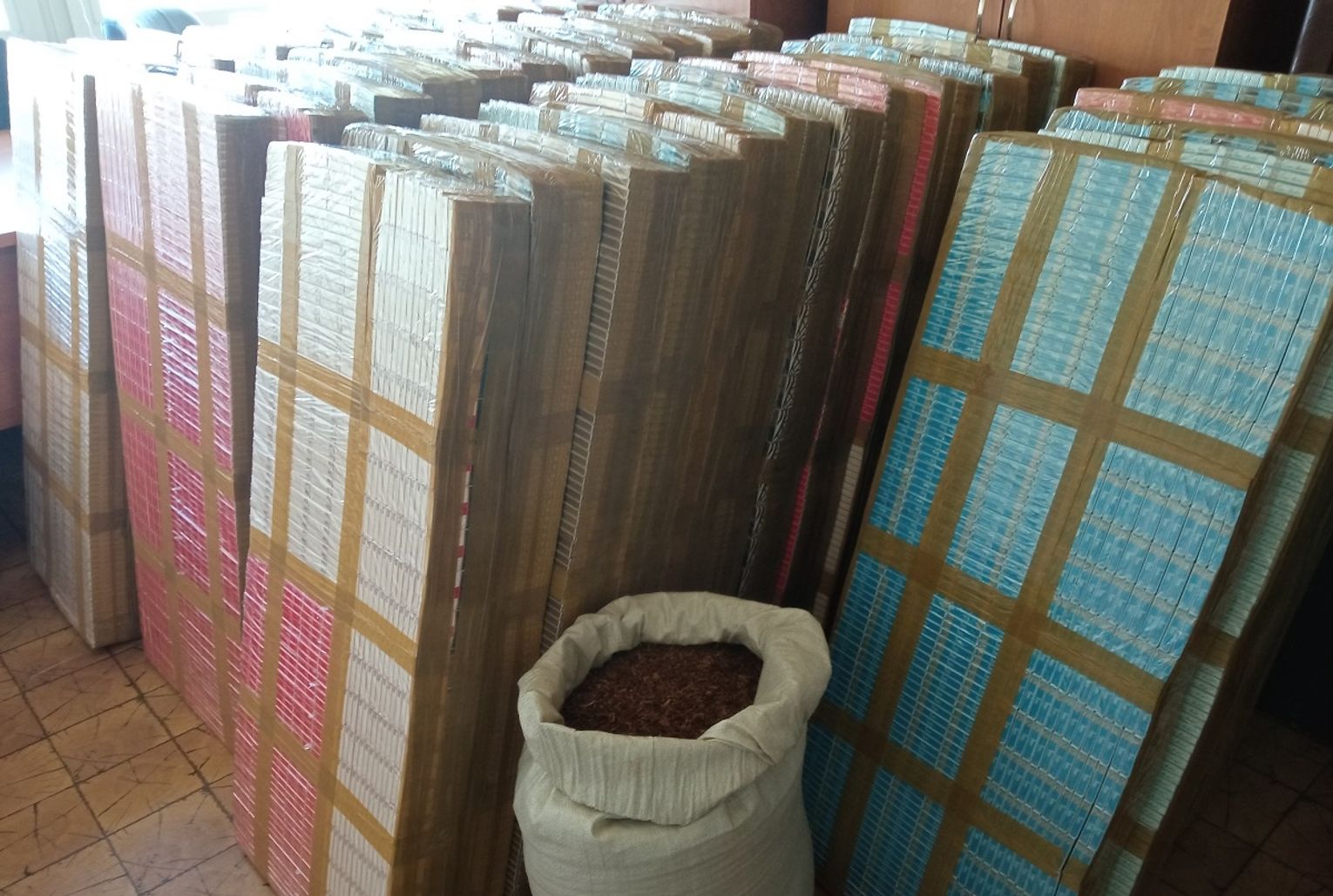 Mężczyzna został zatrzymany, a „trefny” towar zabezpieczony. Okazało się, że jest to prawie 15 kilogramów krajanki tytoniowej i 30 tysięcy paczek papierosów bez wymaganych znaków skarbowych.