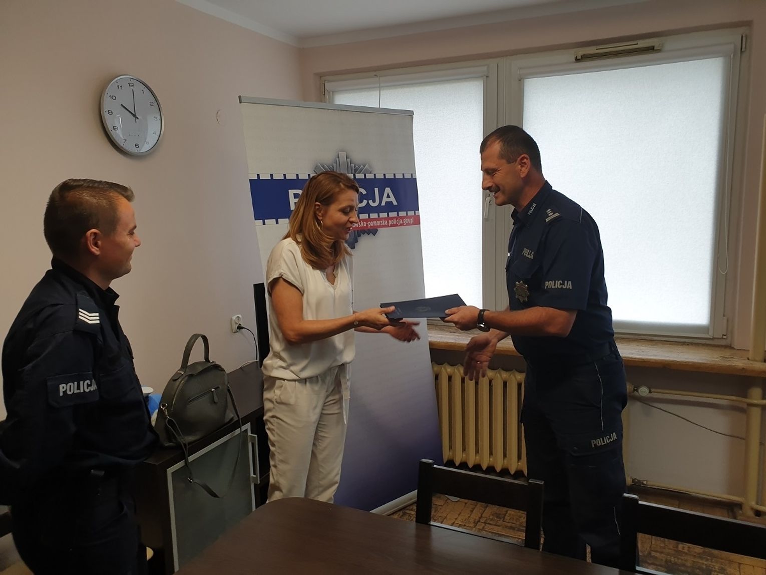 Komendant włocławskich policjantów insp. Marcin Zaleśkiewicz podziękował Pani Małgorzacie Podolskiej i sierż. sztab. Łukaszowi Jędrzejewskiemu za udzielenie pomocy kobiecie, która straciła przytomność i przestała oddychać podczas podróży. Dzięki ich szybkim i profesjonalnym działaniom nie doszło do tragedii.