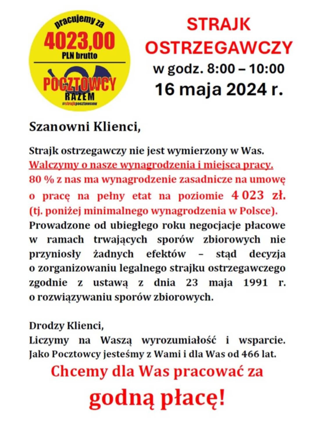 "Strajk ostrzegawczy nie jest wymierzony w Was, szanowni klienci. Walczymy o nasze wynagrodzenie i miejsca pracy. 80% z nas ma wynagrodzenie zasadnicze na umowę o pracę na pełen etap na poziomie 4023 zł. To jest poniżej minimalnego wynagrodzenia w Polsce," czytamy w oświadczeniu.