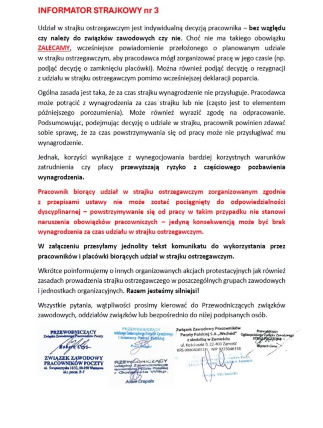 "Prowadzone od ubiegłego roku negocjacje płacowe w ramach trwających sporów zbiorowych nie przyniosły żadnych efektów. Stąd decyzja o zorganizowaniu legalnego strajku ostrzegawczego zgodnie z ustawą z dnia 23 maja 1991 roku o rozwiązywaniu sporów zbiorowych."