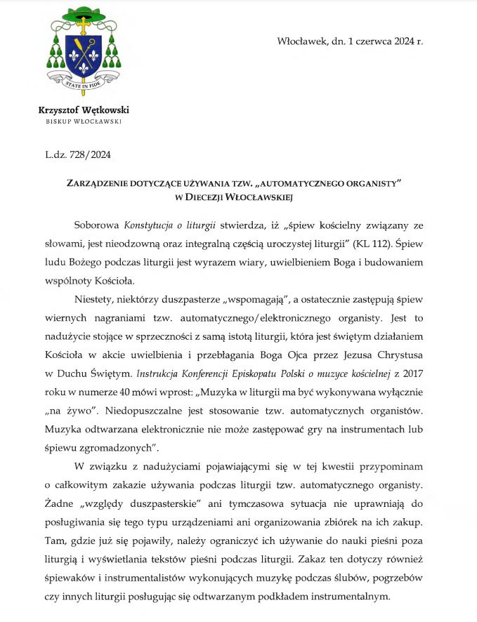 W dobie powszechnej automatyzacji, informatyzacji i cyfryzacji, nowe technologie wkraczają w coraz to nowe obszary naszego życia, w tym także w sferę religijną. W odpowiedzi na narastające przypadki stosowania automatycznych organistów podczas liturgii, biskup Diecezji Włocławskiej wydał zdecydowane zarządzenie zakazujące ich używania. List pasterski, opublikowany przez biskupa, podkreśla, że takie praktyki są sprzeczne z istotą liturgii i stanowią nadużycie.