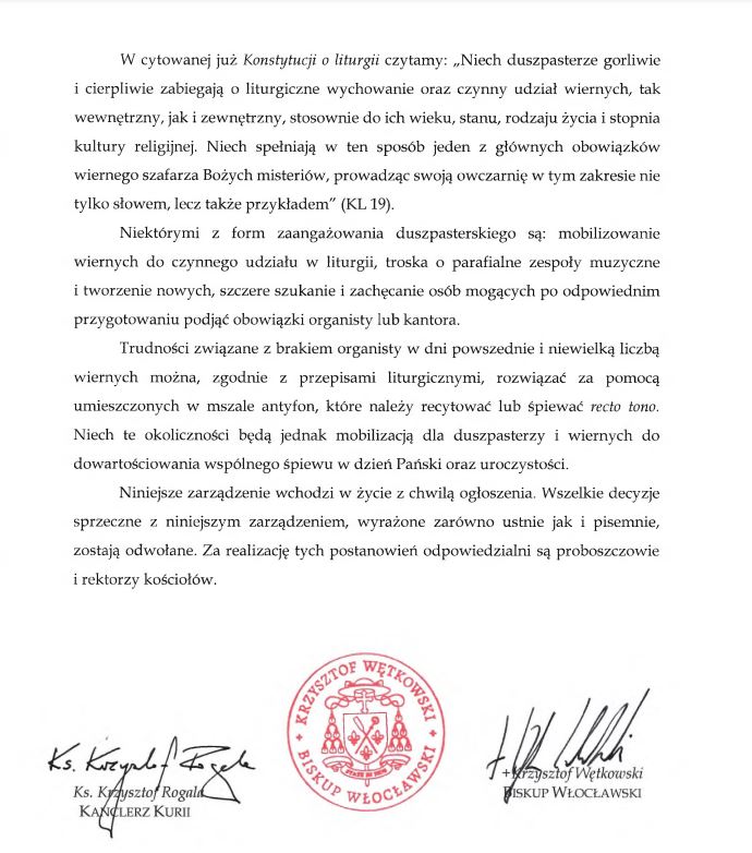 W przypadku trudności związanych z brakiem organisty, biskup zaleca stosowanie antyfon umieszczonych w mszale, które mogą być recytowane lub śpiewane. Zarządzenie wchodzi w życie z chwilą ogłoszenia, a za jego realizację odpowiedzialni są proboszczowie i rektorzy kościołów.