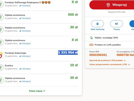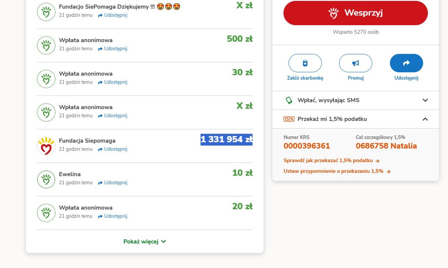 Na portalu SiePomaga.pl organizowane są zbiórki pieniędzy dla osób chorych, których rodzin nie stać na podjęcie skutecznego leczenia. Darczyńcy, zazwyczaj anonimowi, udzielają wsparcia. Kwoty są różne, od symbolicznej złotówki po nawet kilkadziesiąt tysięcy. Liczy się każdy grosz.