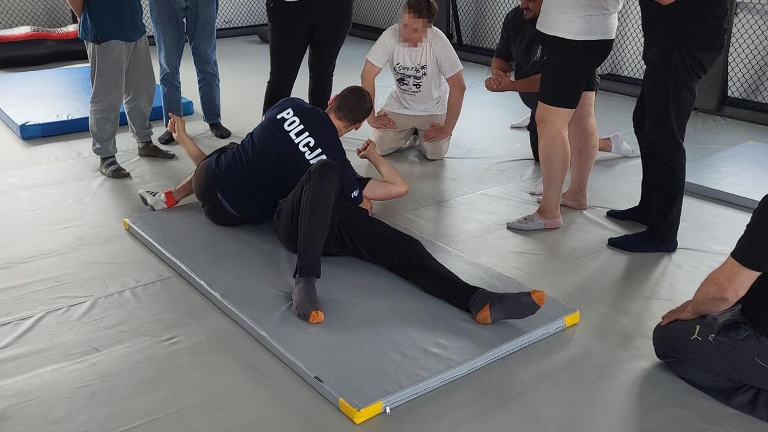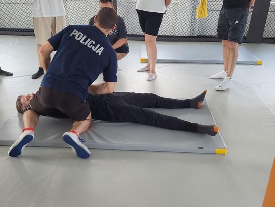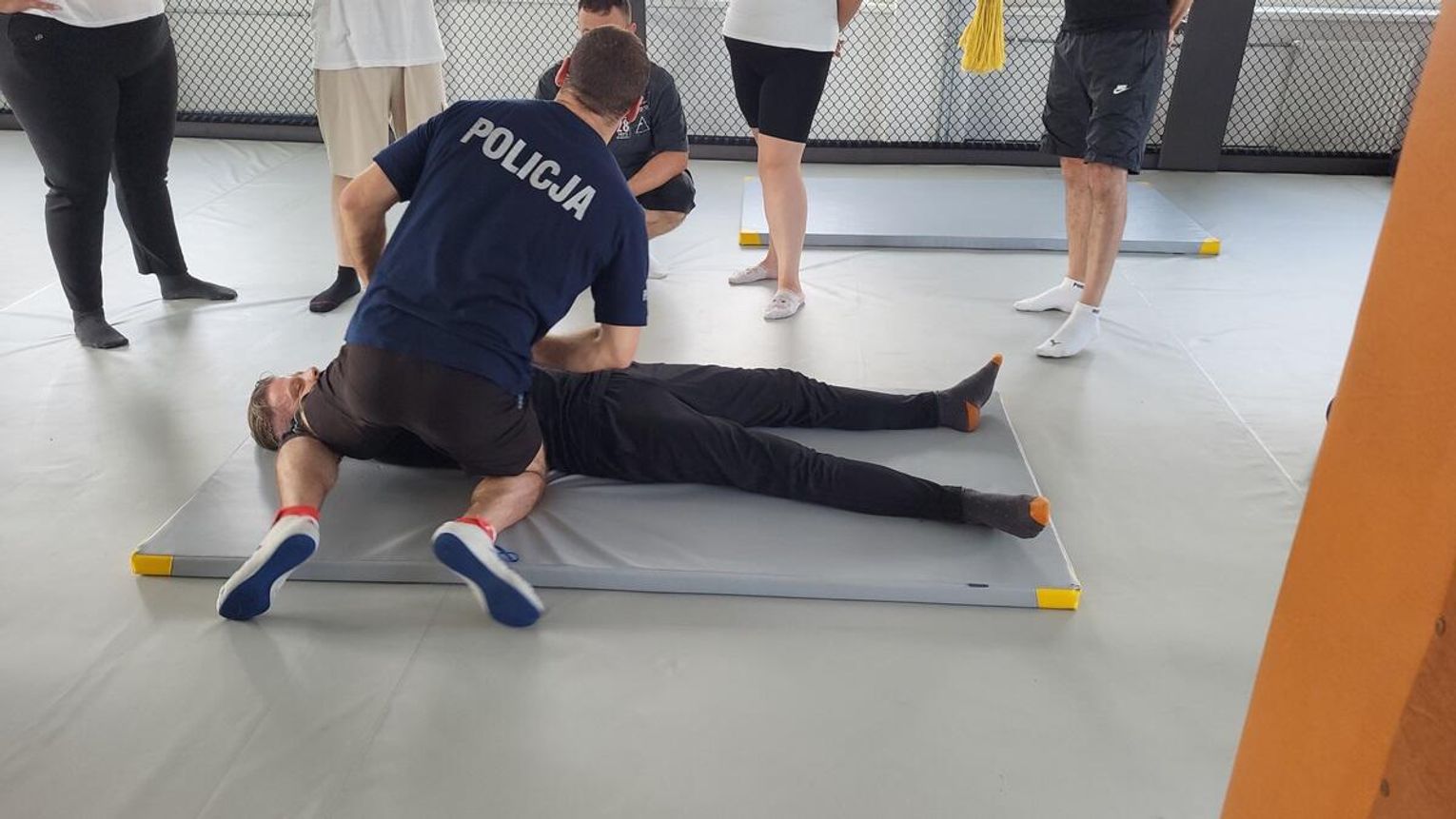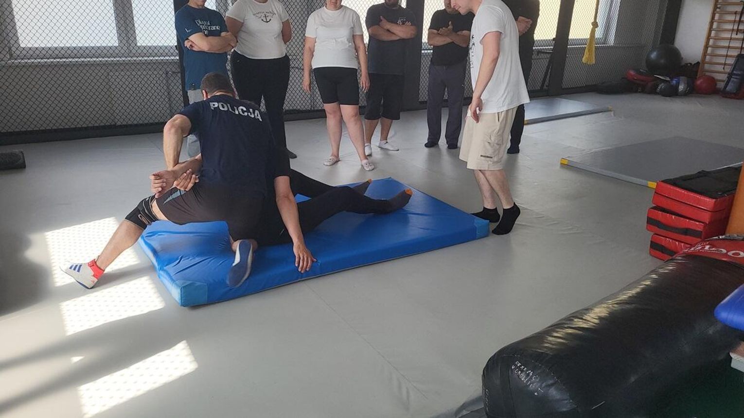 Zajęcia prowadzi instruktor policyjny, który na co dzień szkoli funkcjonariuszy komendy. Mundurowy wyjaśnił uczestniczącym w szkoleniu ratownikom zasady efektywnego odpierania ataku, prezentując techniki skutecznej obrony w obliczu agresywnych zachowań.