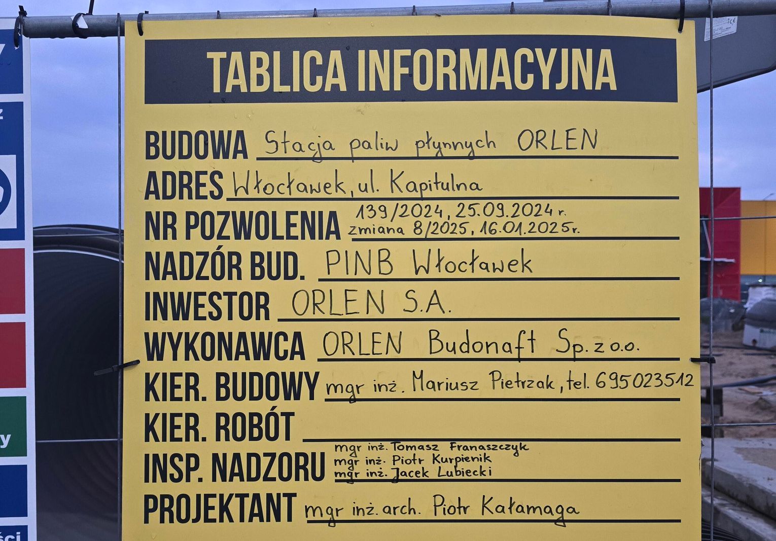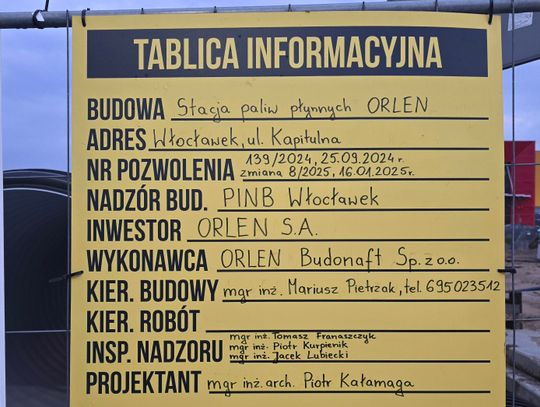 Stacja powstaje na działce nr 13/21 w obrębie ewidencyjnym miasta Włocławek blisko dużych sklepów. Na ogrodzeniu placu budowy znajduje się czytelna tablica informacyjna. Wynika z niej, że inwestorem jest Orlen S.A., a wykonawcą robót firma ORLEN Budonaft Sp. z o.o. Budowa odbywa się na podstawie pozwolenia nr 139/2024 z dnia 25 września 2024 r., z późniejszą zmianą oznaczoną jako nr 8/2025 z dnia 16 stycznia 2025 r.