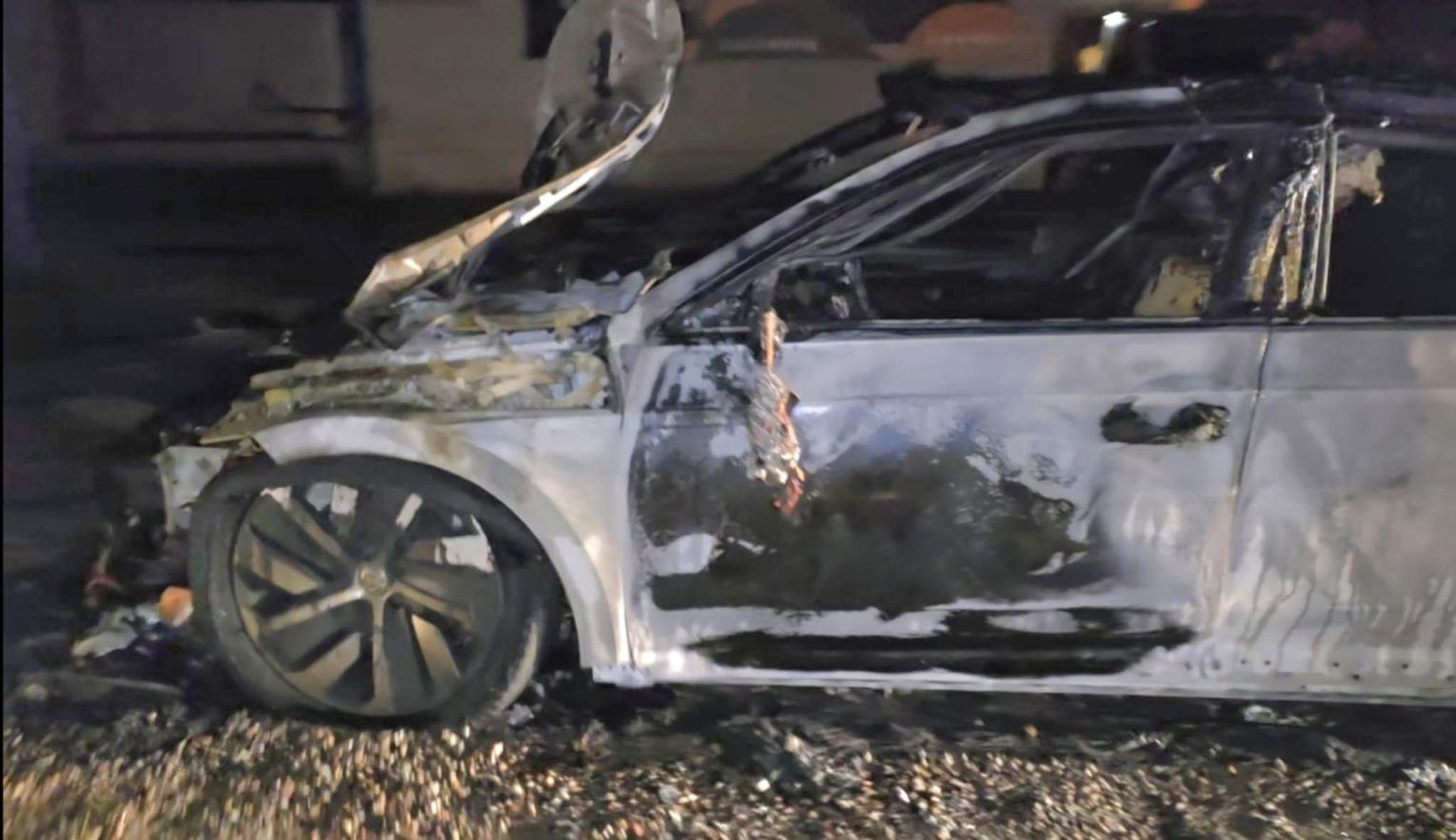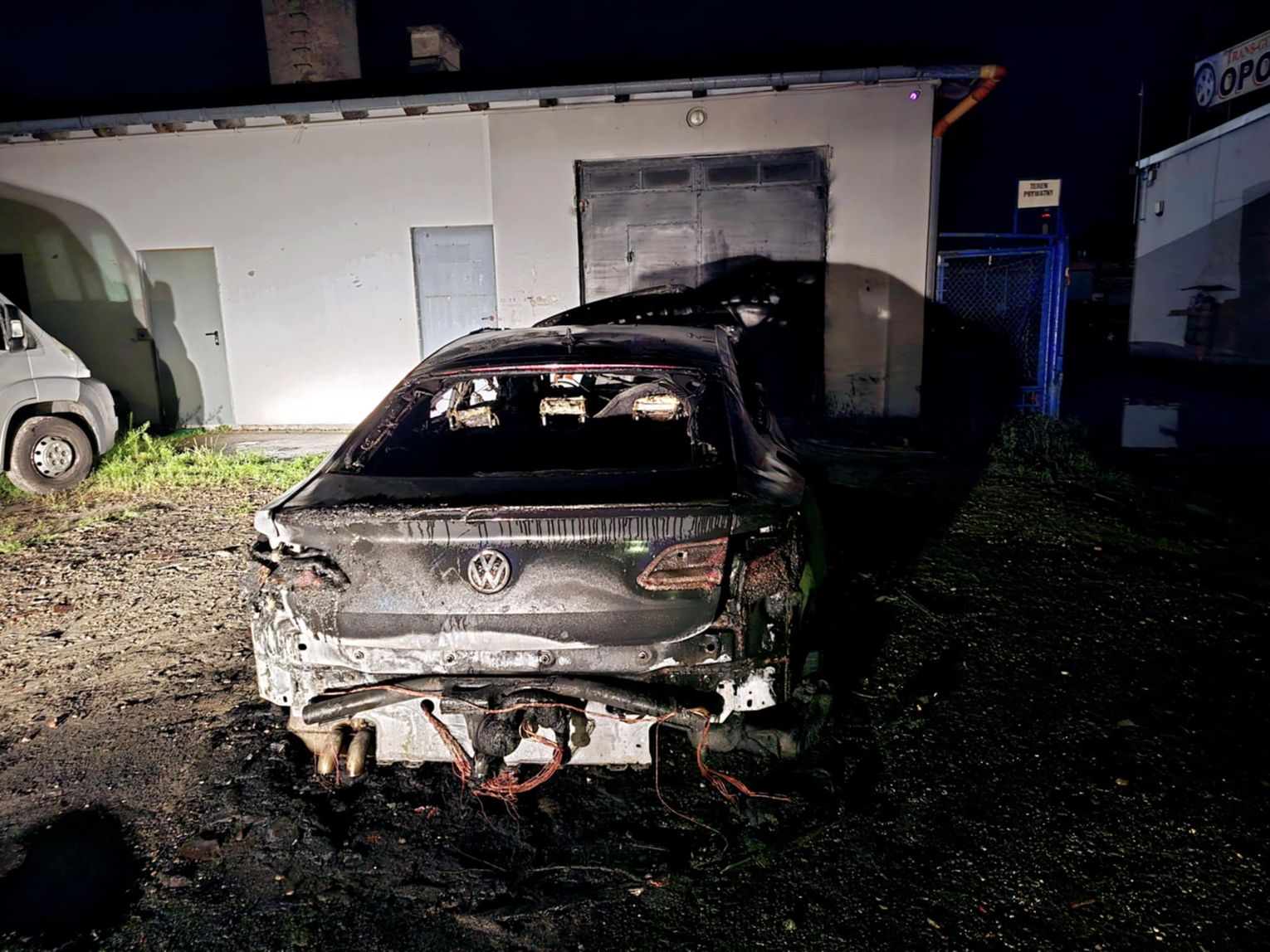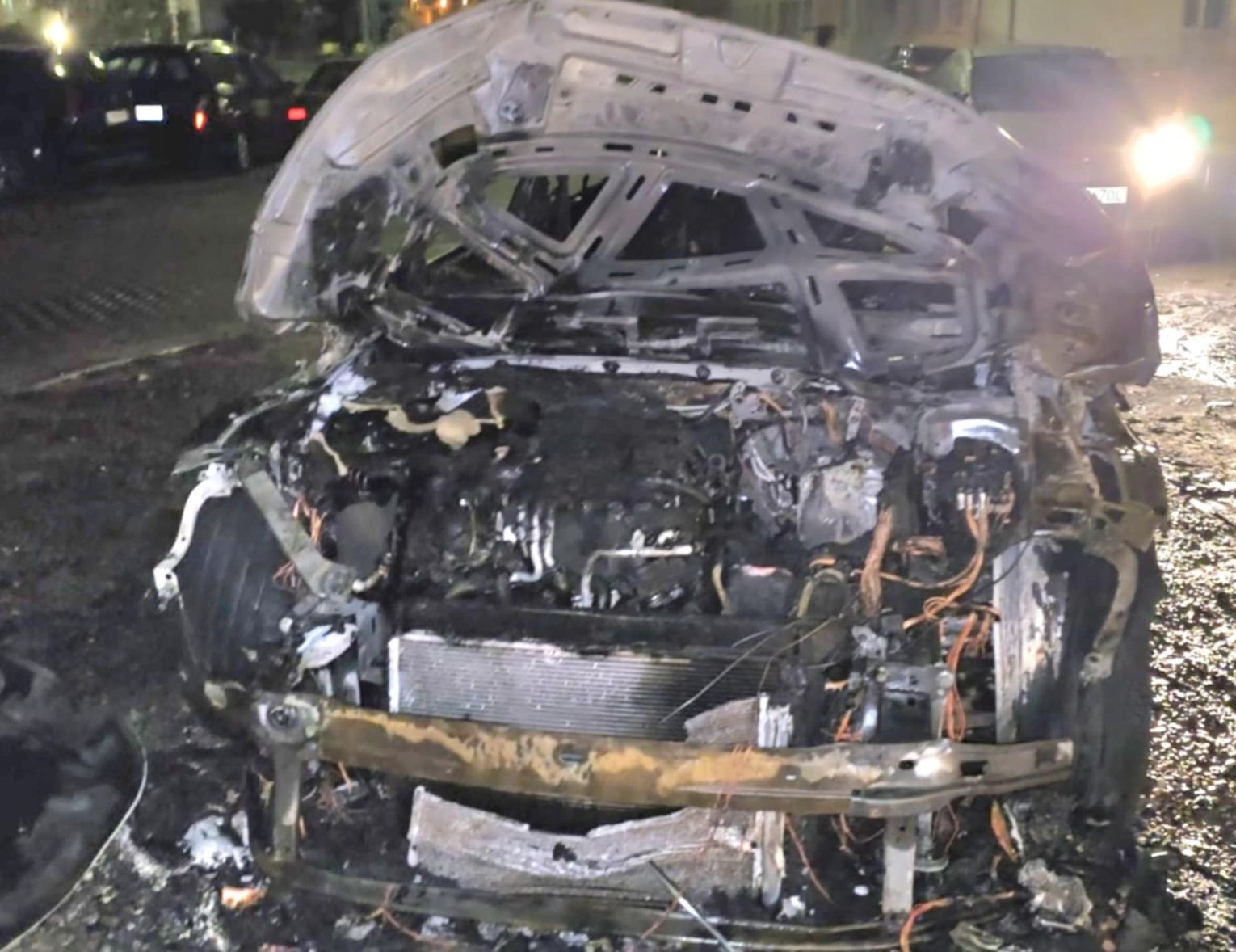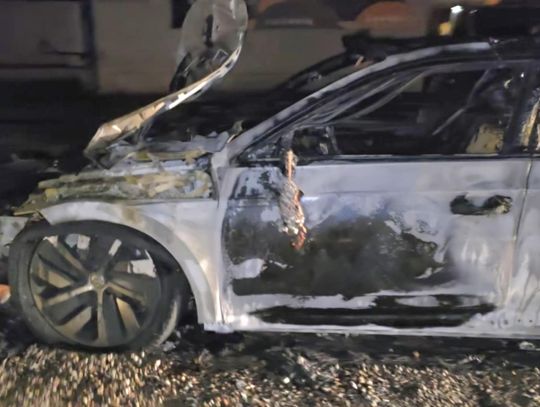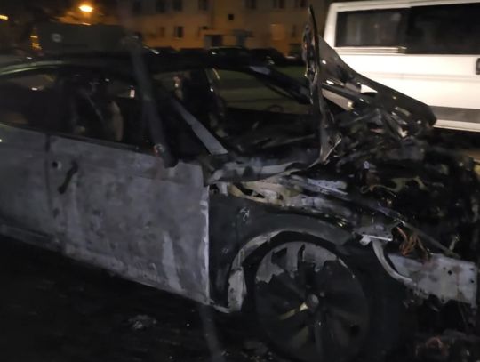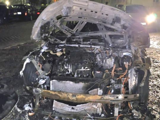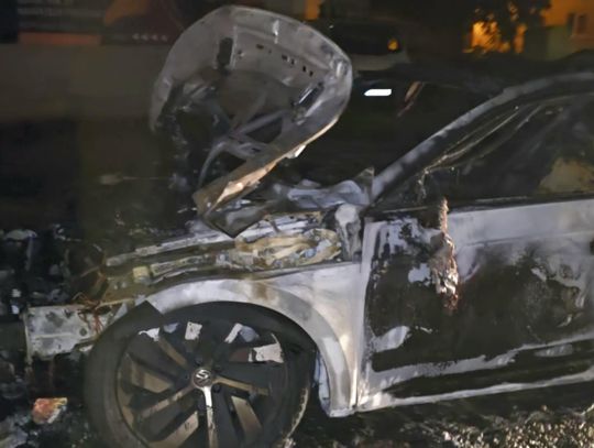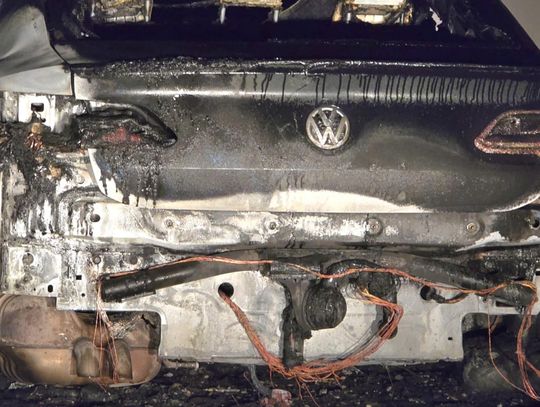 Na miejscu pojawiły się służby — straż pożarna oraz policja. Z auta pozostał jedynie wypalony wrak. Na zdjęciach widać, że spaleniu uległa cała karoseria, koła, a także elementy silnika i wnętrza.