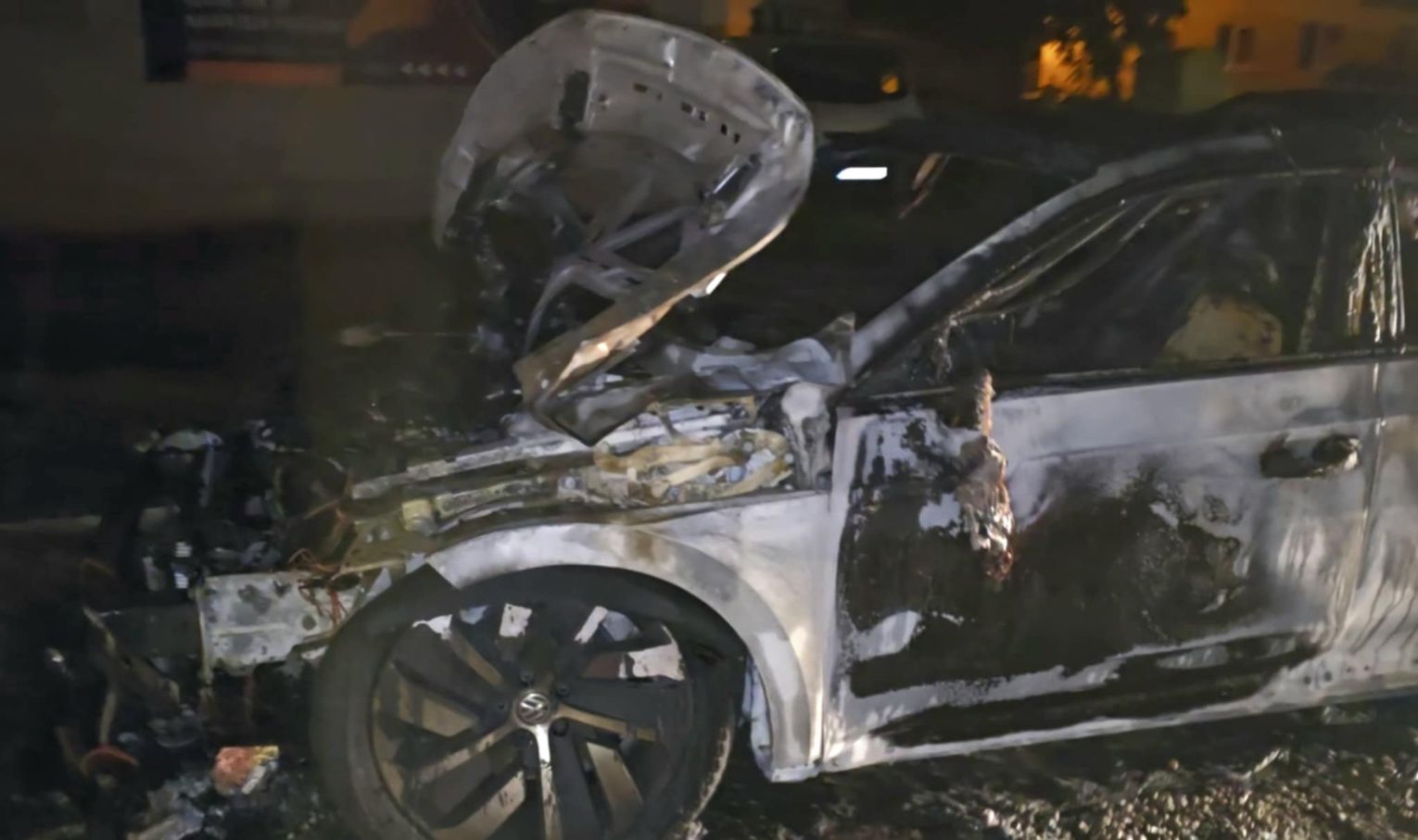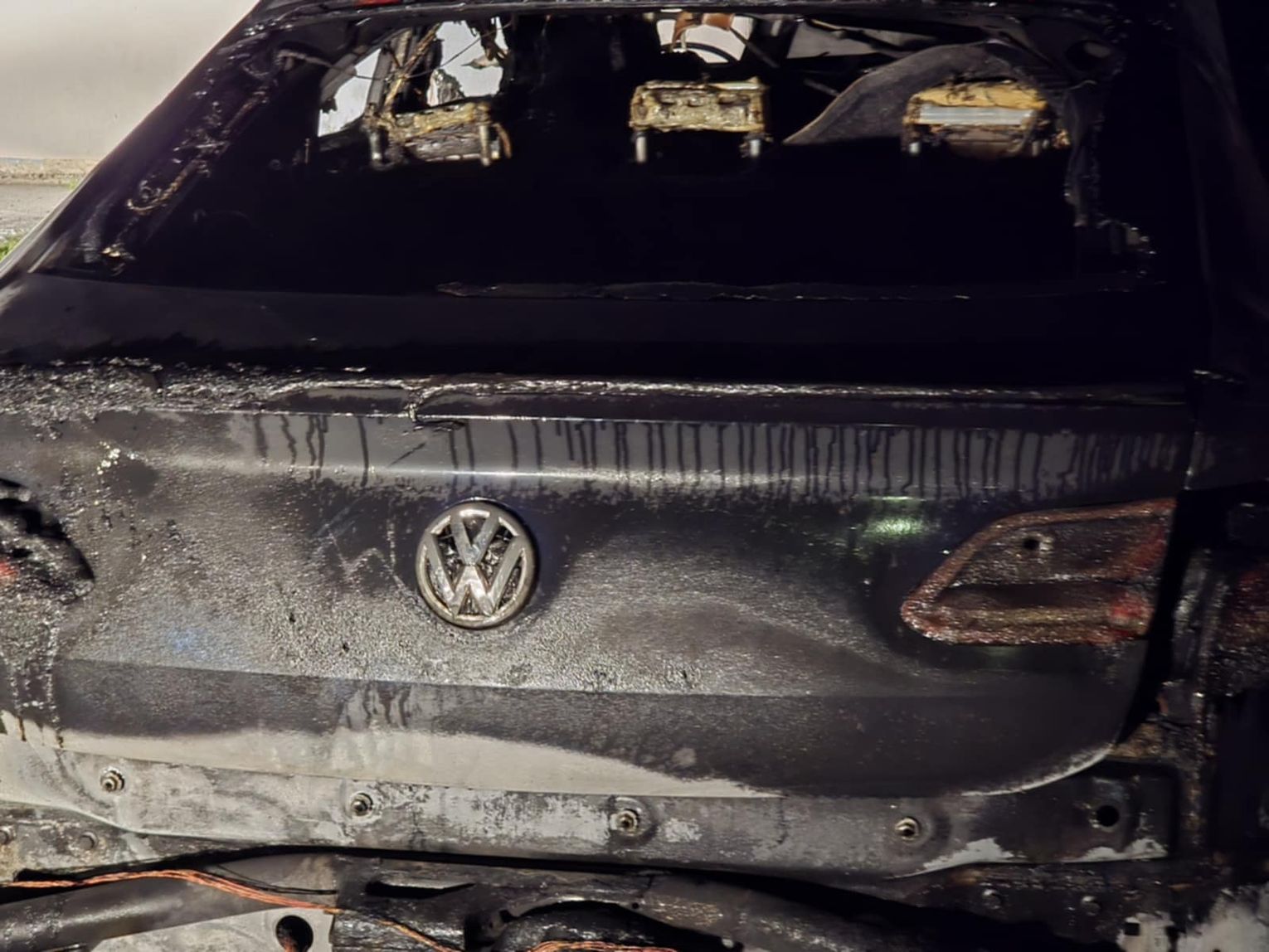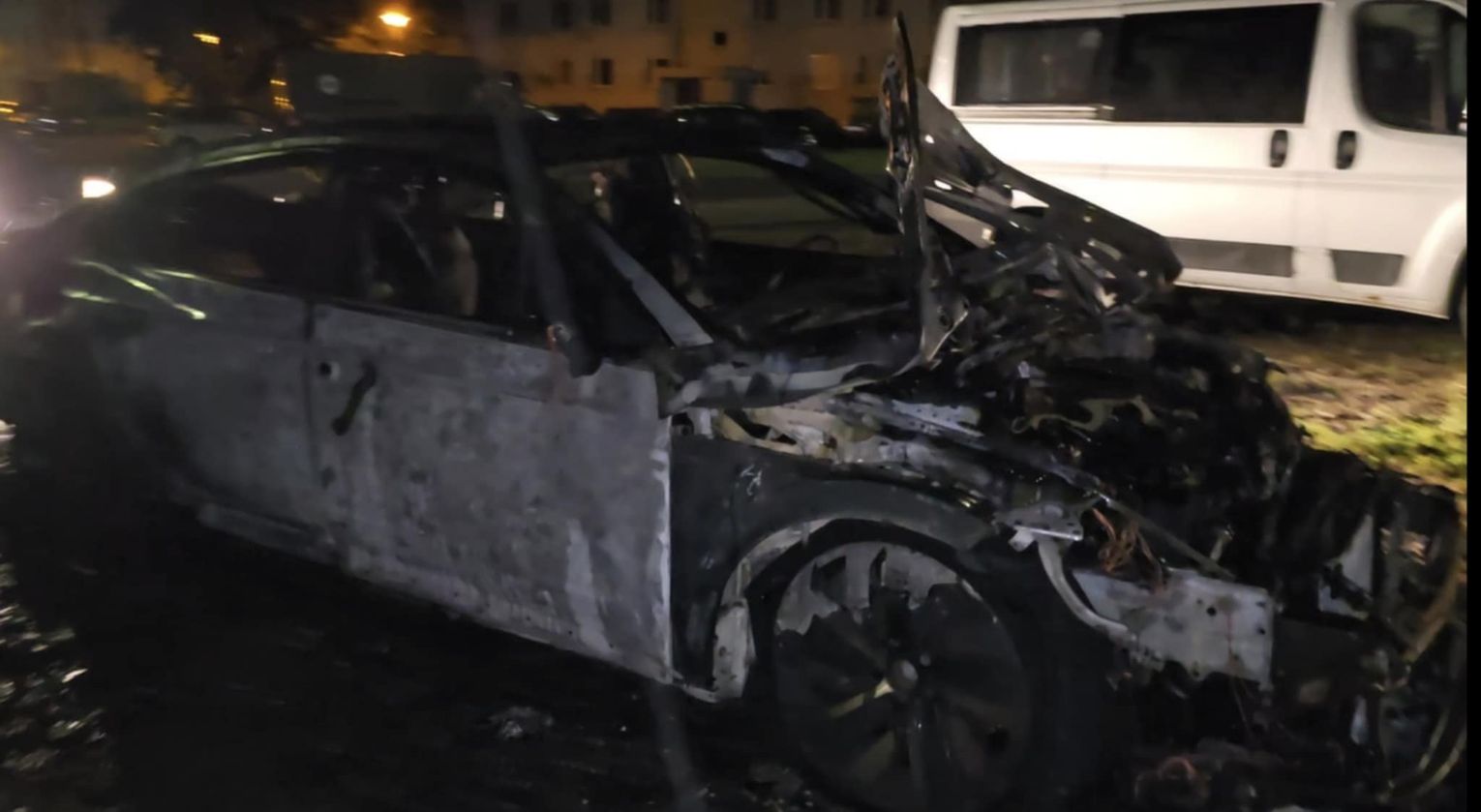 Na miejscu pojawiły się służby — straż pożarna oraz policja. Z auta pozostał jedynie wypalony wrak. Na zdjęciach widać, że spaleniu uległa cała karoseria, koła, a także elementy silnika i wnętrza.