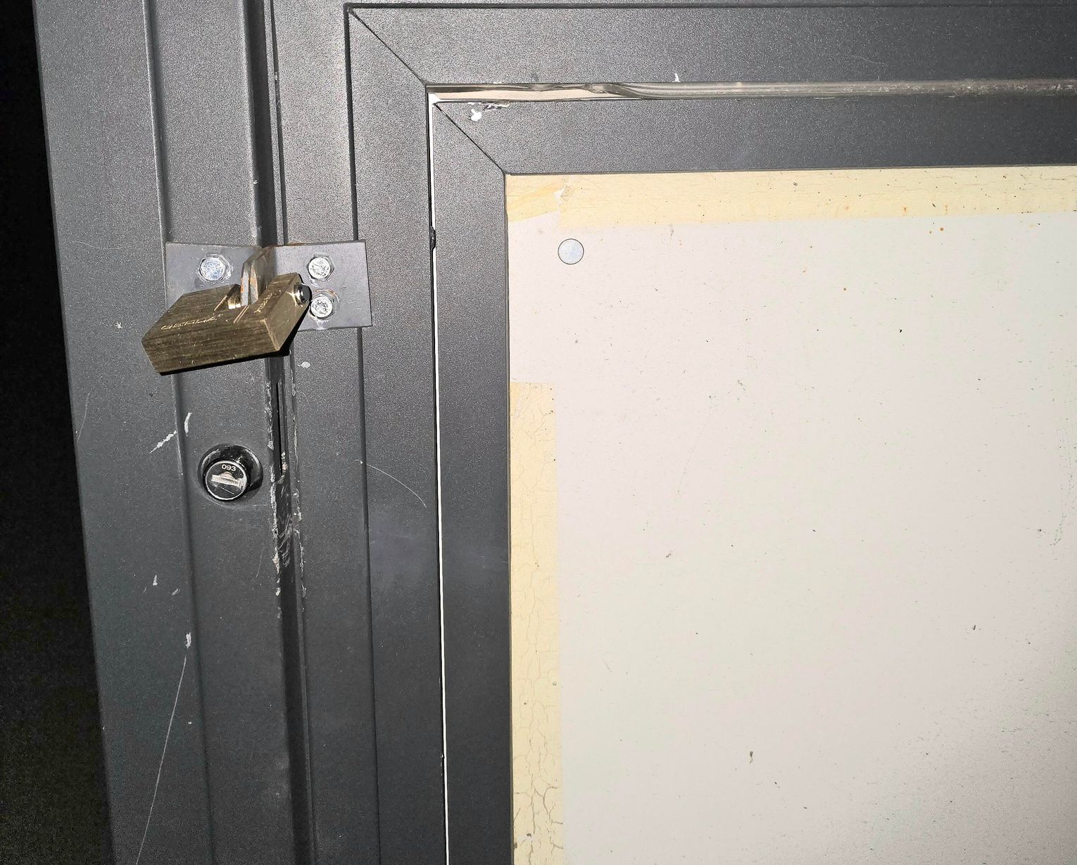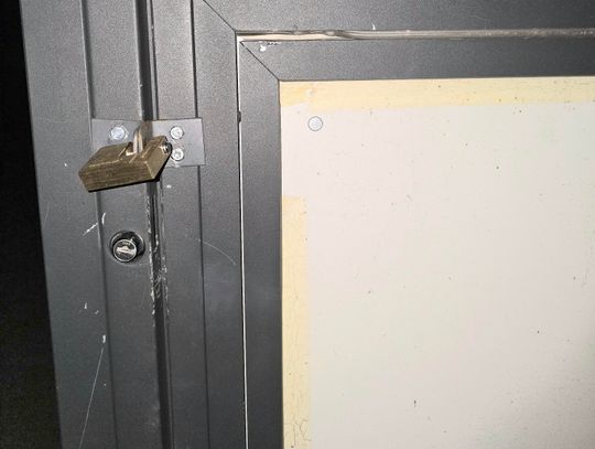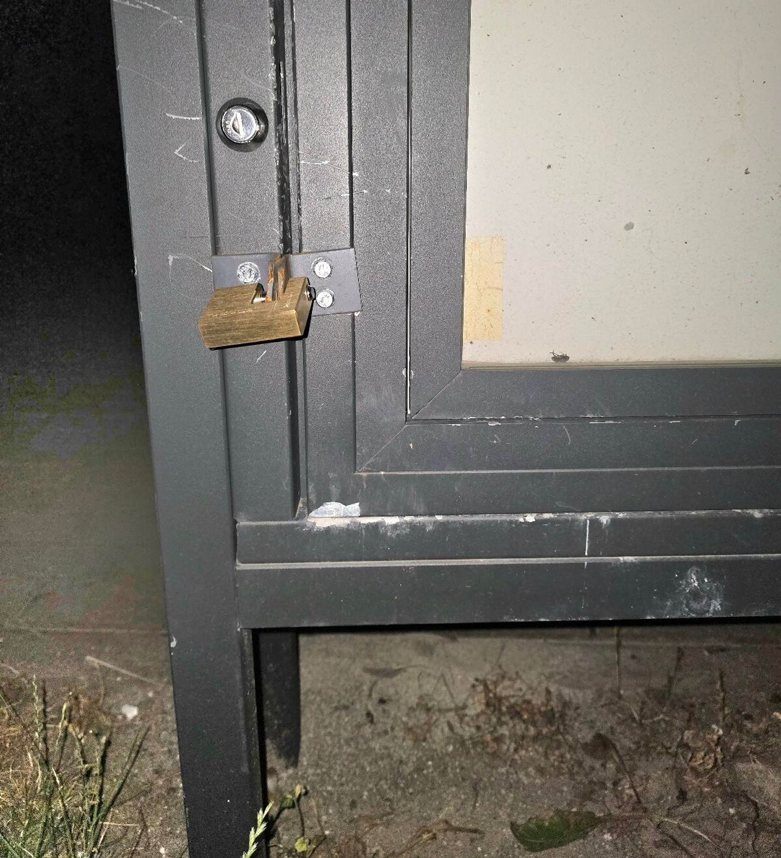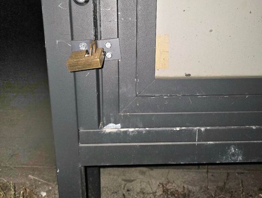 W miejscu przy stacji przeznaczonej do zbiórki drobnych elektroodpadów przy Międzyosiedlowym Basenie Miejskim, gdzie doszło włamania i kradzieży zamontowano nowe kłódki – zarówno u góry, jak i u dołu drzwiczek. Na konstrukcji widoczne są ślady uszkodzeń, zarysowania i wygięcia elementów, które mogą świadczyć o wcześniejszej próbie siłowego otwarcia.