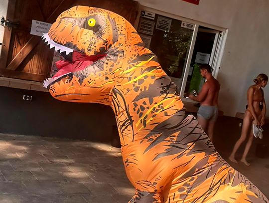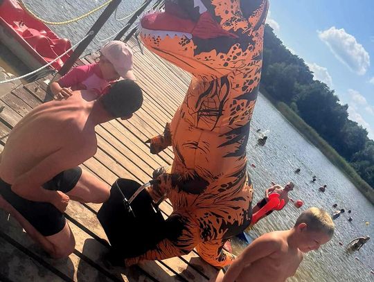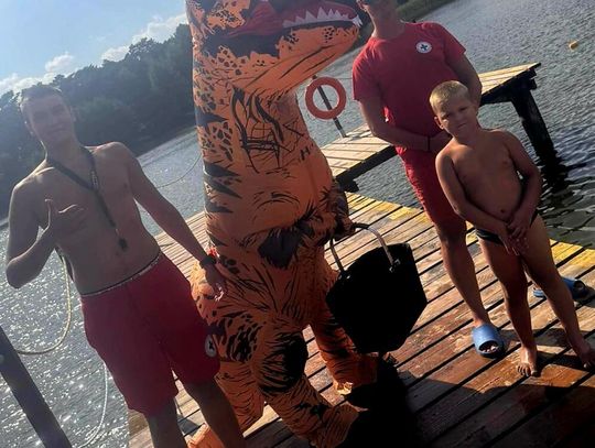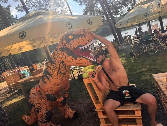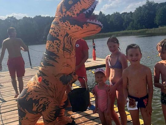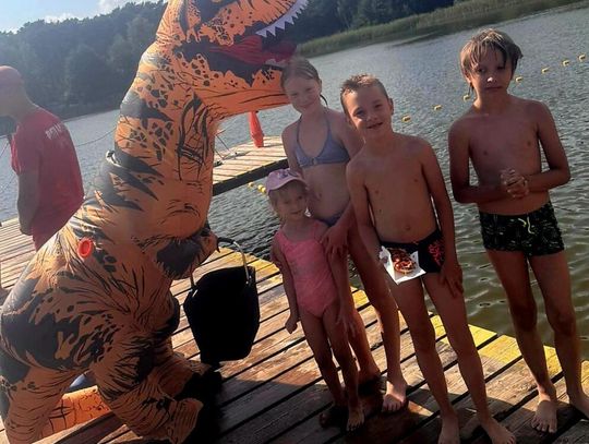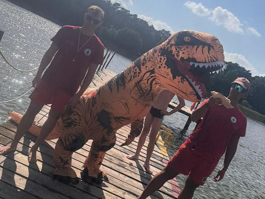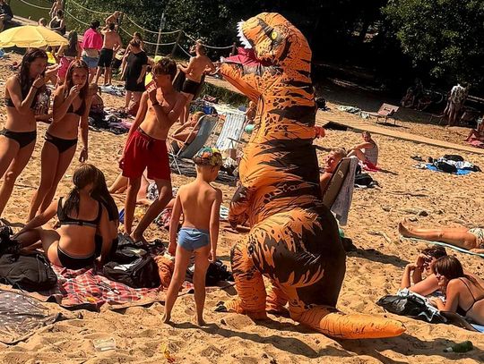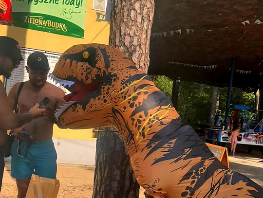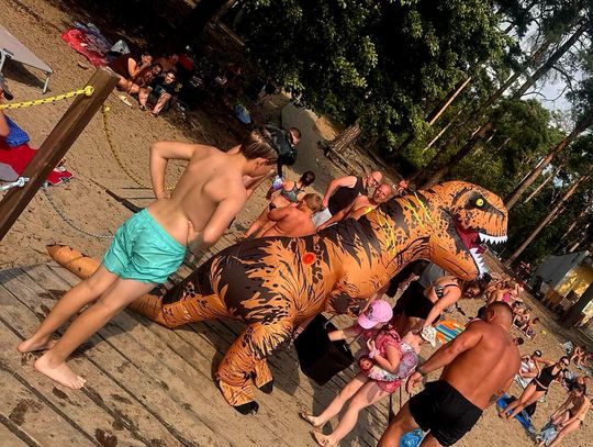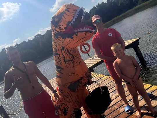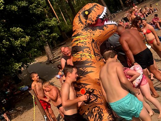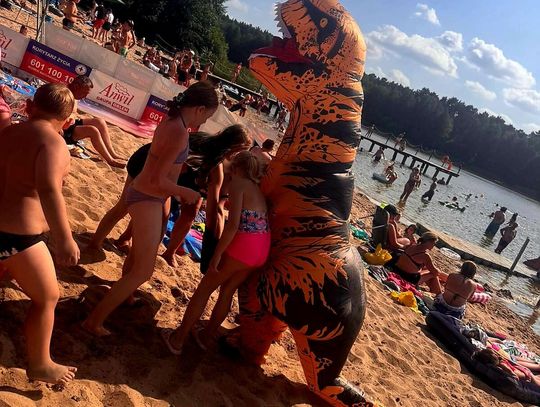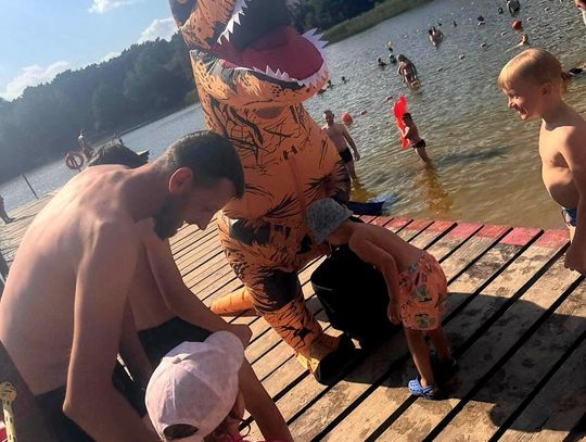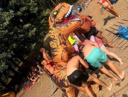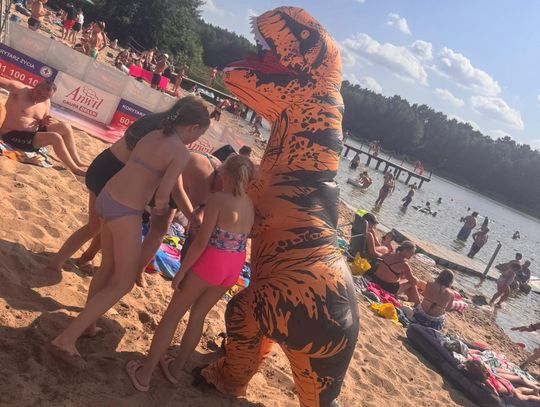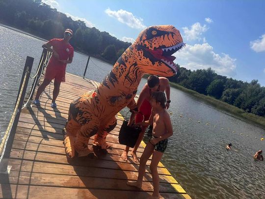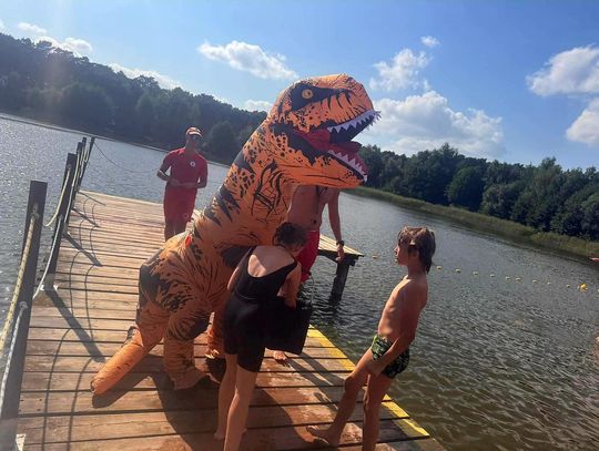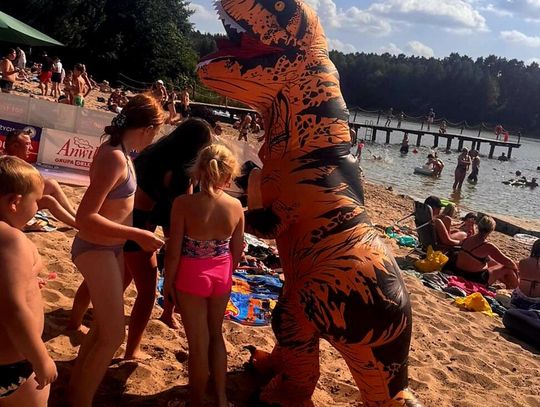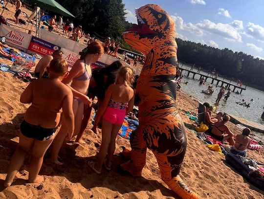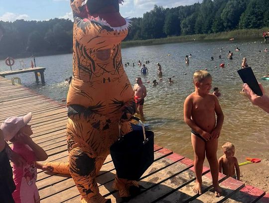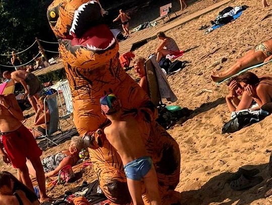Nad Jeziorem Czarnym w ten weekend pojawił się niezwykły gość – ogromny dinozaur. Nietypowa postać spacerowała po plaży, pozowała do zdjęć i rozdawała słodycze najmłodszym.