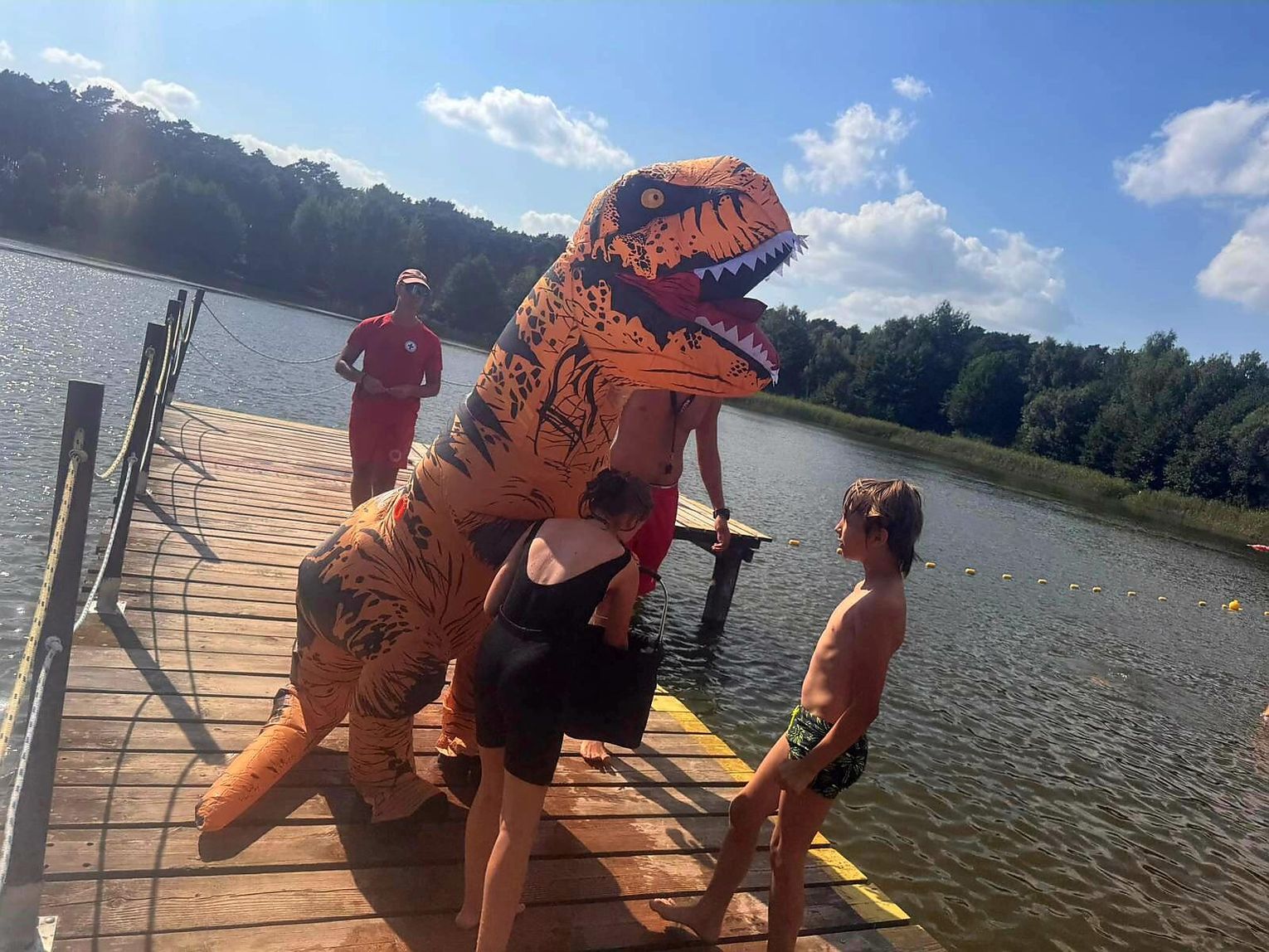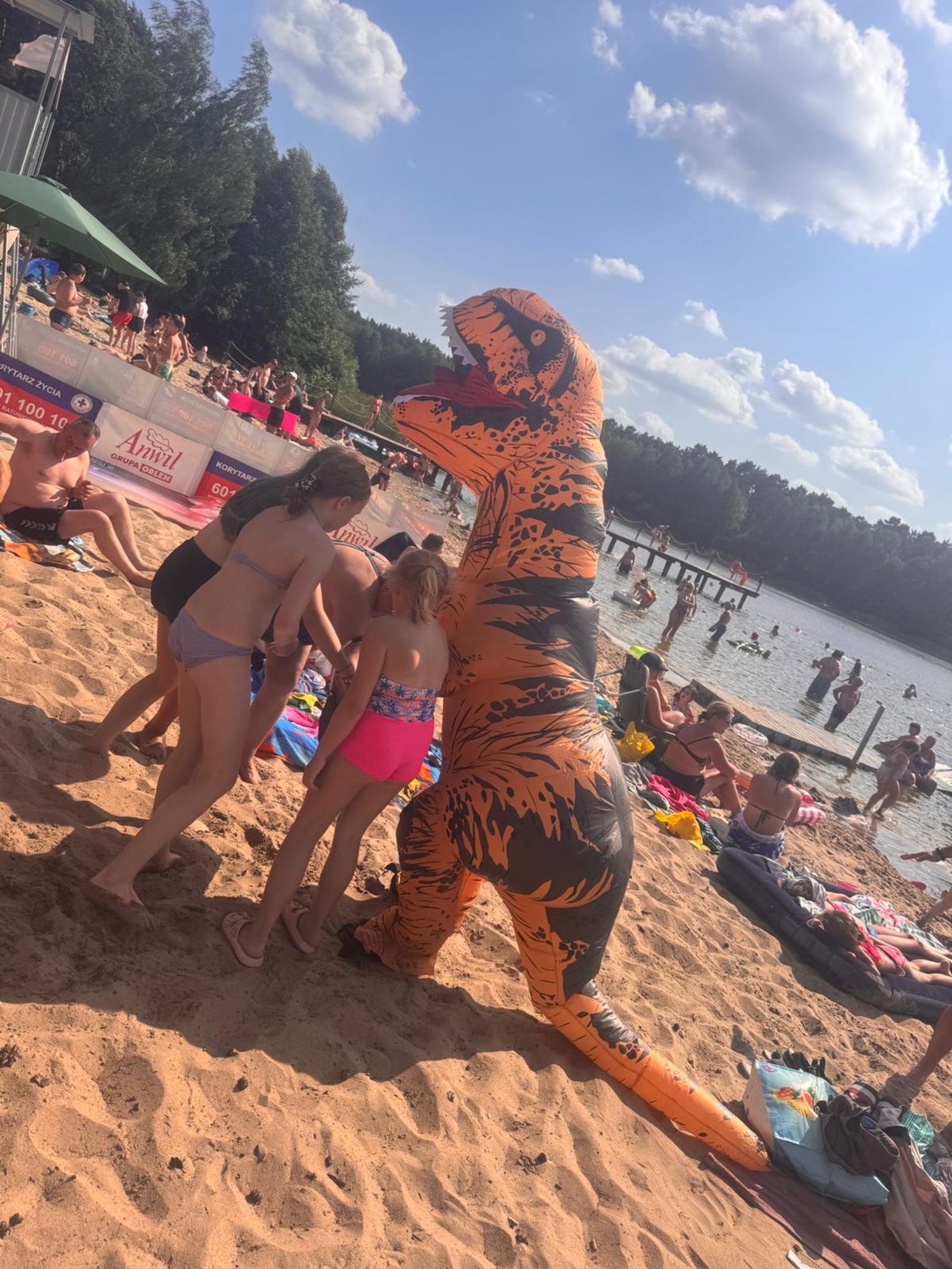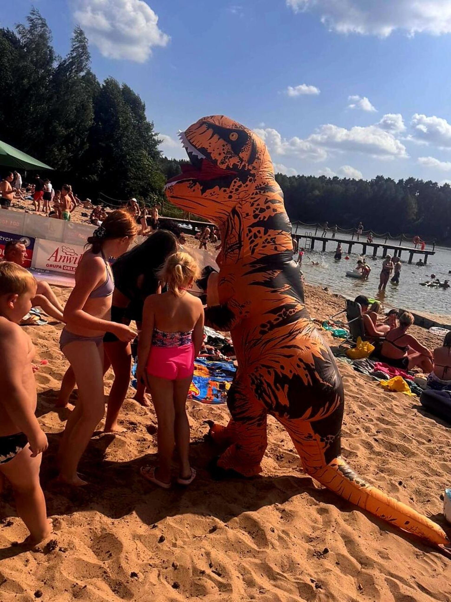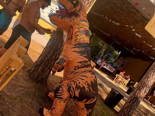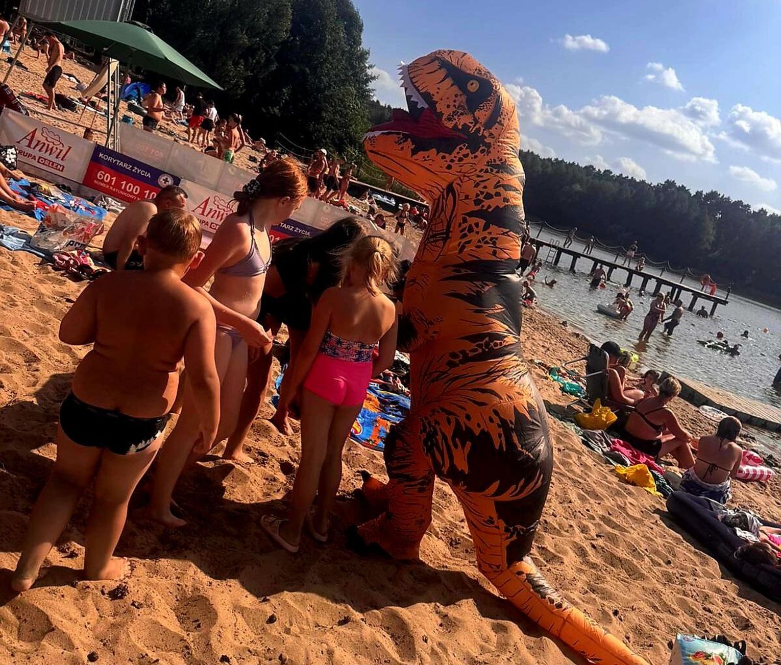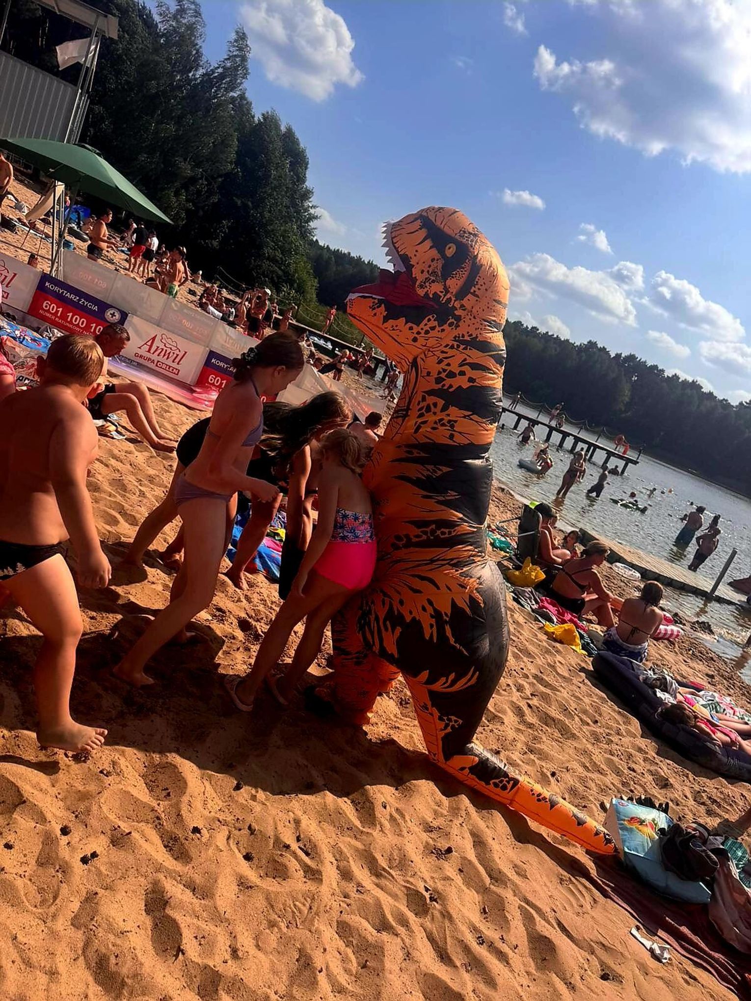 Nad Jeziorem Czarnym w ten weekend pojawił się niezwykły gość – ogromny dinozaur. Nietypowa postać spacerowała po plaży, pozowała do zdjęć i rozdawała słodycze najmłodszym.