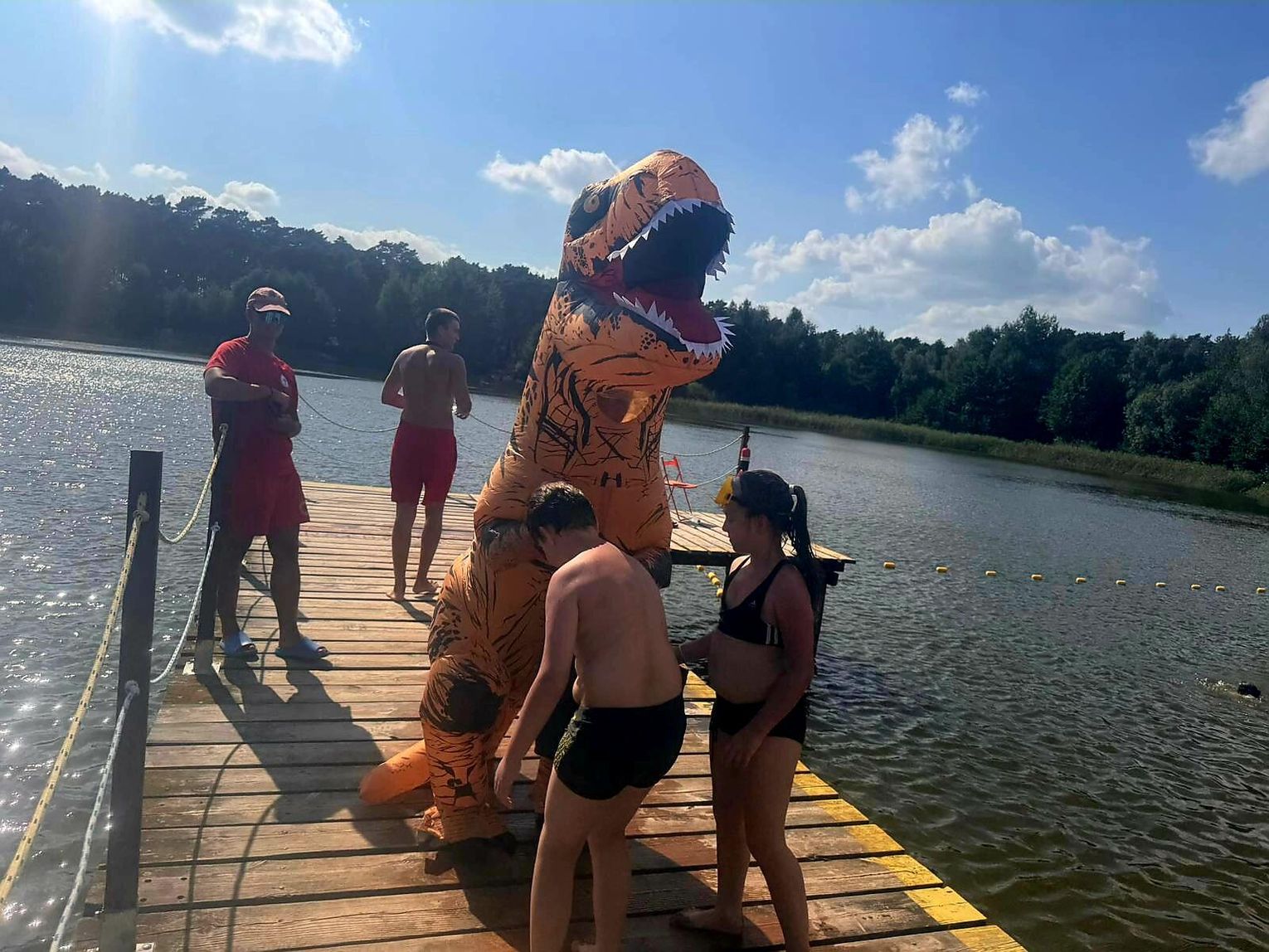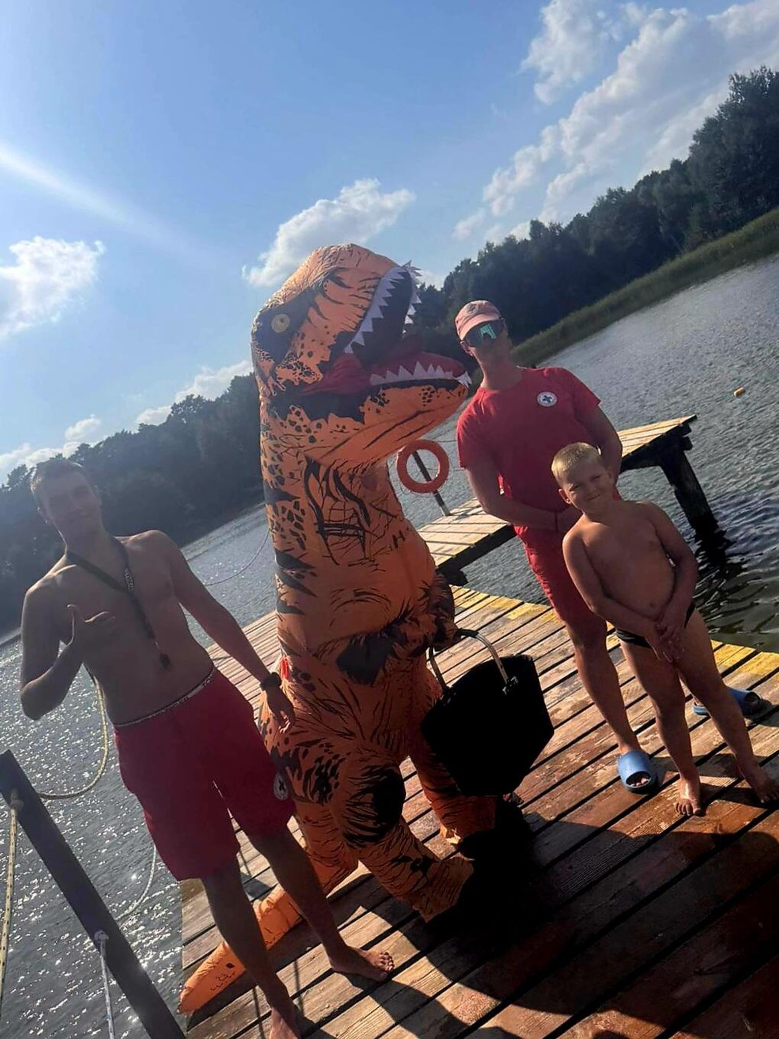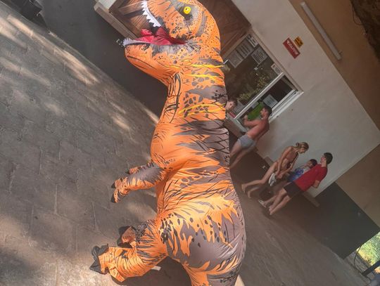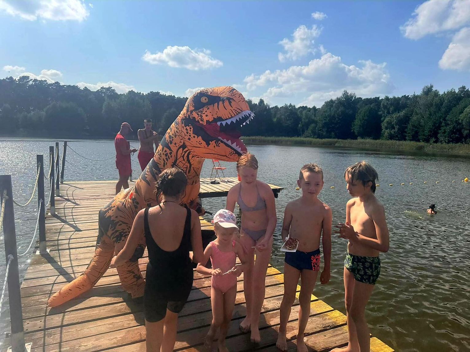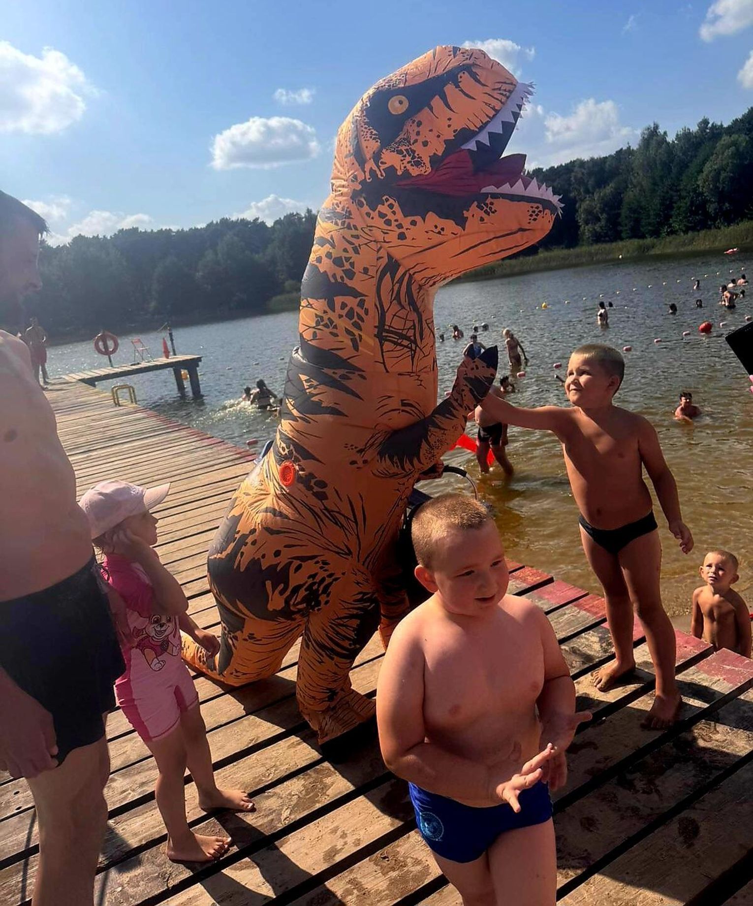 Nad Jeziorem Czarnym w ten weekend pojawił się niezwykły gość – ogromny dinozaur. Nietypowa postać spacerowała po plaży, pozowała do zdjęć i rozdawała słodycze najmłodszym.