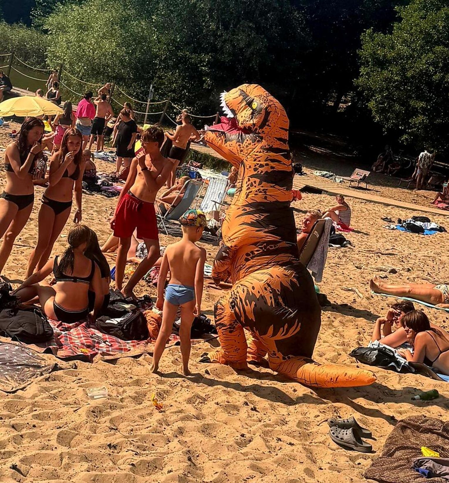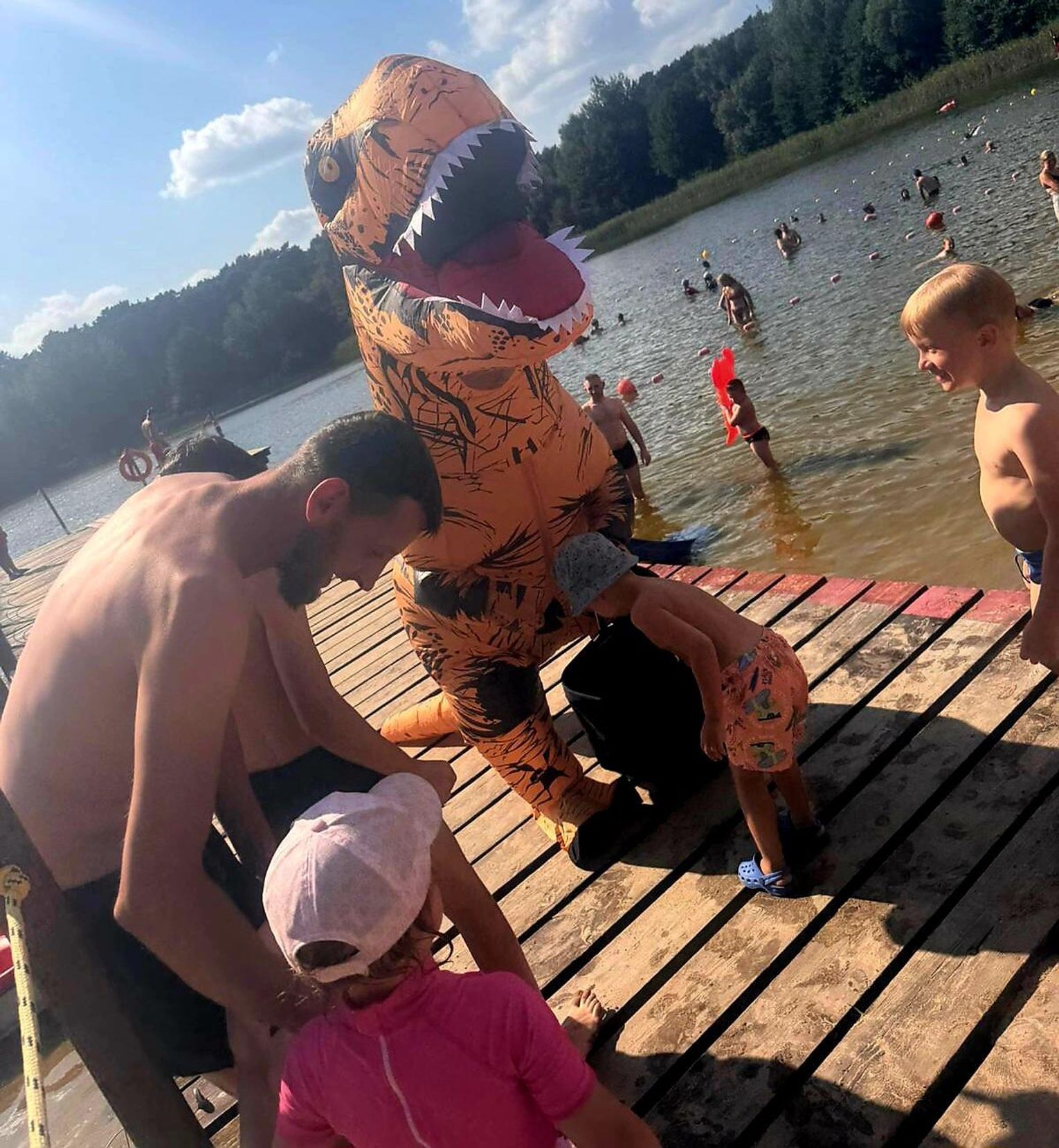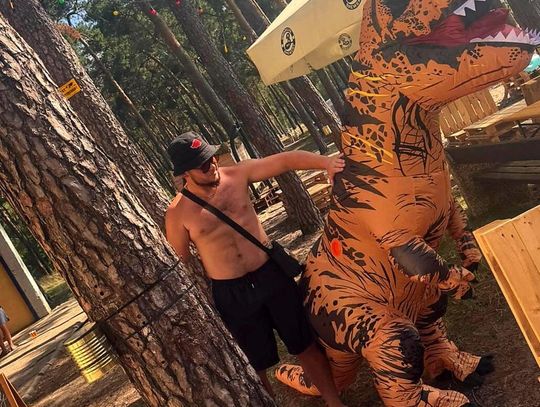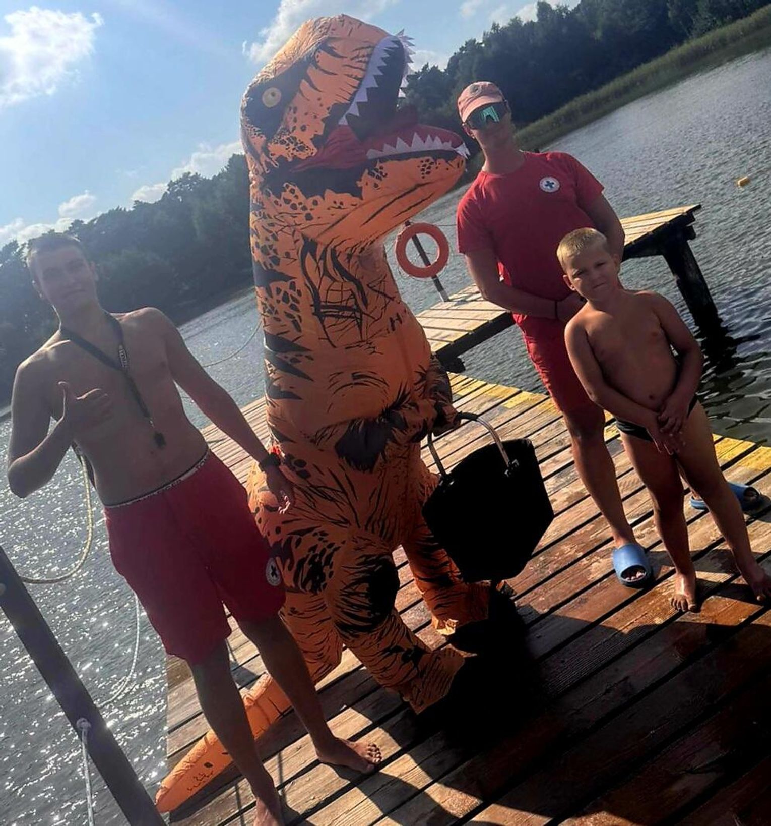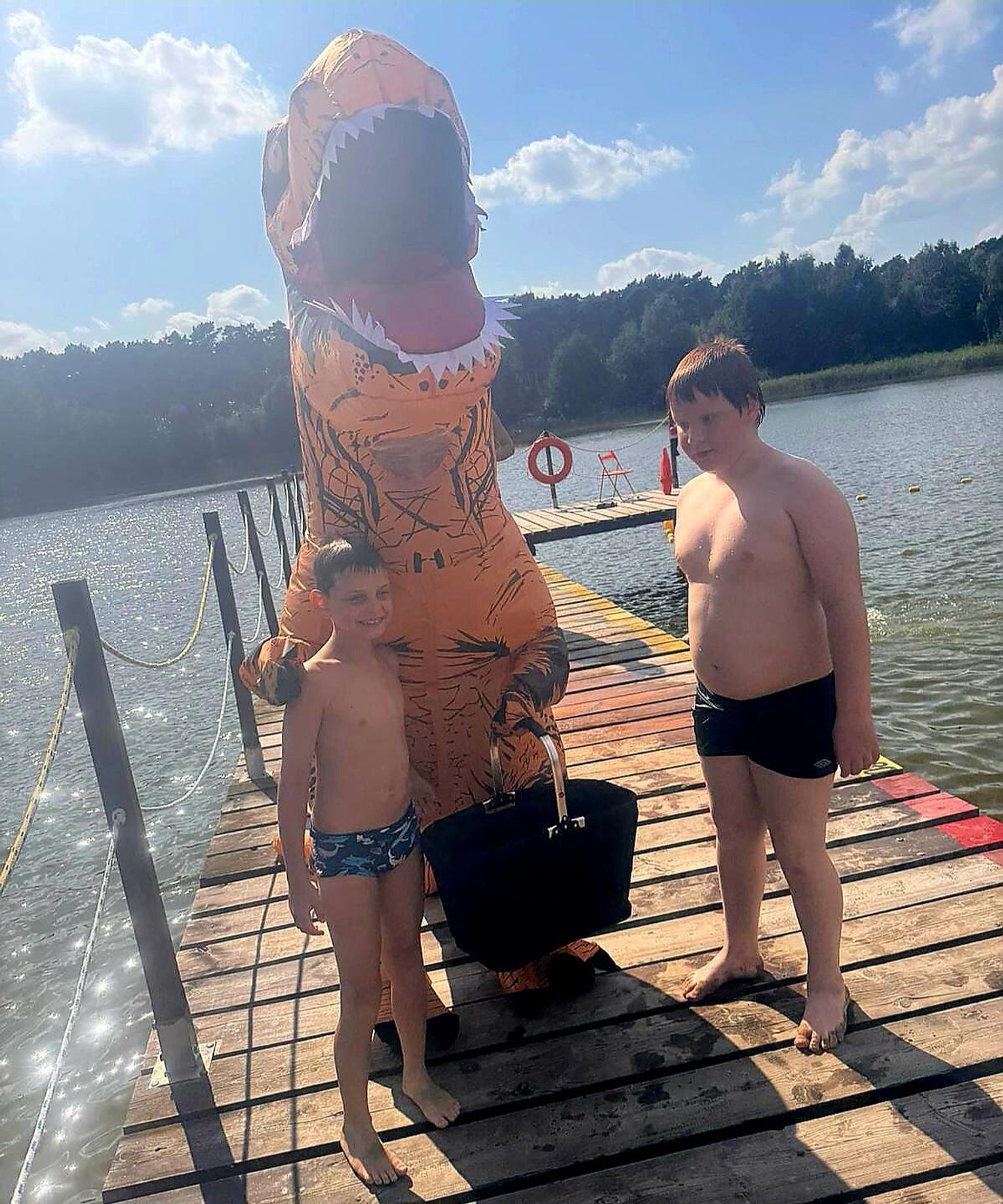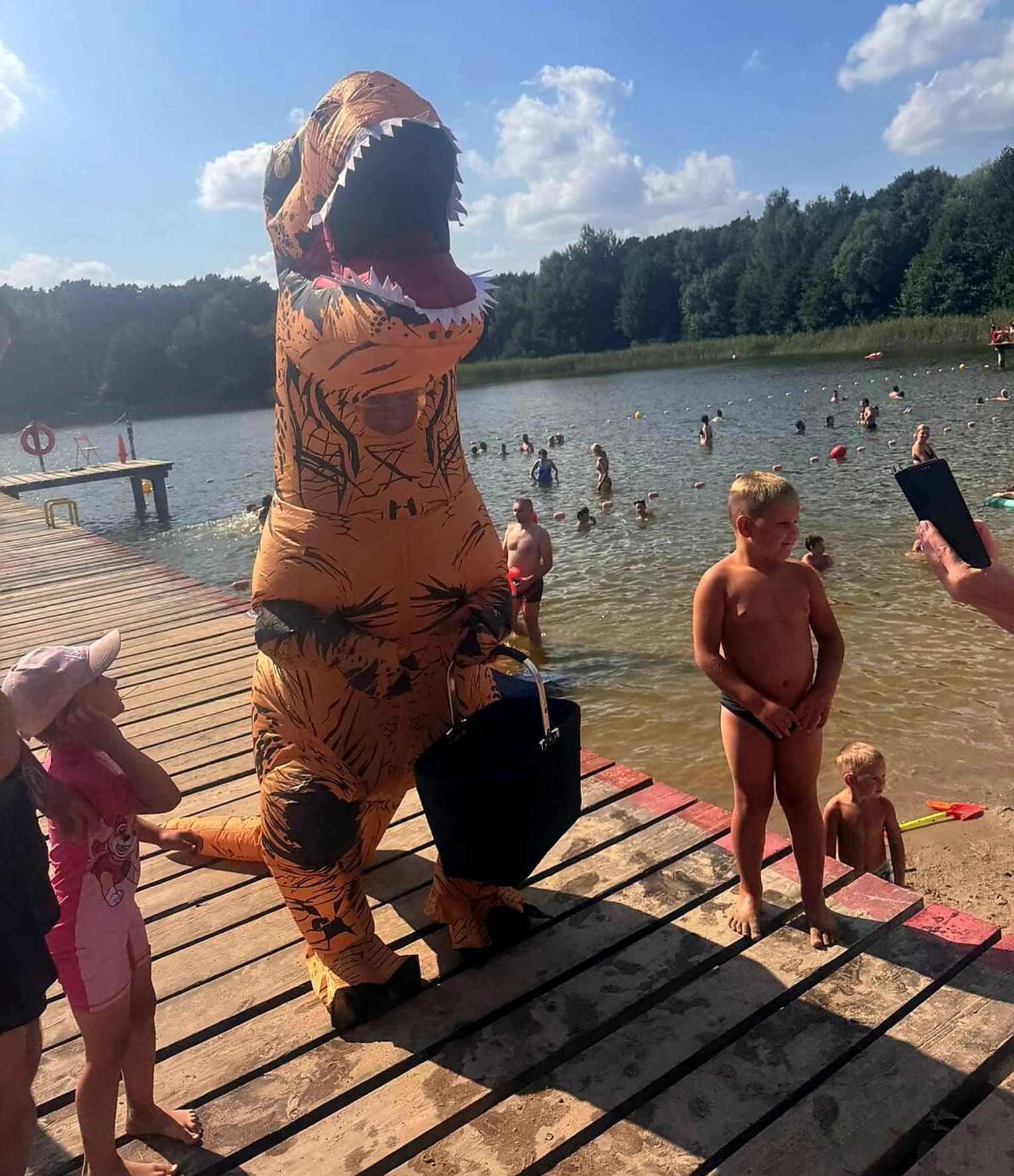 Nad Jeziorem Czarnym w ten weekend pojawił się niezwykły gość – ogromny dinozaur. Nietypowa postać spacerowała po plaży, pozowała do zdjęć i rozdawała słodycze najmłodszym.