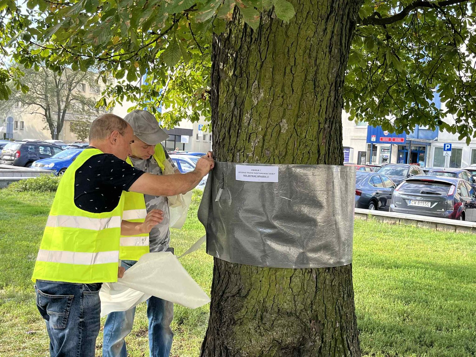 Jak wyjaśnił, do pni drzew mocowane będą specjalne feromony, które przyciągają owady. Następnie wokół pnia owijana jest taśma pokryta klejem – szkodniki, próbując się przedostać, przyklejają się do niej i giną. Na taśmach znajdą się informacje, że drzewo jest w trakcie leczenia i nie należy niszczyć zabezpieczeń.