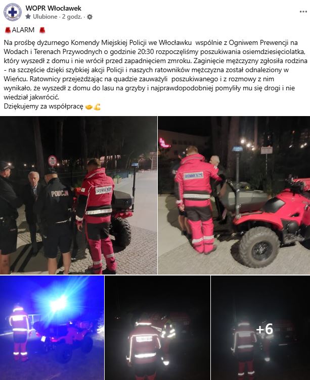 Na prośbę dyżurnego Komendy Miejskiej Policji we Włocławku w działaniach uczestniczyli policjanci oraz ratownicy z Ogniwa Prewencji na Wodach i Terenach Przywodnych. Dzięki szybkiej akcji poszukiwawczej mężczyzna został odnaleziony w Wieńcu. Ratownicy, przejeżdżając na quadzie, zauważyli poszukiwanego. Jak wynikało z rozmowy, senior wybrał się do lasu na grzyby, jednak pomylił drogi i nie potrafił wrócić do domu.