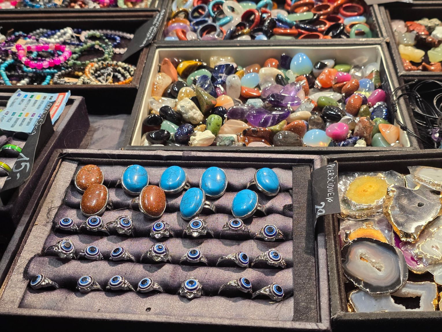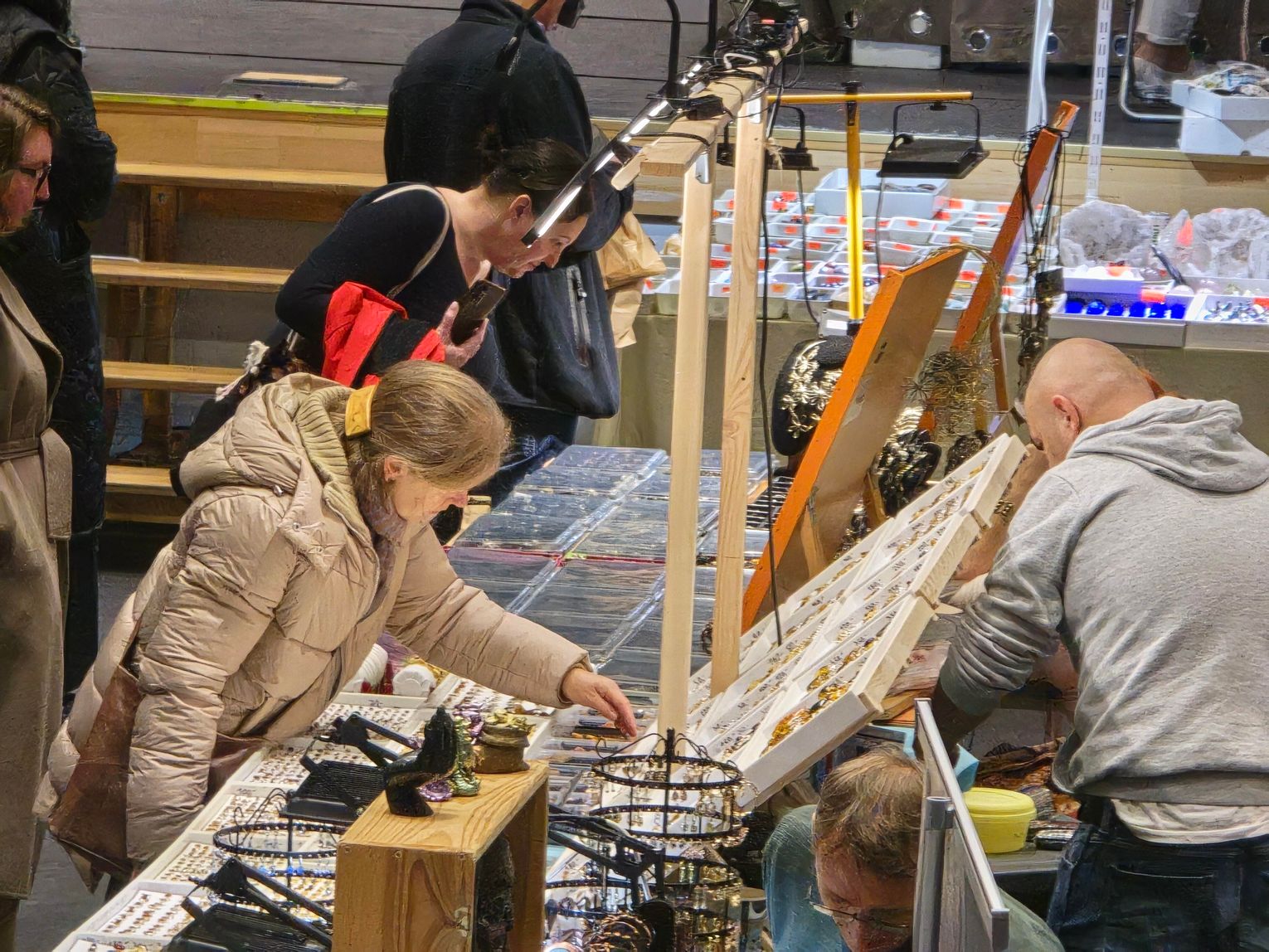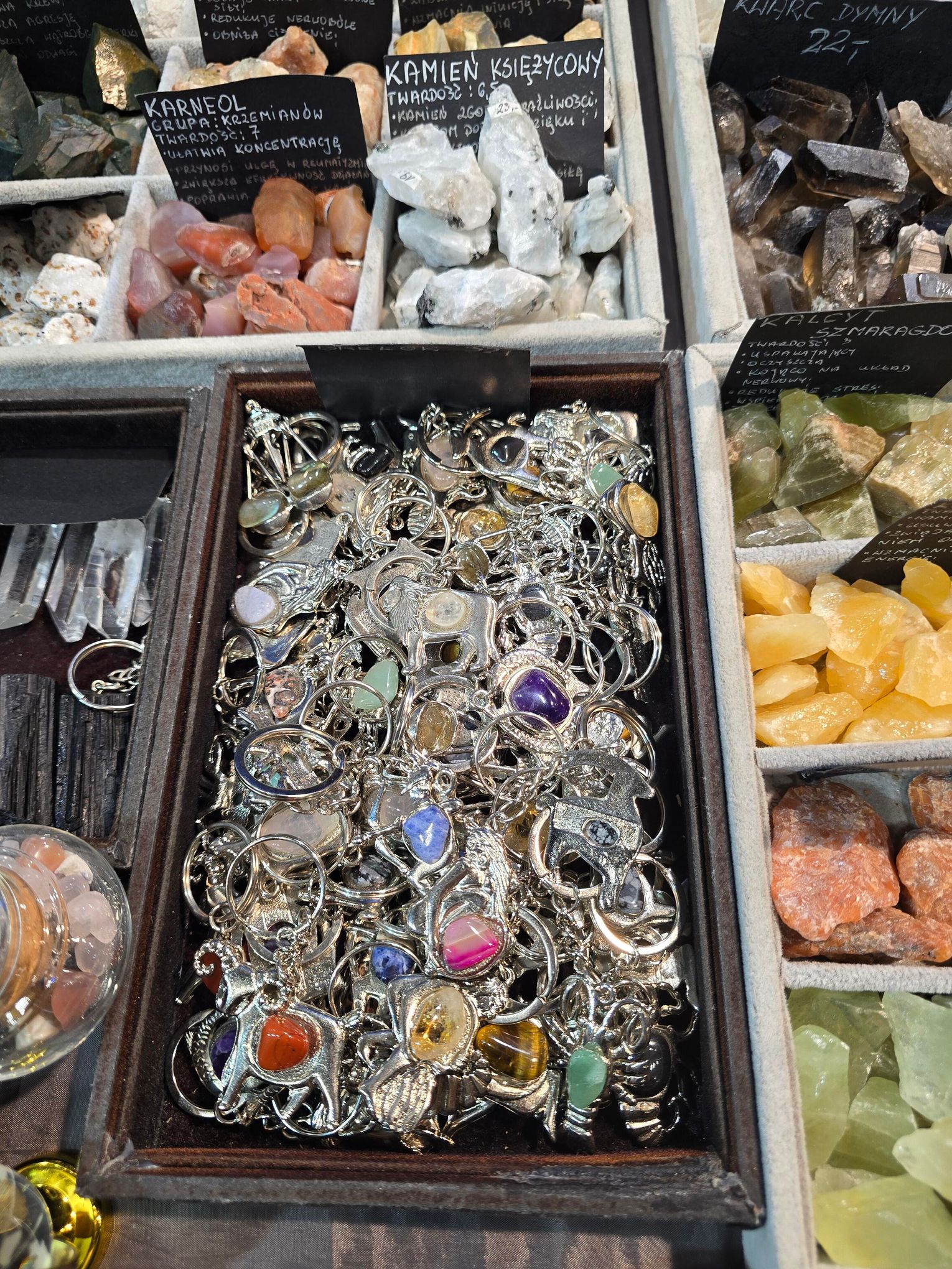 W części poświęconej ezoteryce można znaleźć kadzidła, amulety, książki i naturalne produkty zdrowotne. Z kolei stoiska z minerałami i skamieniałościami przyciągają uwagę bogactwem kolorów i form – od drobnych kamieni ozdobnych po duże, kolekcjonerskie okazy. Nie brakuje też biżuterii z kamieni naturalnych.