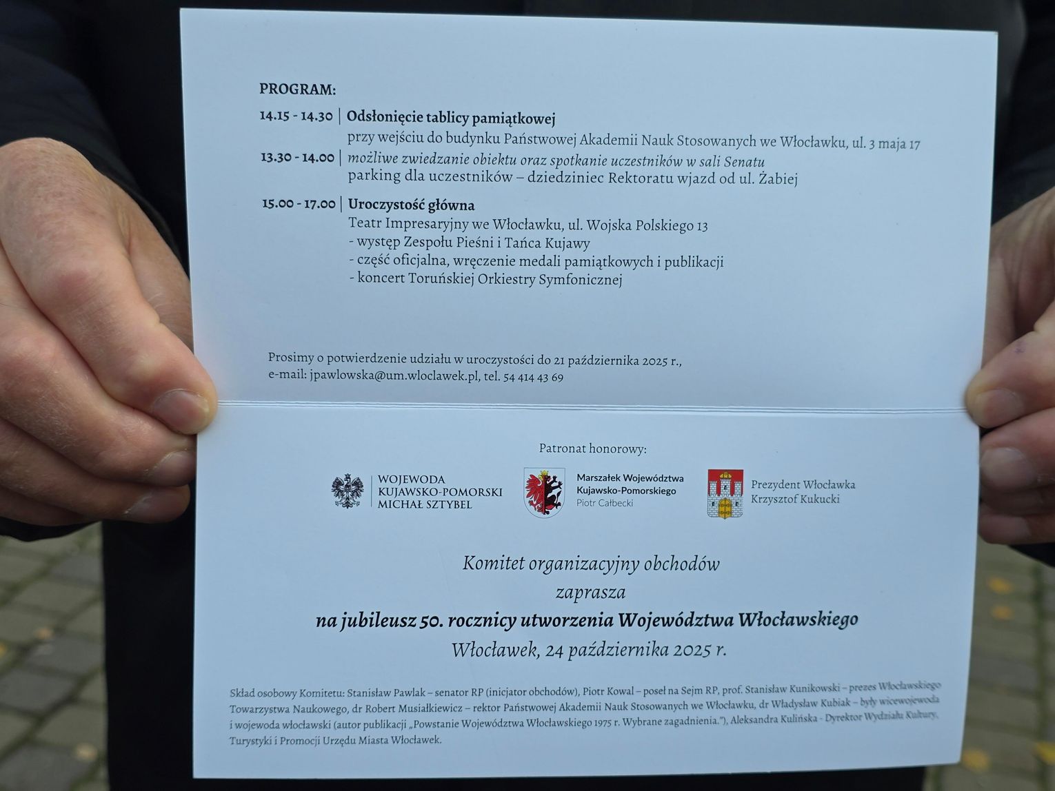 – „Komitet organizacyjny, któremu mam zaszczyt przewodniczyć, postanowił, że 24 października o godzinie 14:00 na budynku przy ul. 3 Maja 17, gdzie dziś mieści się rektorat Państwowej Akademii Nauk Stosowanych, odsłonimy tablicę upamiętniającą województwo włocławskie” – zapowiedział.