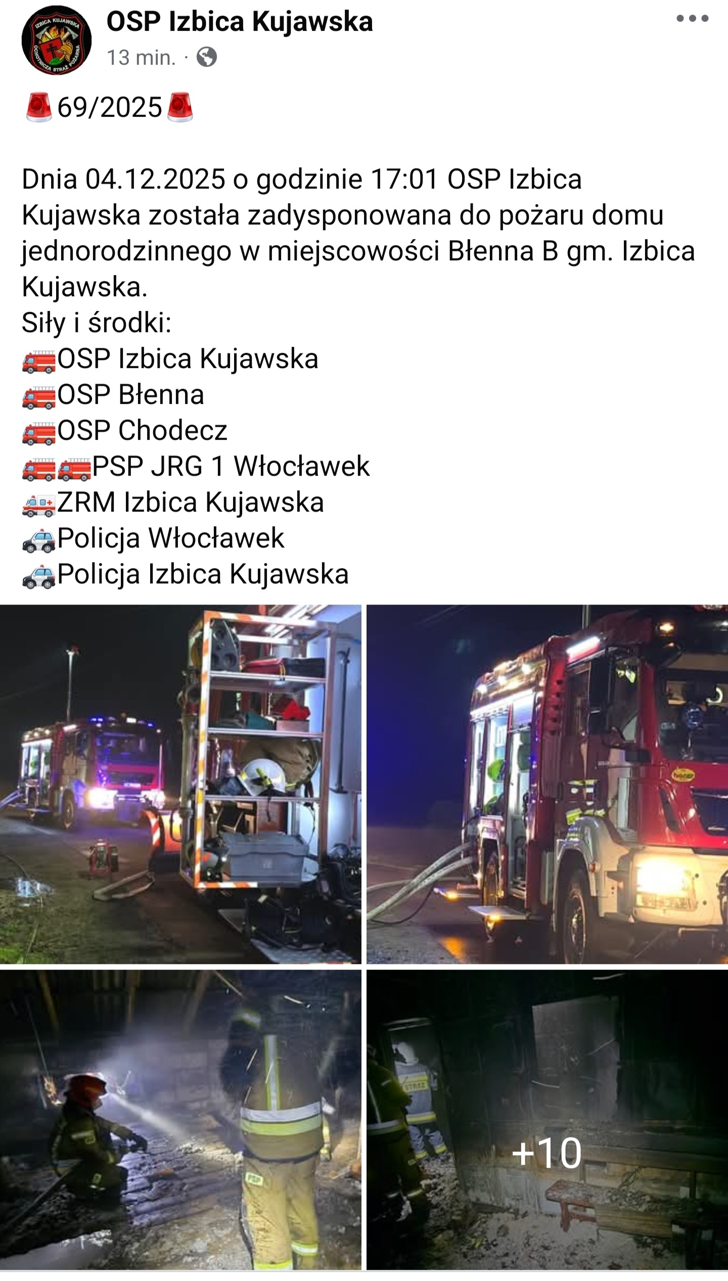 Dziś tj. w czwartek po godzinie 17:00 służby ratunkowe zostały zadysponowane do pożaru domu jednorodzinnego w miejscowości Błenna B w gminie Izbica Kujawska. O zdarzeniu poinformowała jednostka OSP Izbica Kujawska. Według wstępnych ustaleń ogień objął wnętrze budynku, powodując poważne zniszczenia. Akcja toczyła się po zmroku, w silnym zadymieniu, co dodatkowo utrudniało pracę strażaków. W działaniach uczestniczyły: