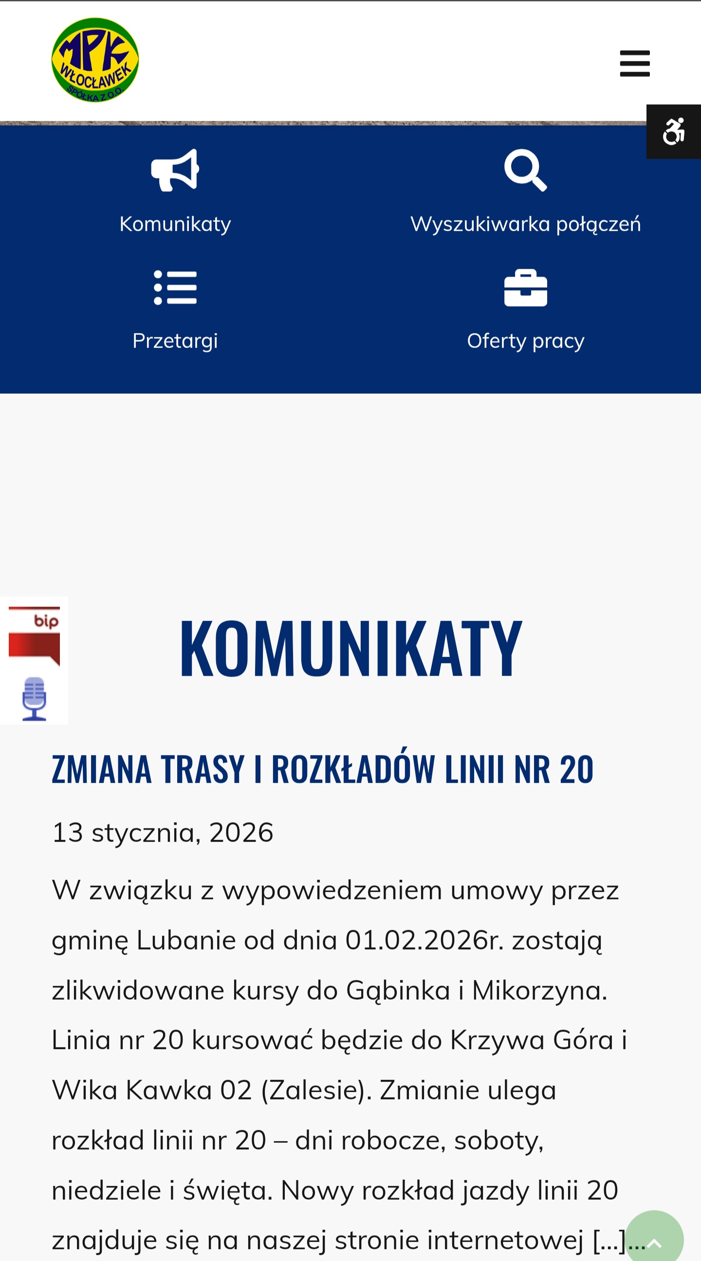 W związku z wypowiedzeniem umowy przez gminę Lubanie od dnia 01.02.2026r. zostają zlikwidowane kursy do Gąbinka i Mikorzyna. Linia nr 20 kursować będzie do Krzywa Góra i Wika Kawka 02 (Zalesie). Zmianie ulega rozkład linii nr 20 – dni robocze, soboty, niedziele i święta. Nowy rozkład jazdy linii 20 znajduje się na naszej stronie internetowej www.mpk.com.pl