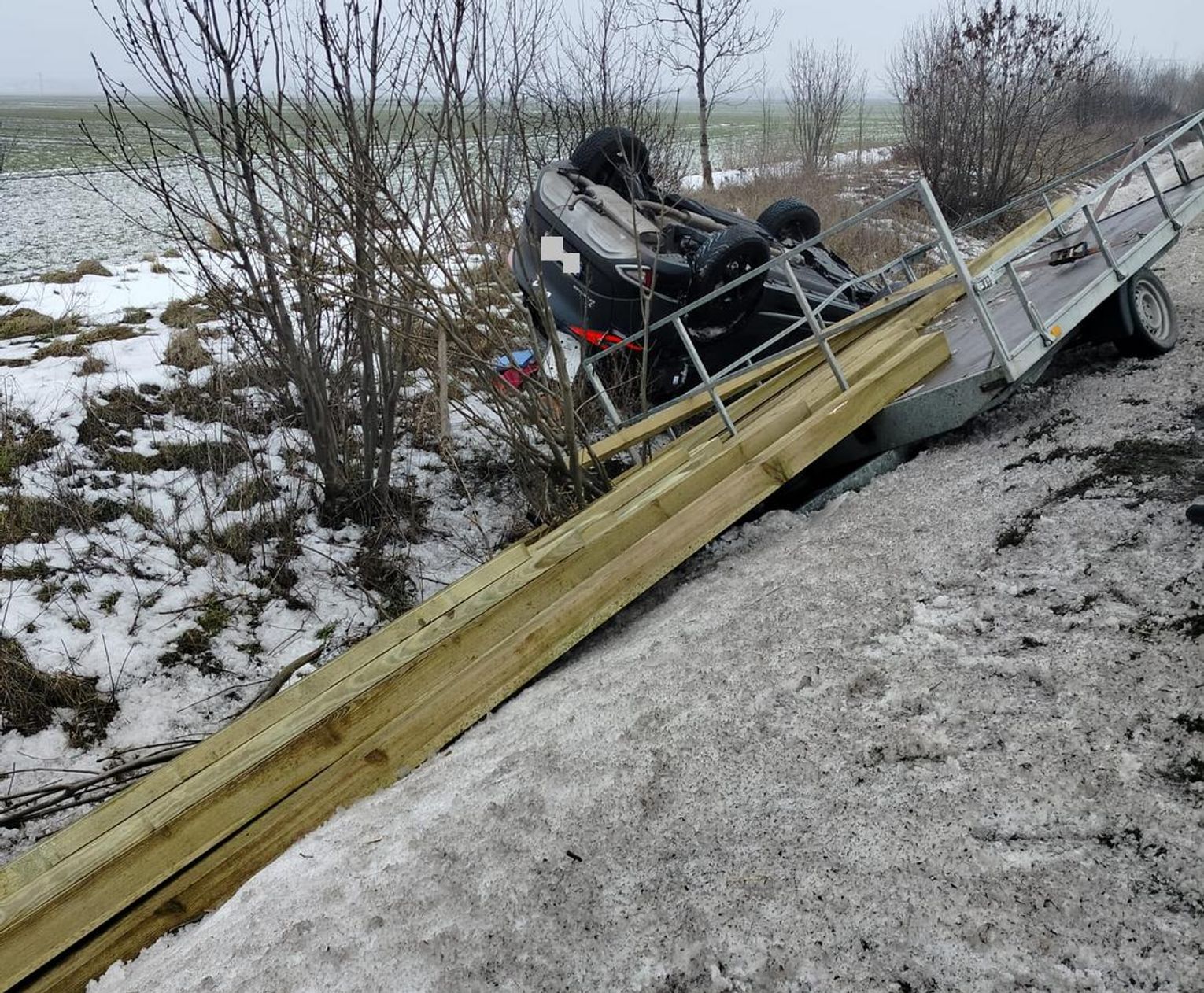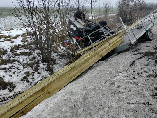 Do obydwu kolizji doszło w piątek (16.01.26r.). Pierwsza o godz. 11:40 w Jarantowicach na drodze krajowej nr 62. Jak ustalili policjanci, kierujący Kią z przyczepką, nie zapanował nad autem i zjechał do rowu. Tam samochód przewrócił się na dach, a przewożony materiał wypadł z przyczepy. Siedzący za kierownicą 51-latek był trzeźwy i nie odniósł żadnych obrażeń.