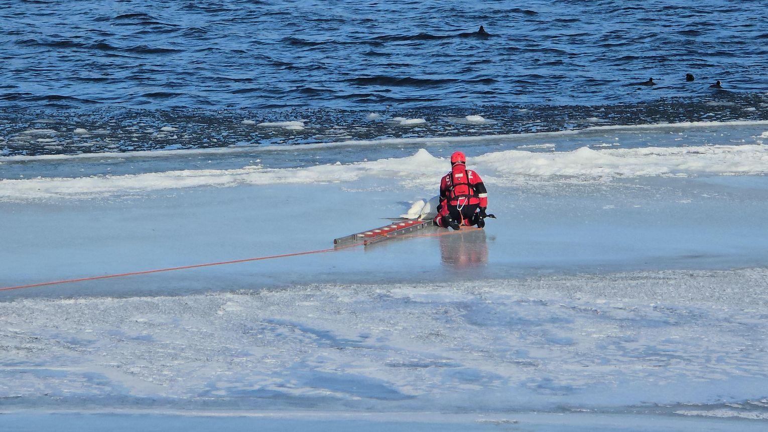 Strażacy bez konieczności używania sprzętu dotarli pod pierwszy filar mostu. W tym miejscu, z uwagi na niski stan Wisły, możliwe było bezpieczne przejście po gruncie. Przy filarze, podjęto akcję przy użyciu liny, drabiny oraz specjalistycznego sprzętu, Jeden ze strażaków dostał się bezpośrednio do łabędzia i podjął próbę jego uwolnienia. Po dotarciu na miejsce ustalono, że łabędź nie był przymarznięty do lodu. Zwierzę było jednak wyraźnie wycieńczone i osłabione, co mogło sprawiać wrażenie, że jest uwięzione.