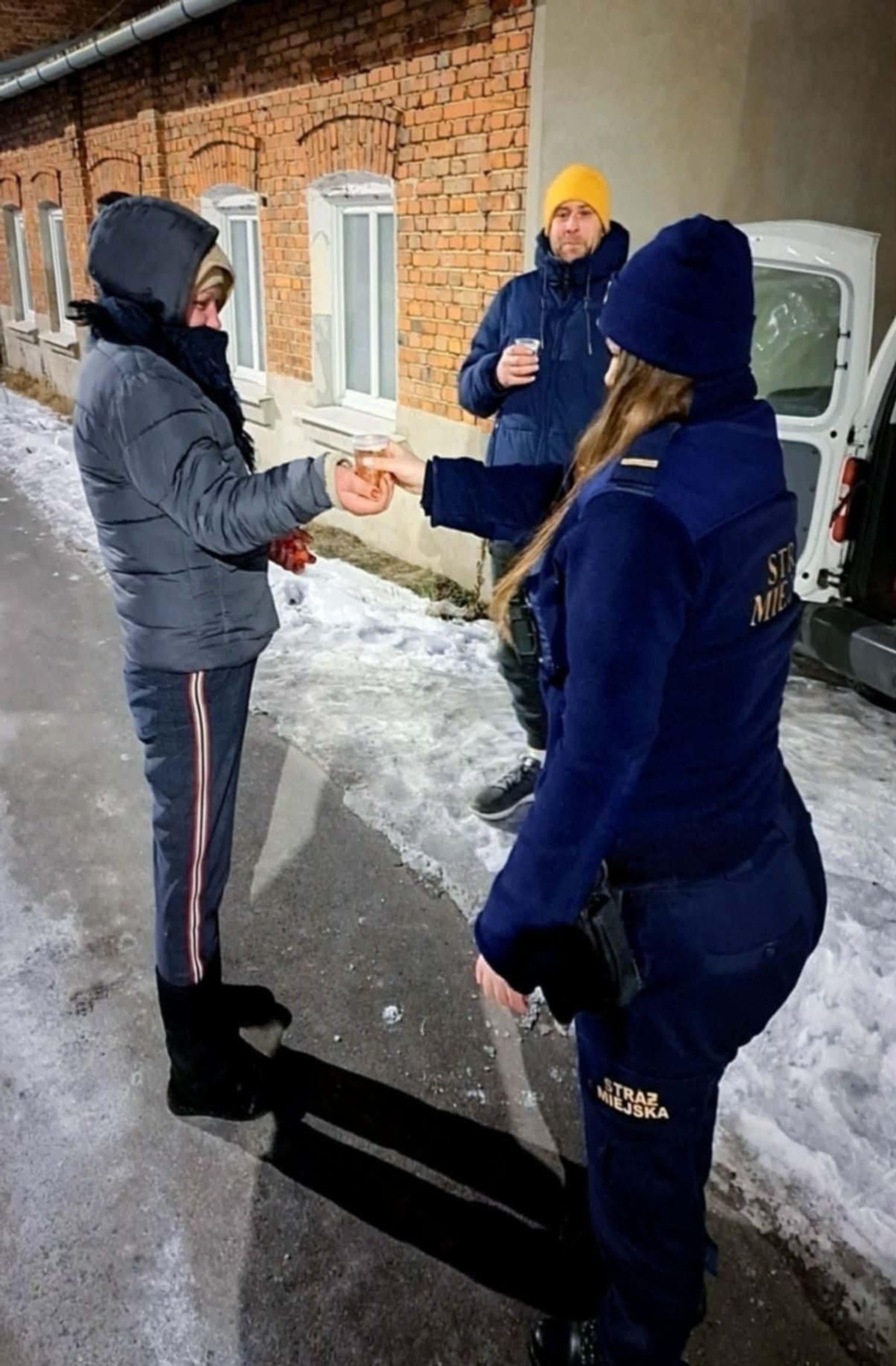 Strażnicy miejscy mieli ze sobą termos z gorącą herbatą, przekazaną przez jadłodzielnię. Napój był rozdawany wszystkim potrzebującym, którzy wyrazili chęć jego przyjęcia. Podczas patrolu spotkaliśmy dwie osoby bezdomne, które napotkaliśmy pod mostem stalowym. Obie skorzystały z gorącej herbaty. Strażnicy miejscy wożą także ze sobą śpiwory na wypadek gdyby ktoś w kryzysie bezdomności chciał z nich skorzystać.