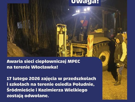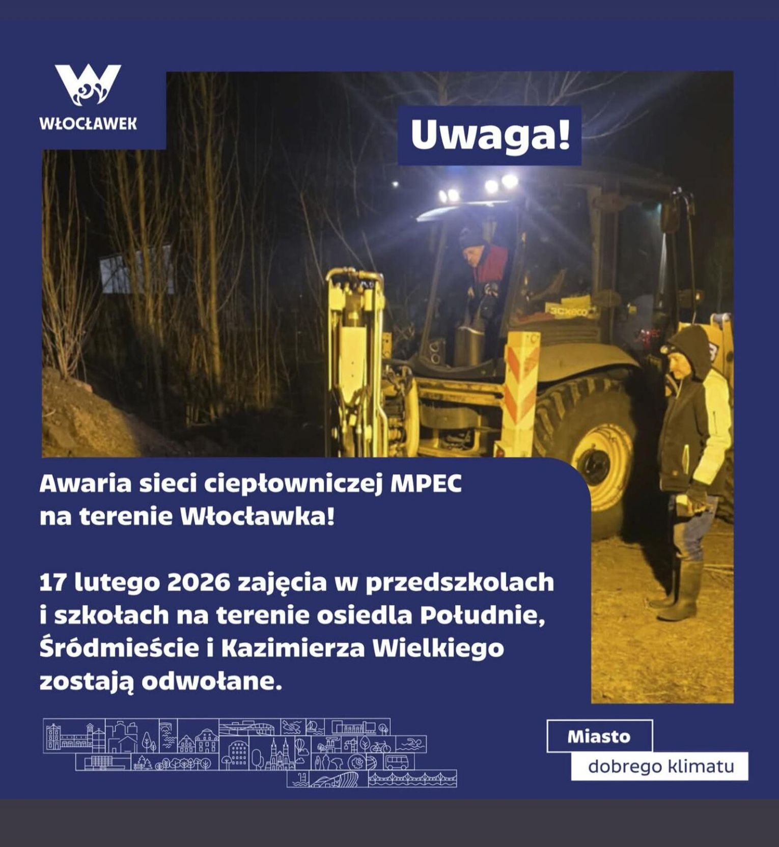W związku z wystąpieniem awarii sieci MPEC i problemem w dostarczeniu ciepła do placówek oświatowych w dniu 17 lutego 2026 roku (wtorek) zajęcia w żłobkach, przedszkolach i szkołach na terenie osiedla Południe, Śródmieście i Kazimierza Wielkiego zostają odwołane. Na terenie osiedla Michelin, Zawiśle oraz Zazamcze zajęcia odbywają się według planu. Od momentu wystąpienia awarii nieustannie trwają prace naprawcze. O wszelkich zmianach będziemy informować na bieżąco.