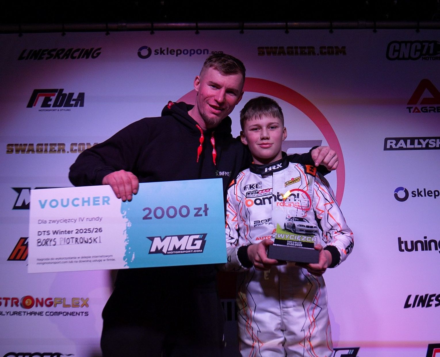 Za nami kolejna runda zimowej driftingowej serii DTS, która została rozegrana na torze Kielce. Po raz kolejny udział w kategorii Open wziął młody kierowca z Włocławka – Borys Piotrowski. Kierowca zaprezentował się fenomenalnie, przejechał trzy bardzo dobre biegi, które zapewniły mu najwyższe miejsce na podium. Dzięki solidnej zdobyczy punktowej młody Włocławianin awansował w klasyfikacji generalnej i przed ostatnimi zawodami ma realną szansę na zdobycie tytułu mistrzowskiego.