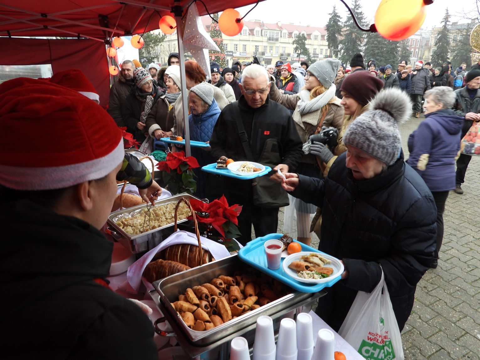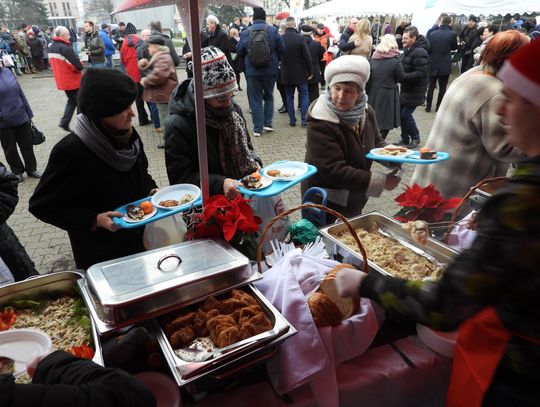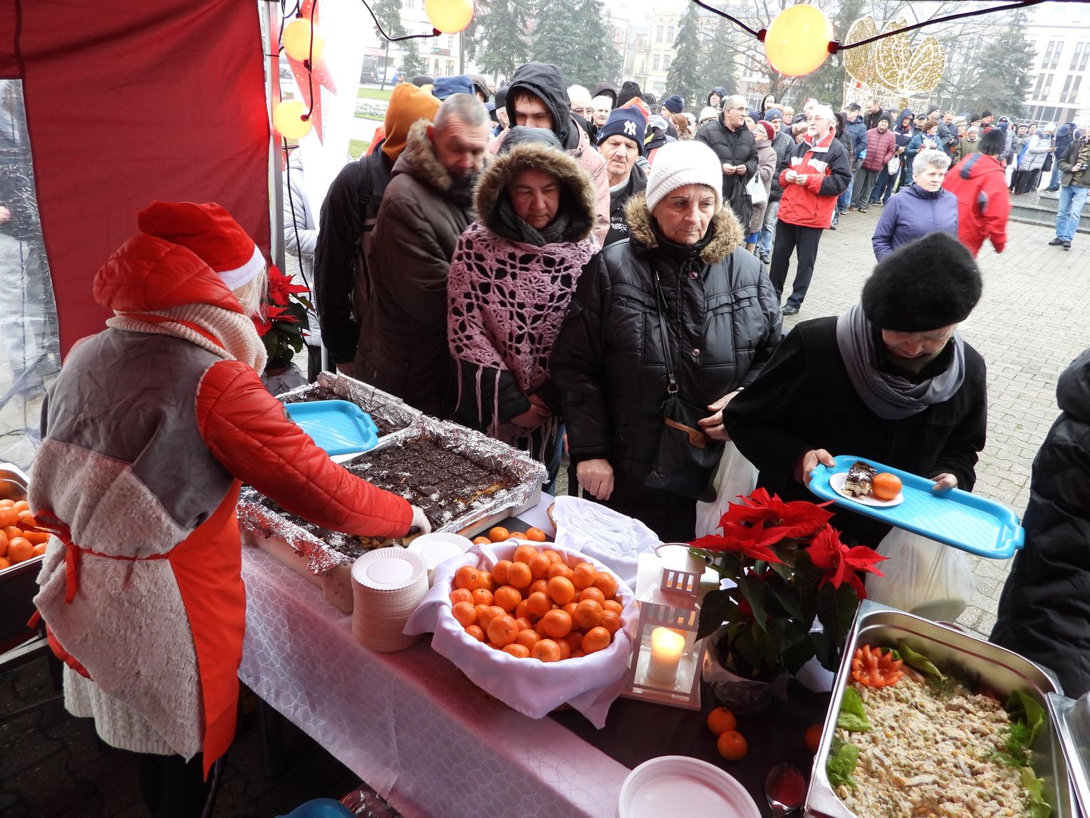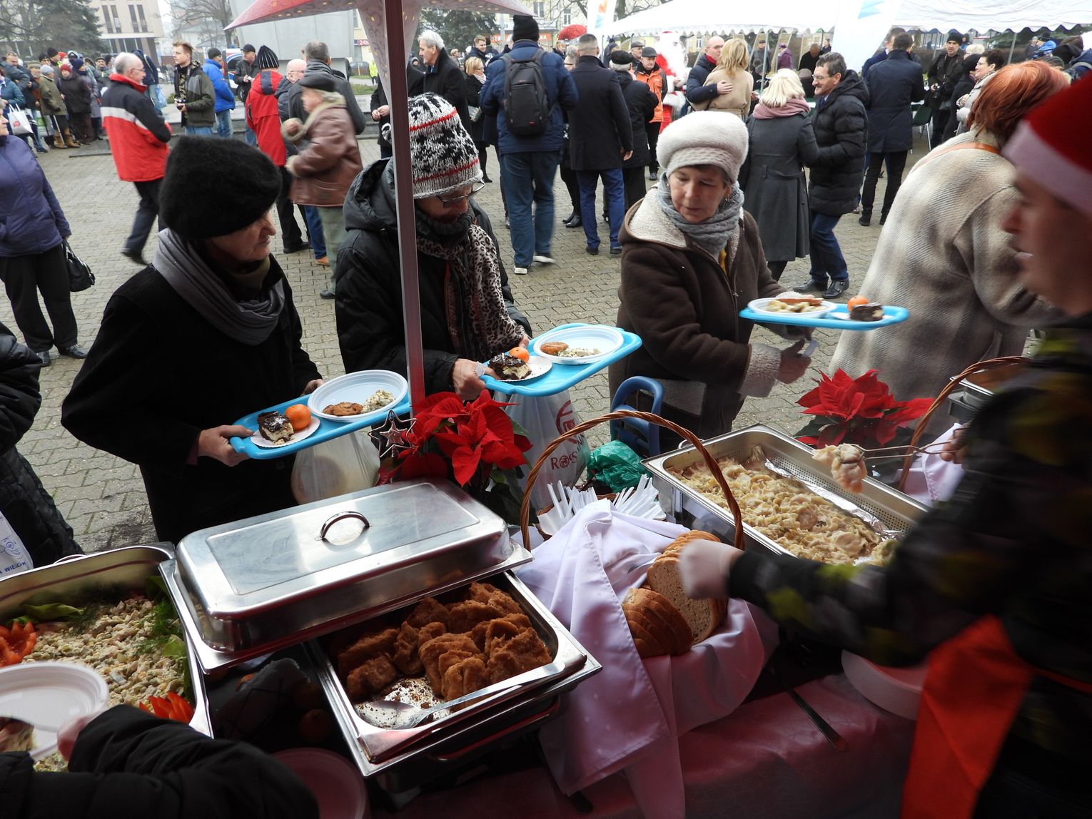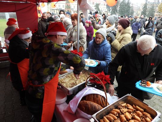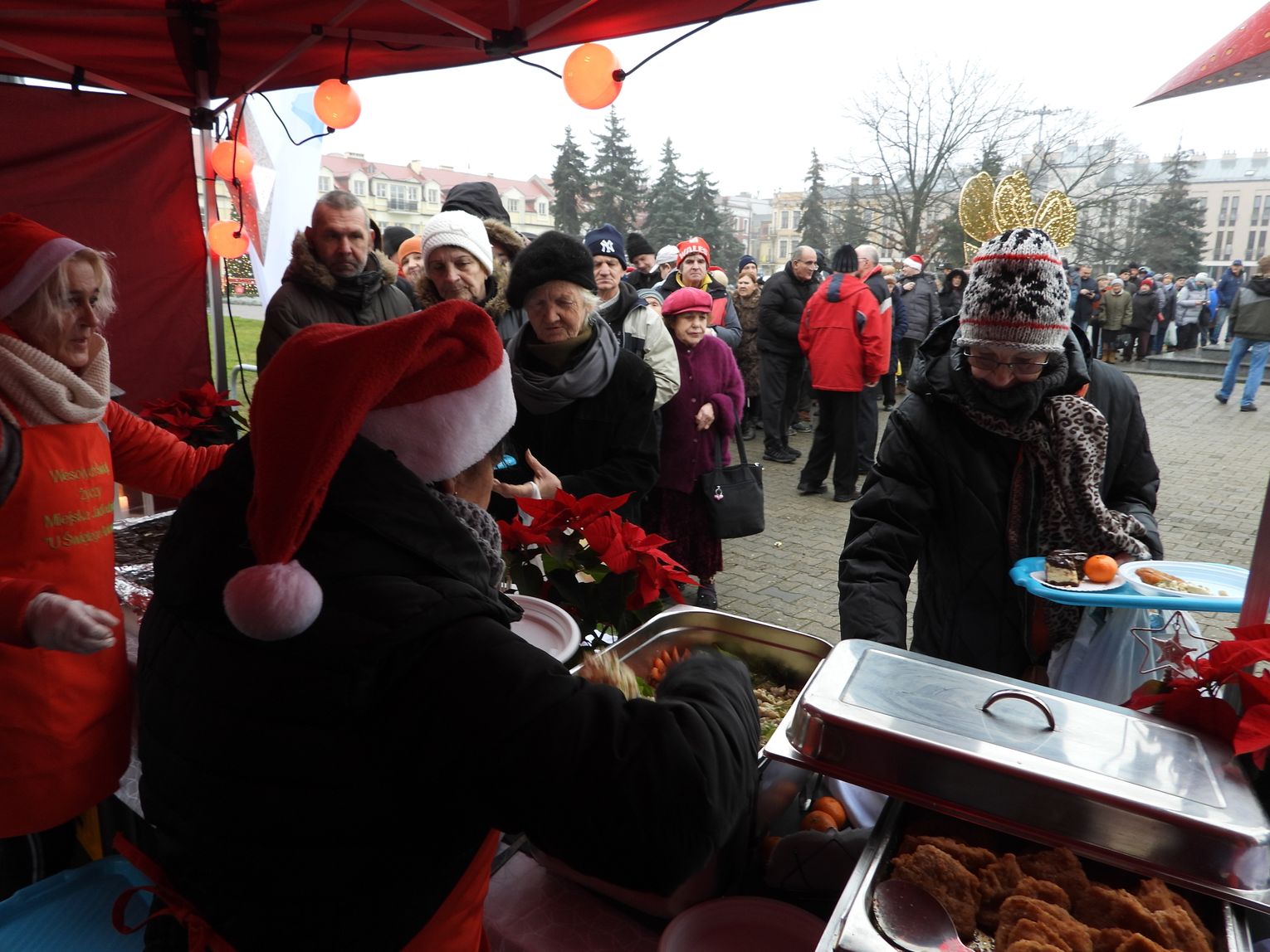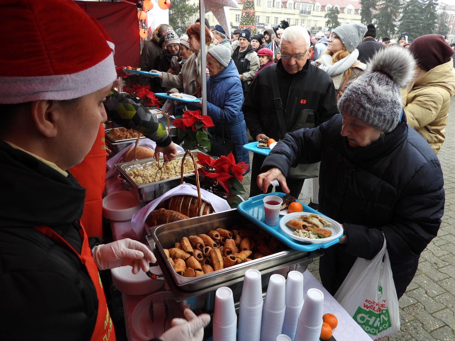 Jadłodajnia miejska przygotowała potrawy, które tradycyjnie znajdujemy na świątecznych stołach, czyli barszcz czerwony, pierogi z kapustą i grzybami, paszteciki z pieczarkami, sałatkę śledziową, zapiekaną rybę oraz makowiec, sernik i mandarynki. Do poczęstunku ustawiła się długa kolejka chętnych.