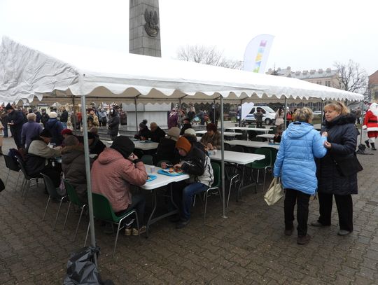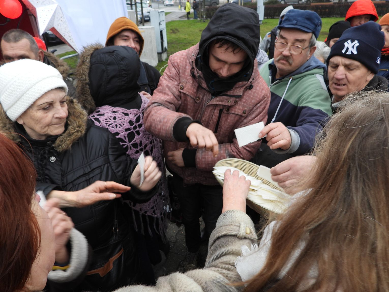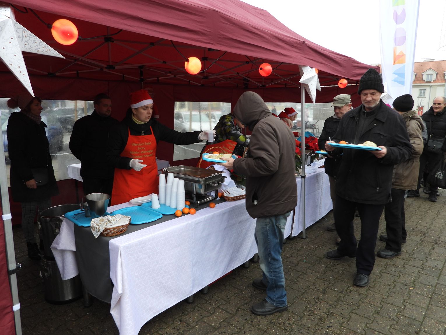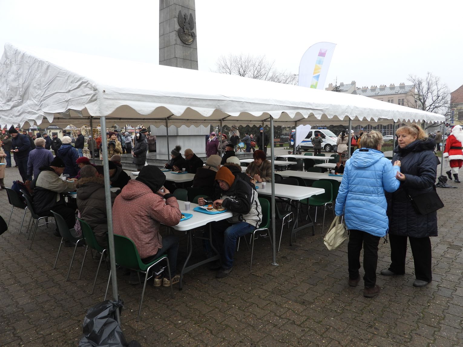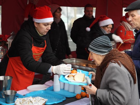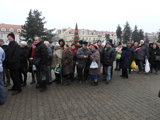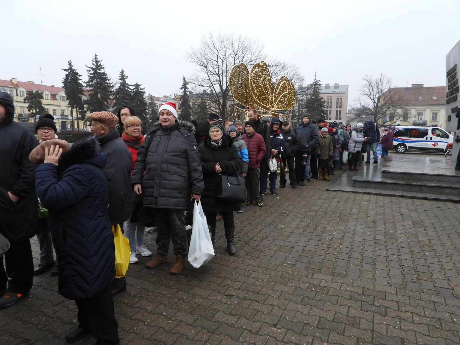 Jadłodajnia miejska przygotowała potrawy, które tradycyjnie znajdujemy na świątecznych stołach, czyli barszcz czerwony, pierogi z kapustą i grzybami, paszteciki z pieczarkami, sałatkę śledziową, zapiekaną rybę oraz makowiec, sernik i mandarynki. Do poczęstunku ustawiła się długa kolejka chętnych.