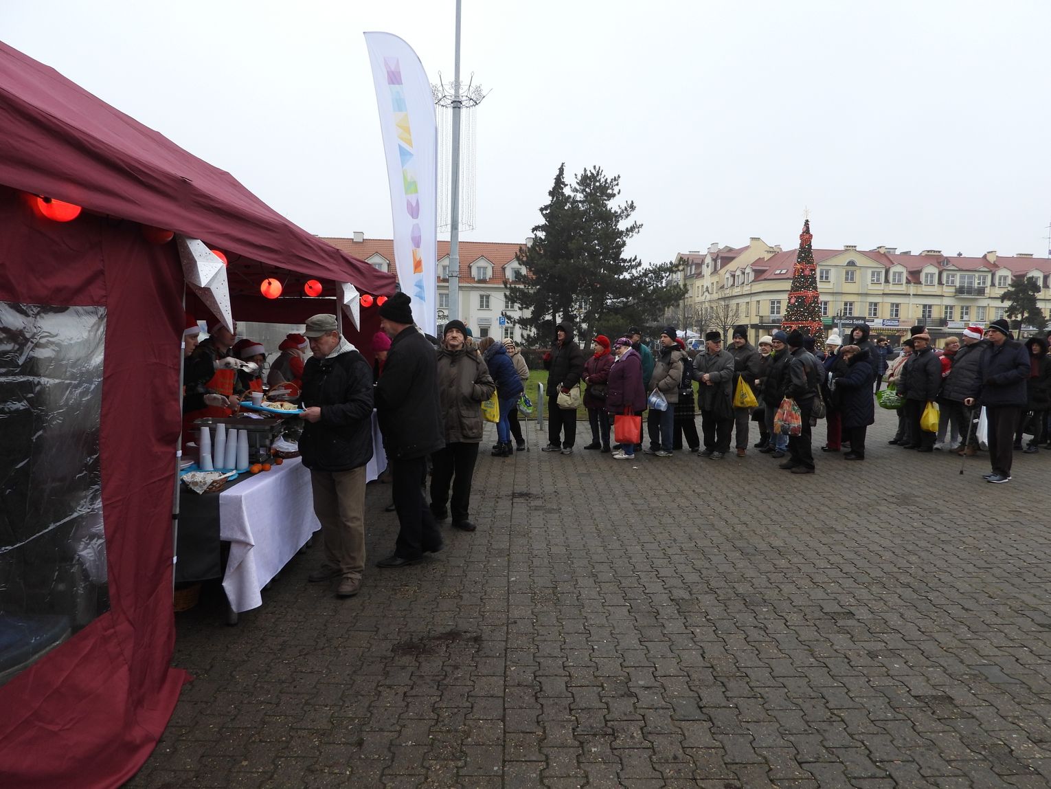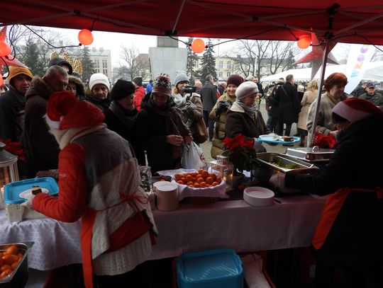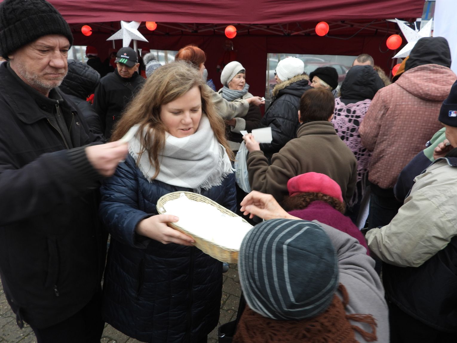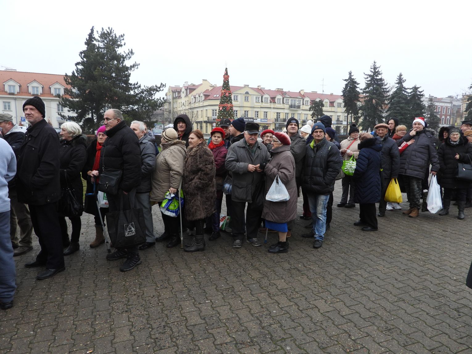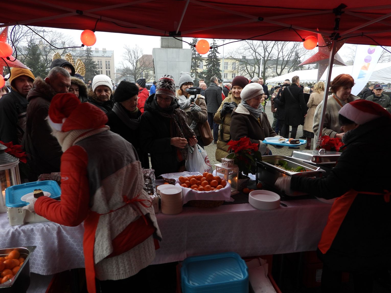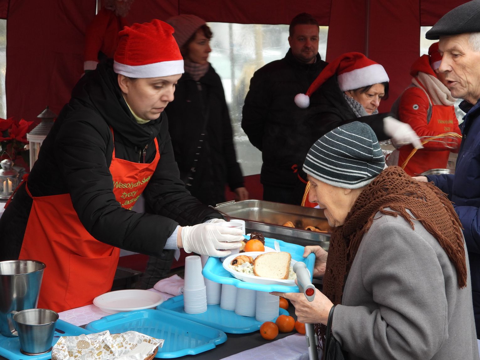 Jadłodajnia miejska przygotowała potrawy, które tradycyjnie znajdujemy na świątecznych stołach, czyli barszcz czerwony, pierogi z kapustą i grzybami, paszteciki z pieczarkami, sałatkę śledziową, zapiekaną rybę oraz makowiec, sernik i mandarynki. Do poczęstunku ustawiła się długa kolejka chętnych.