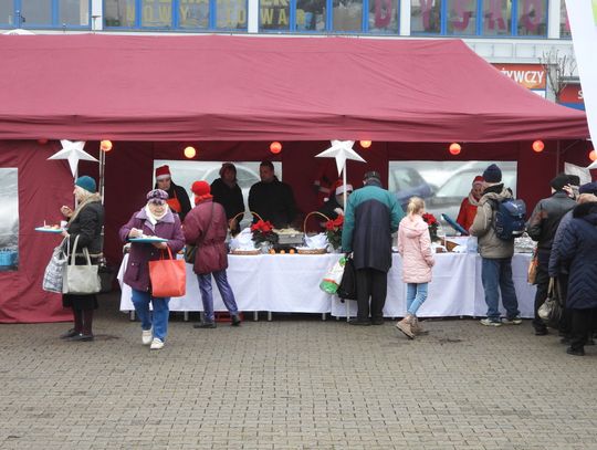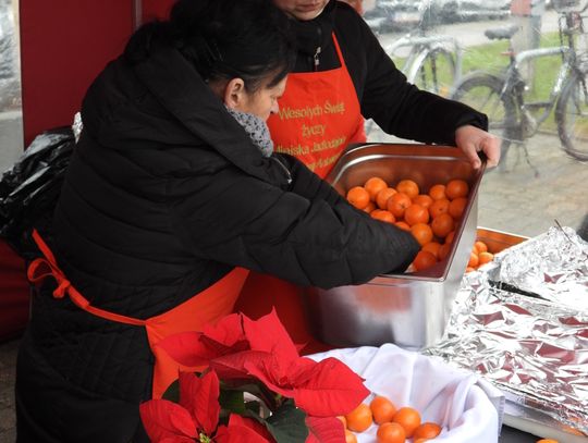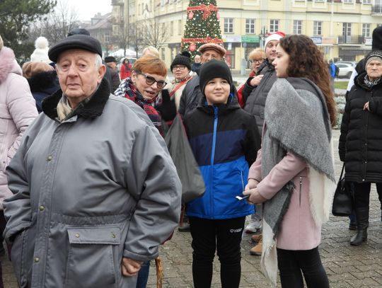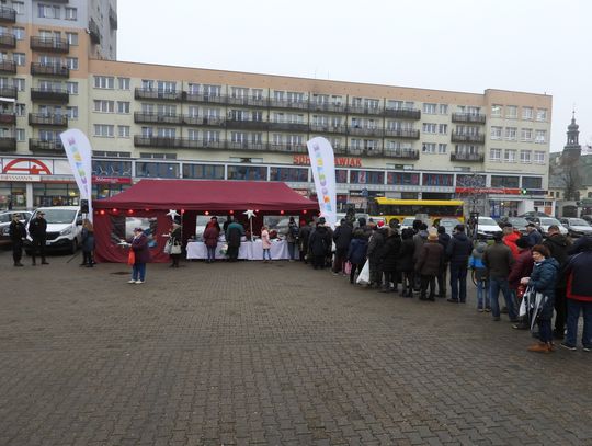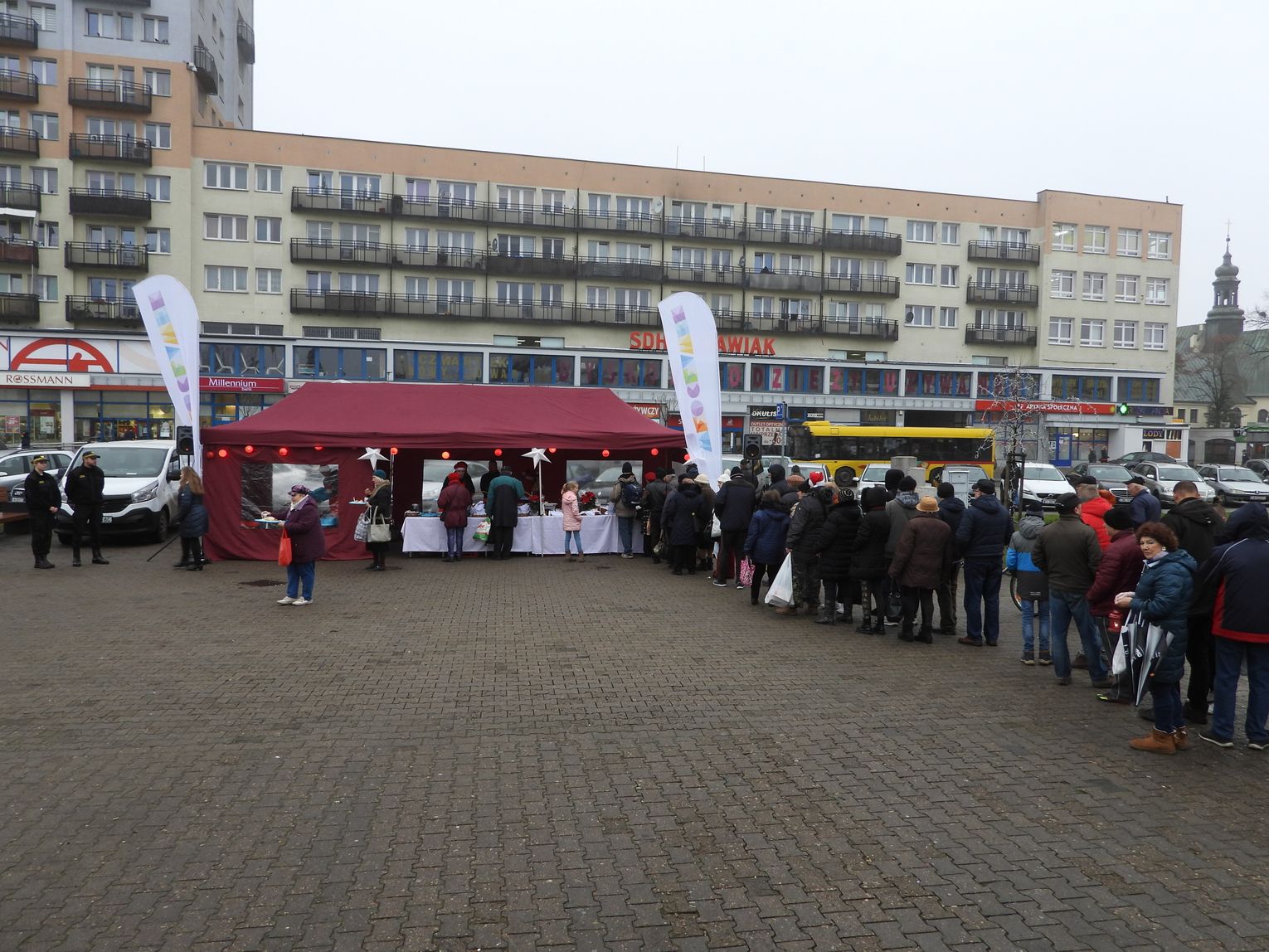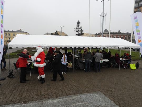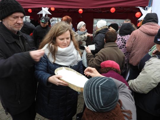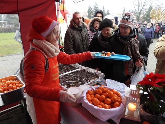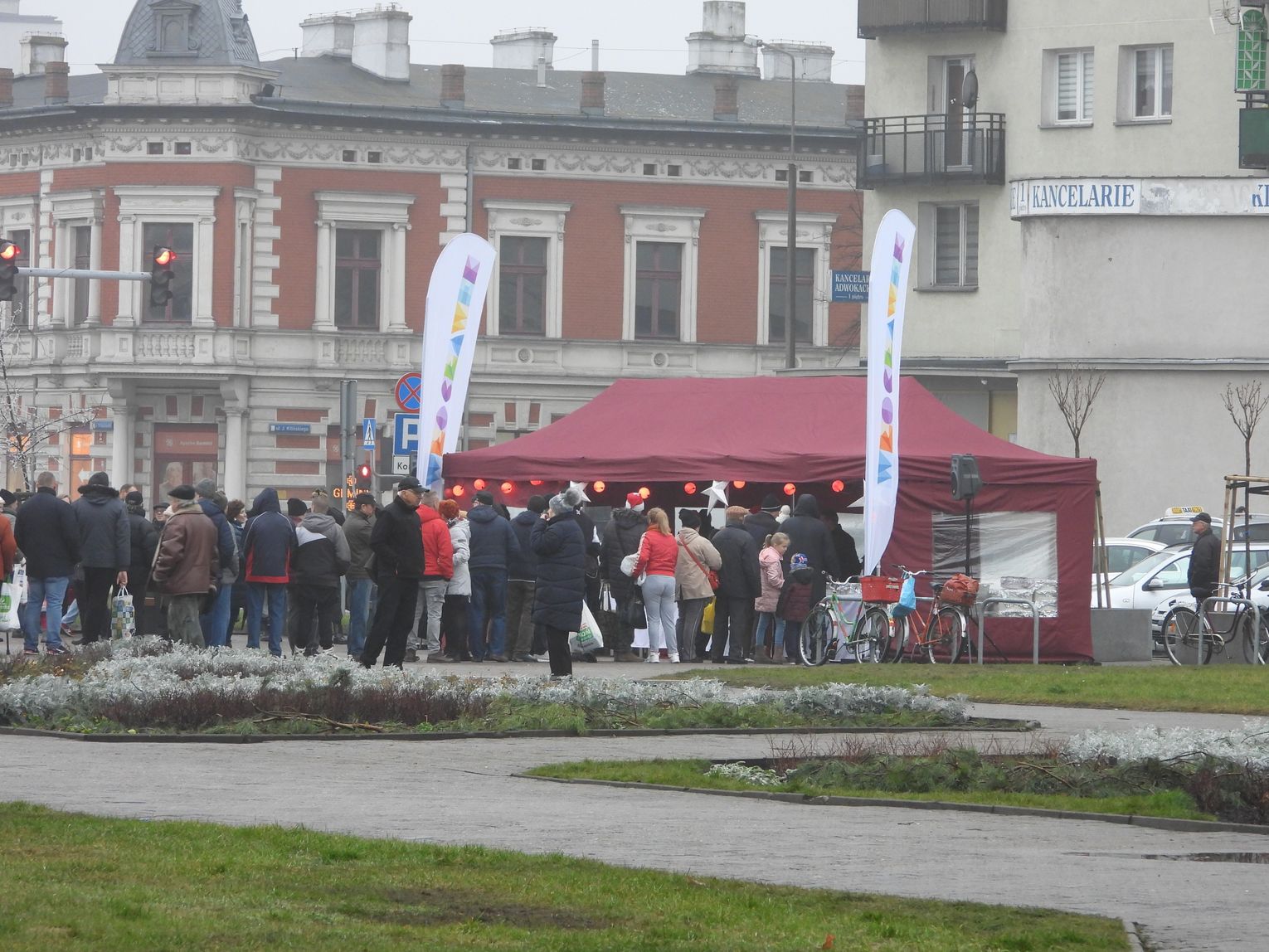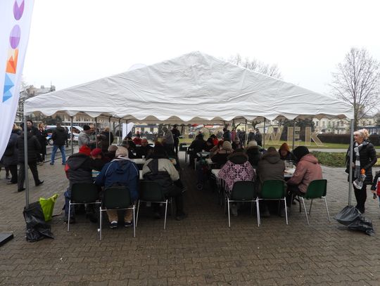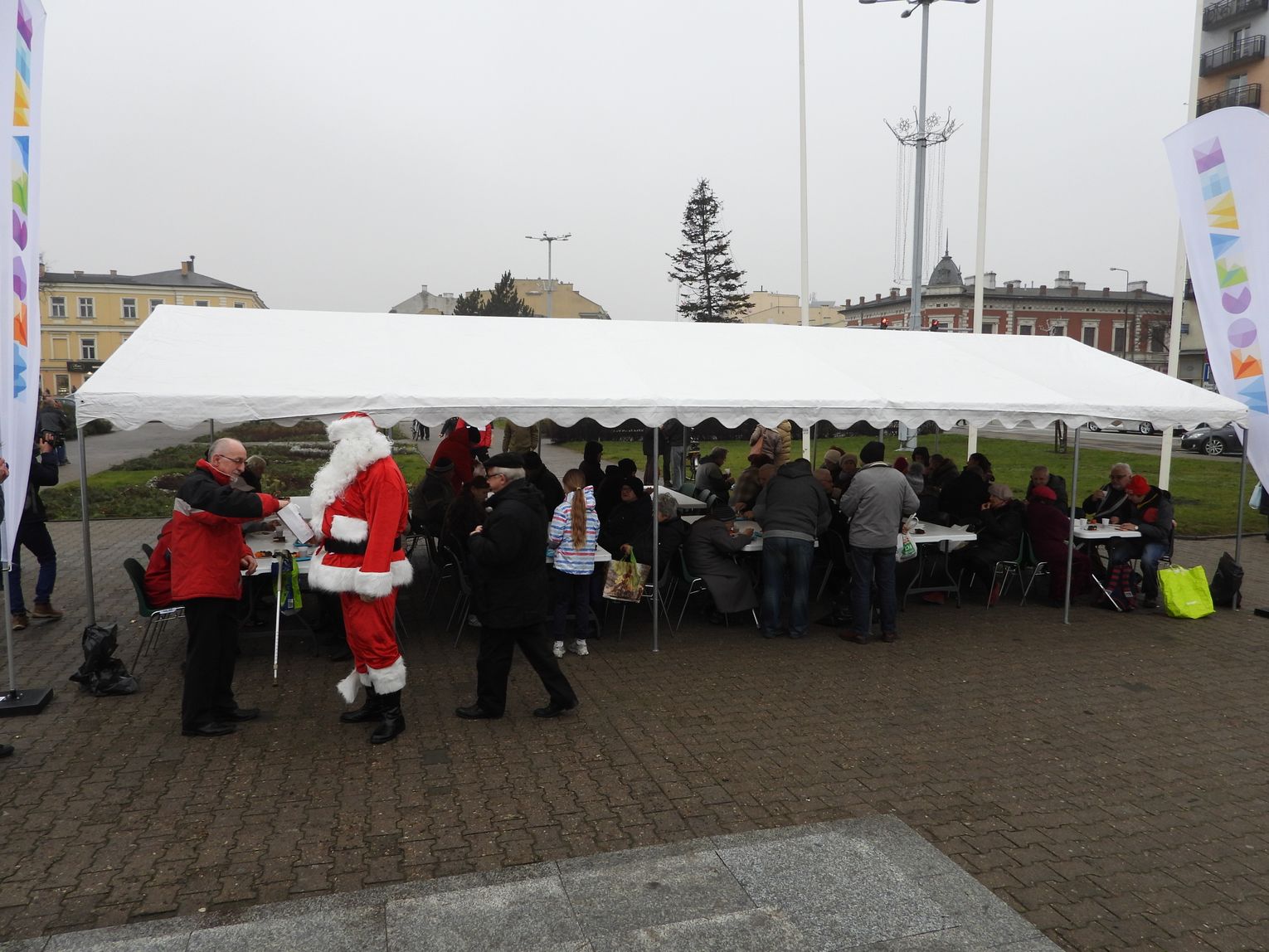 Jadłodajnia miejska przygotowała potrawy, które tradycyjnie znajdujemy na świątecznych stołach, czyli barszcz czerwony, pierogi z kapustą i grzybami, paszteciki z pieczarkami, sałatkę śledziową, zapiekaną rybę oraz makowiec, sernik i mandarynki. Do poczęstunku ustawiła się długa kolejka chętnych.