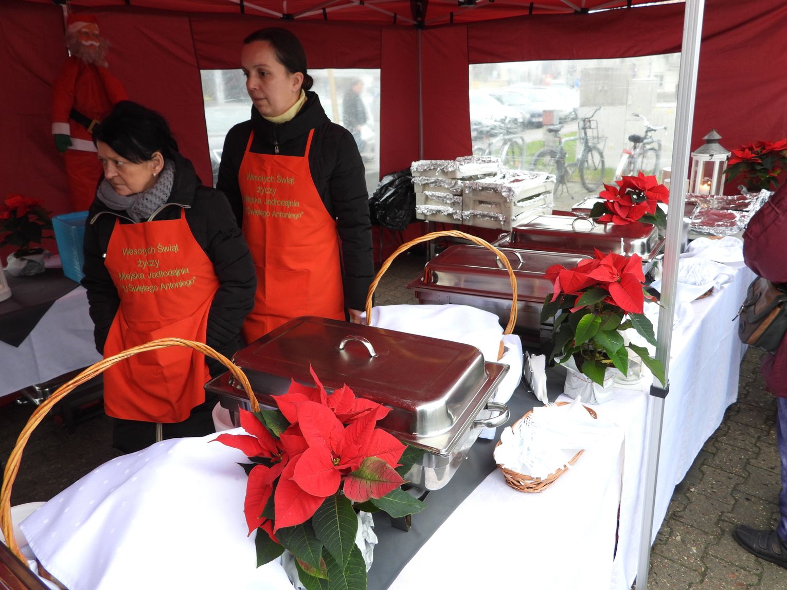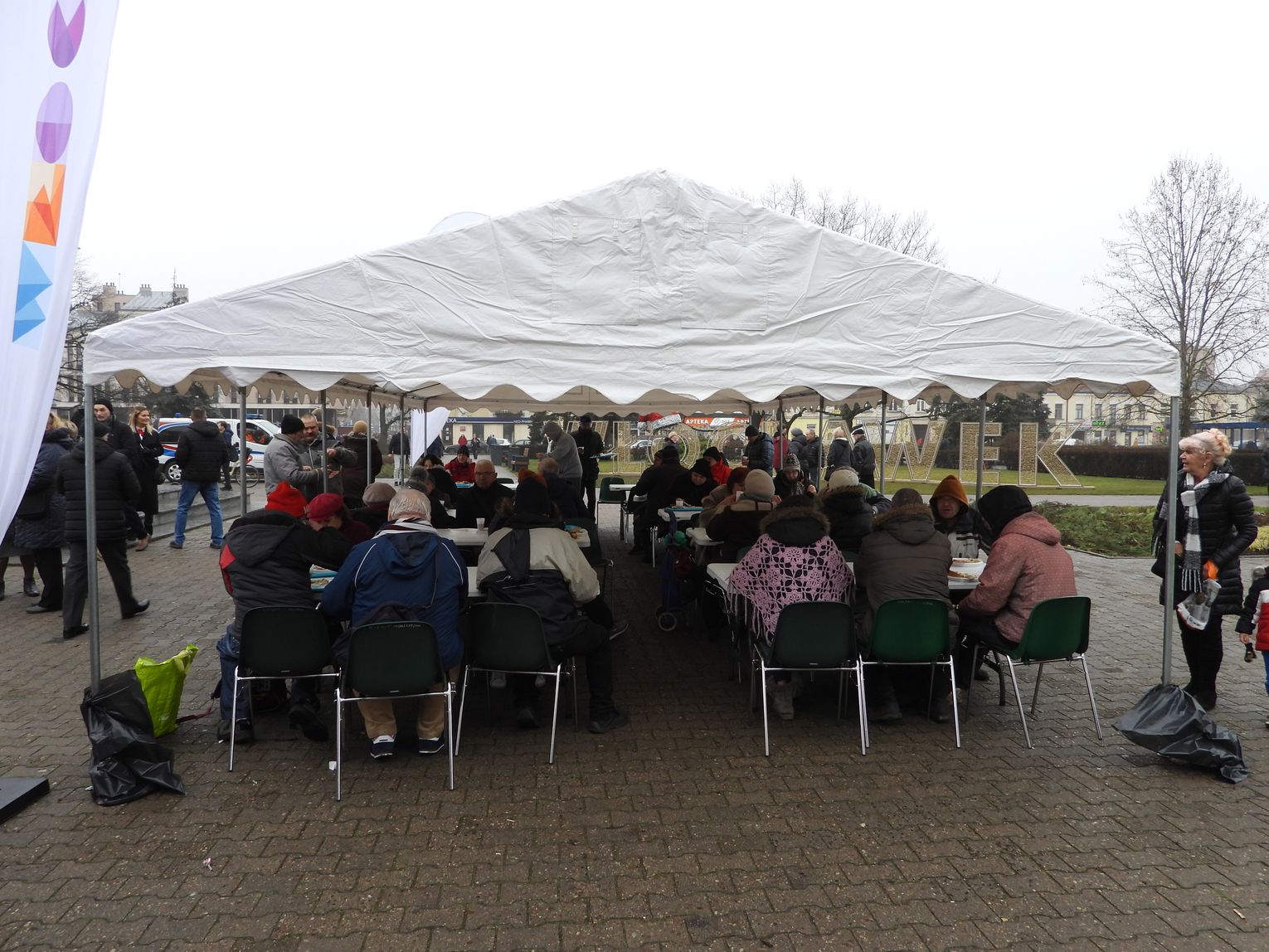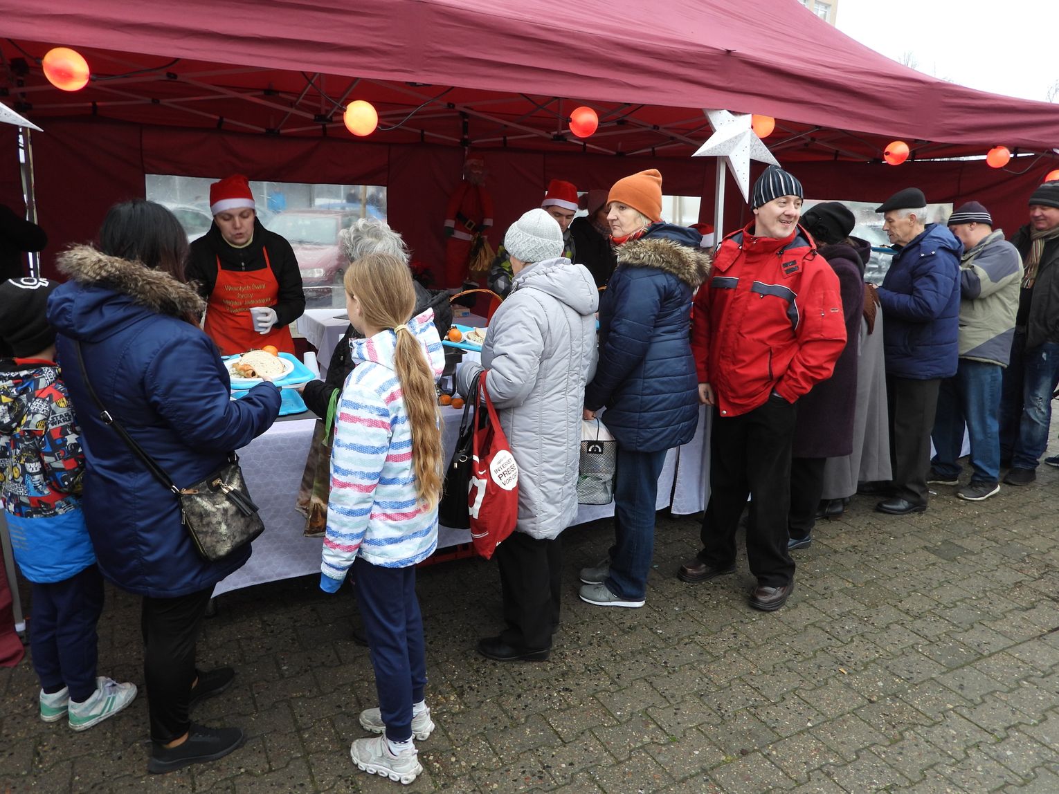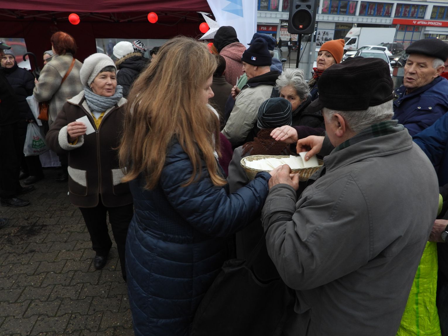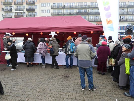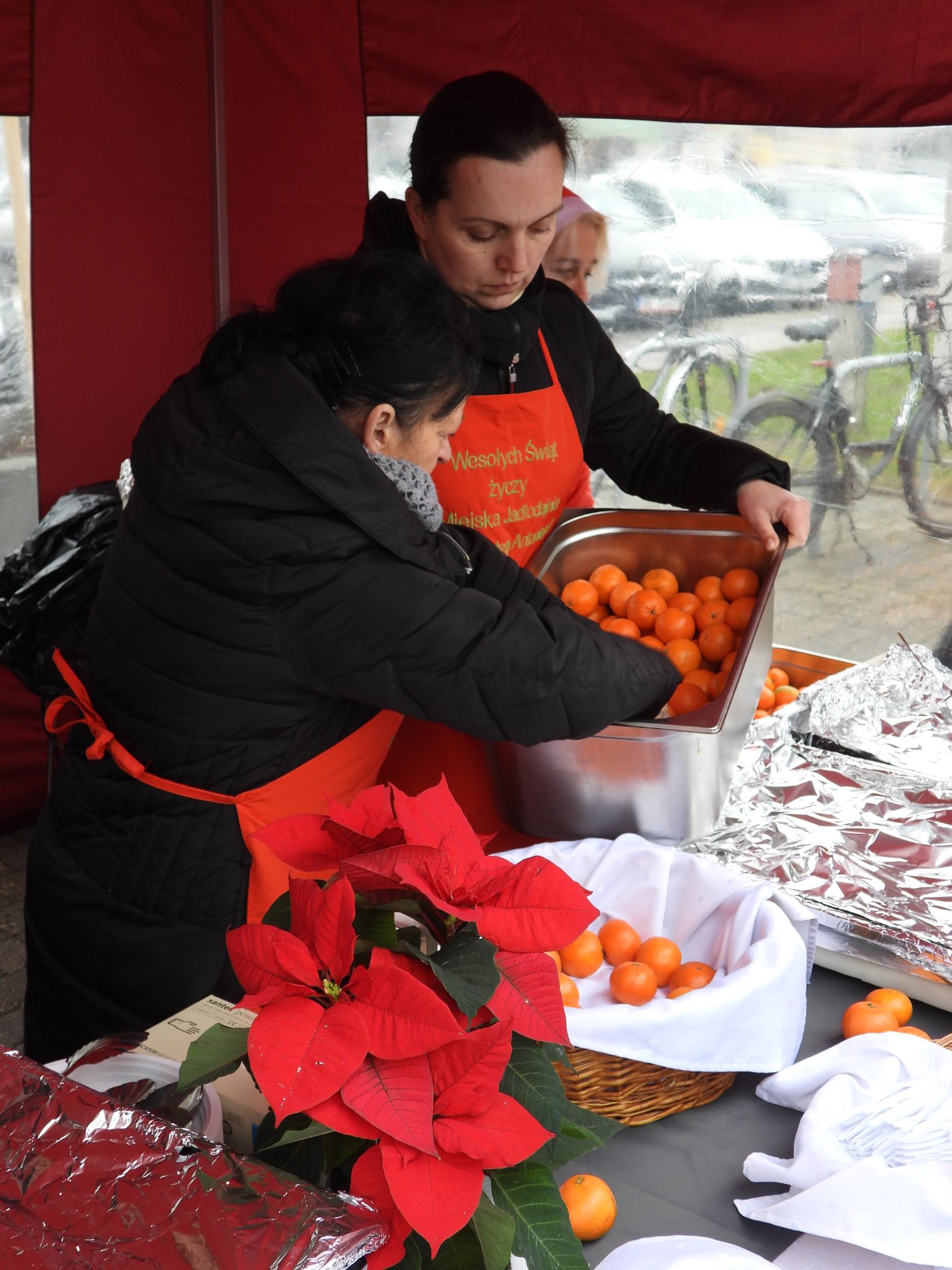 Jadłodajnia miejska przygotowała potrawy, które tradycyjnie znajdujemy na świątecznych stołach, czyli barszcz czerwony, pierogi z kapustą i grzybami, paszteciki z pieczarkami, sałatkę śledziową, zapiekaną rybę oraz makowiec, sernik i mandarynki. Do poczęstunku ustawiła się długa kolejka chętnych.