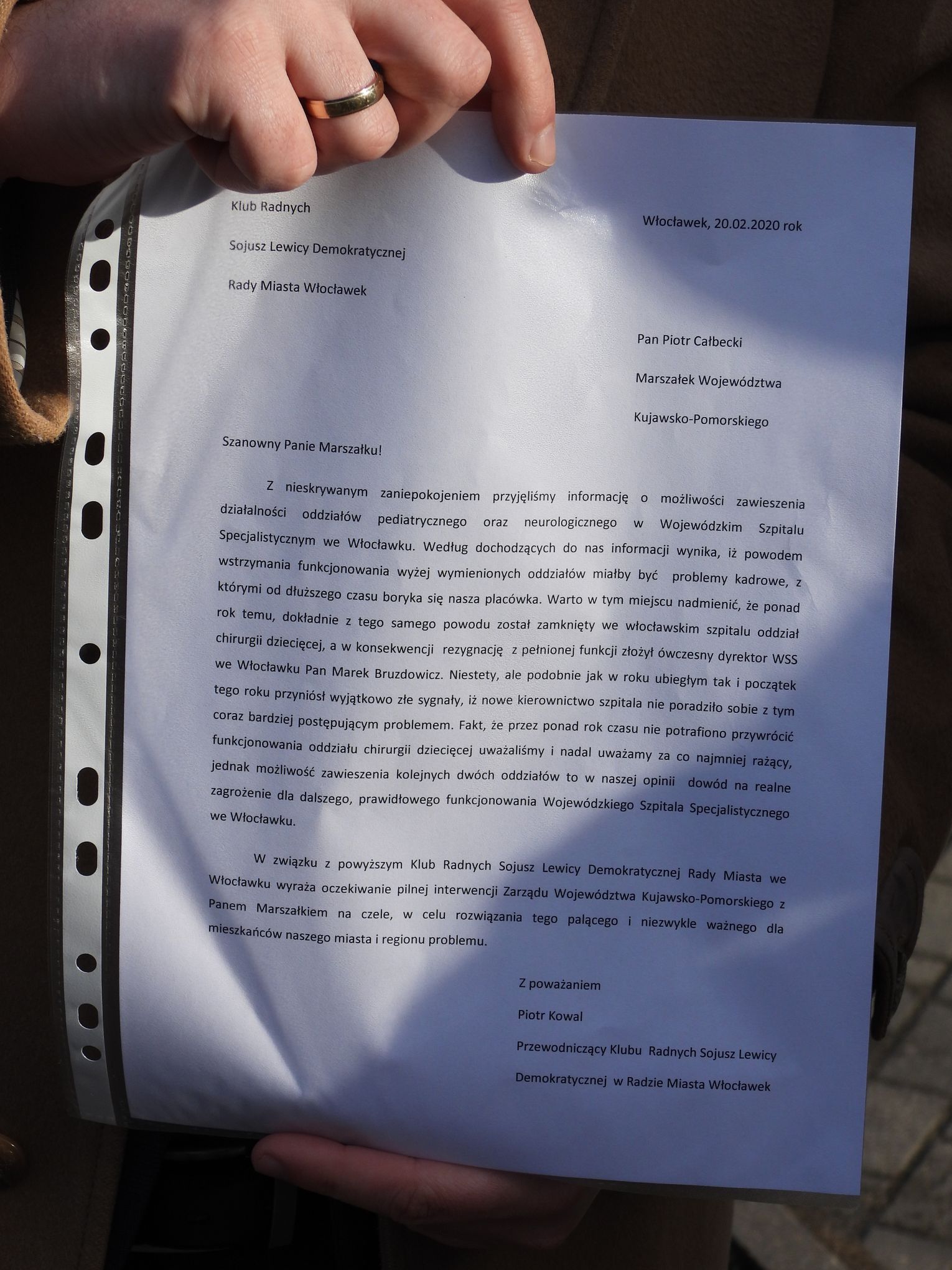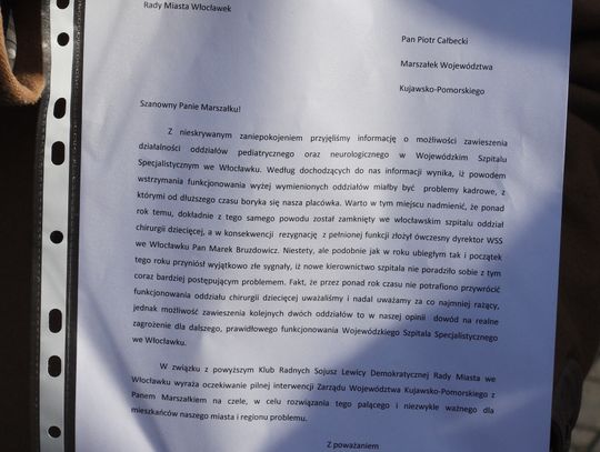 Radni zaznaczają, że i wówczas informacje te nie dotarły do Rady Miasta w porę. Wystosowali oni apel do Marszałka Województwa jako organu nadzorującego Wojewódzki Szpital Specjalistyczny we Włocławku, zawierający prośbę o pilną interwencję. Jak zaznaczyli radni SLD informacje napływające ze strony dyrekcji szpitala z mediów nie są dla nich przekonujące i domagają się jednoznacznych deklaracji, że wspomniane oddziały nie zostaną zamknięte. Jednocześnie swoje działania określają jako sygnał gotowości do udzielania pomocy, chęci współpracy oraz zaznaczają, że dzisiejsze wystąpienie nie jest krytyką funkcjonowania samego szpitala, dyrekcji, ani osób tam zatrudnionych, którzy wykonują dobra pracę w ciężkich warunkach.