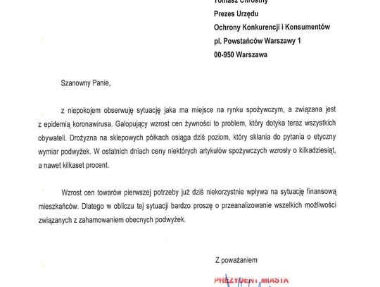 Wczoraj (17.03) prezydent miasta Marek Wojtkowski, wystosował pismo do prezesa Urzędu Ochrony Konkurencji i Konsumentów w związku z gwałtownym wzrostem cen żywności. Zdaniem prezydenta podwyżki te osiągają nieetyczny już wymiar, sięgając w niektórych przypadkach nawet kilkuset procent.