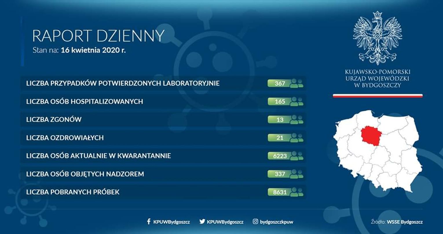 Stan w kujawsko-pomorskim na dzień 16.04.2020 r.: