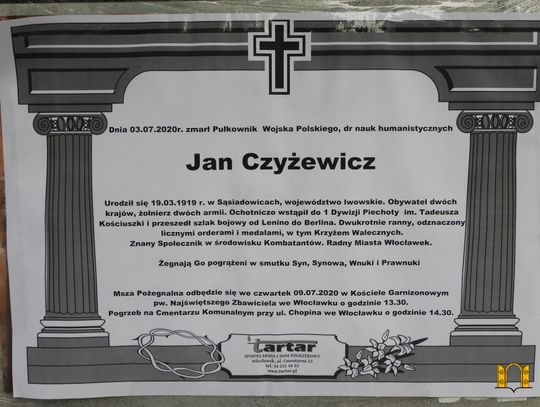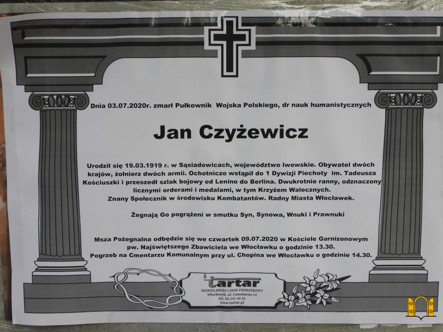 W miniony piątek 3 lipca zmarł Pułkownik Wojska Polskiego Jan Czyżewicz. Zmarły urodził się 19 marca 1919 r. w Sąsiadowicach w województwie lwowskim. Po agresji ZSRR na Polskę 17 września 1939 r. został wywieziony do Uljanowska, w okolicach Uralu.