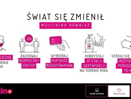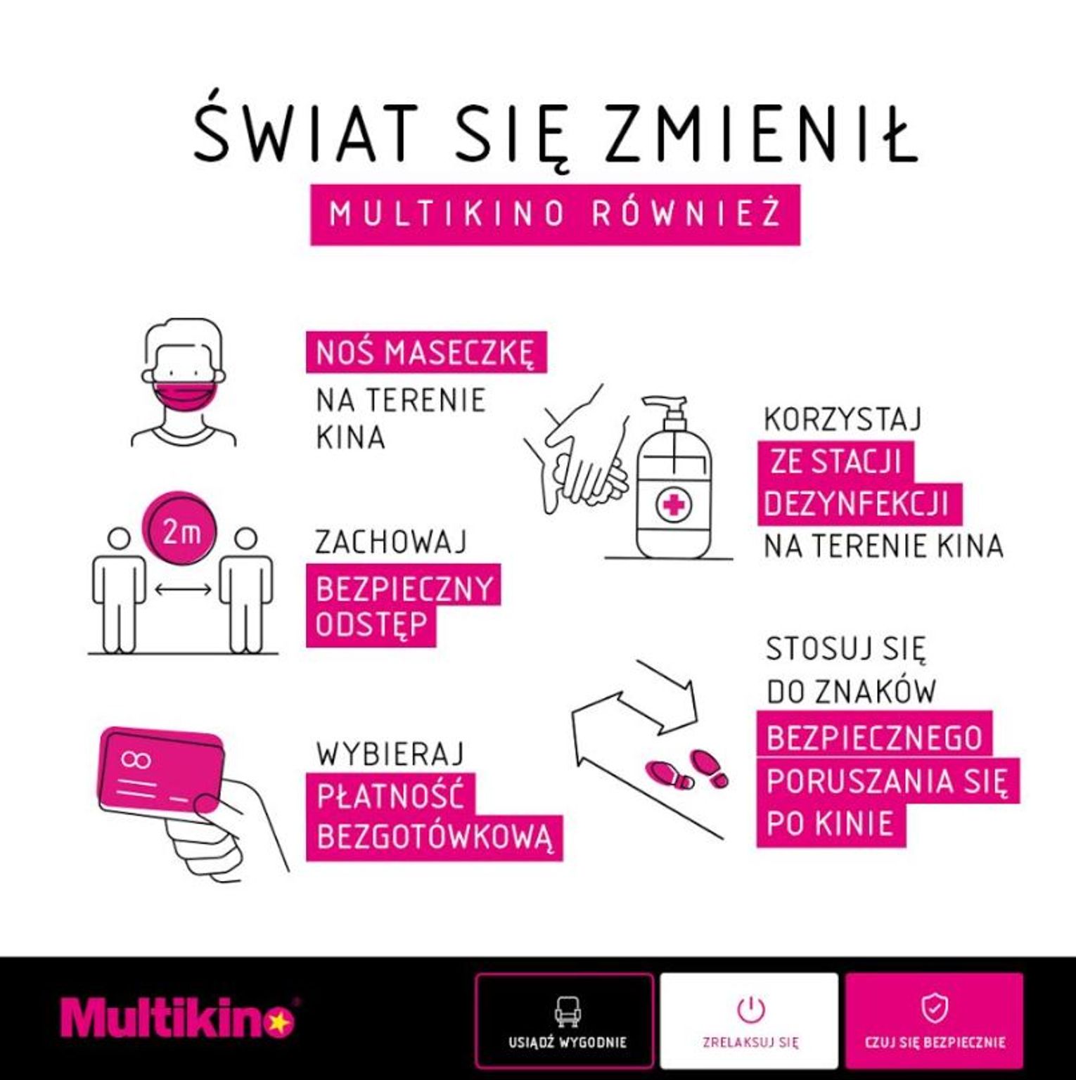 Zarząd Multikina poinformował ponadto, że w trosce o bezpieczeństwo widzów we foyer oraz w toaletach ulokowano stacje do dezynfekcji rąk, a obsługa multipleksów będzie zaopatrzona w przyłbice.
