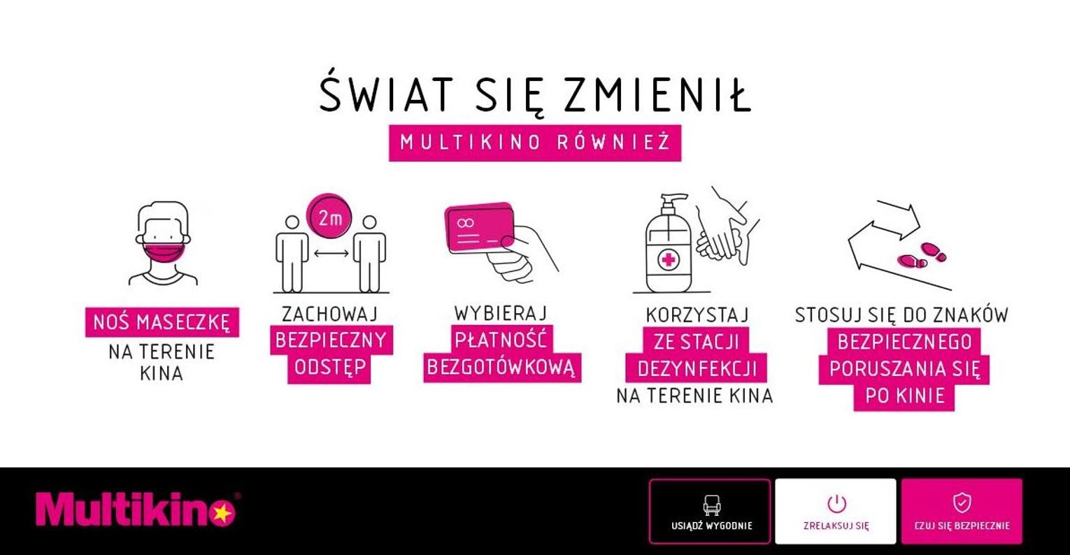 "Zgodnie z rządowymi wytycznymi widzowie na terenie kina powinni mieć zasłonięte maseczką lub przyłbicą usta i nos. Nasi klienci kupujący w kasach bilety mogą płacić za nie bezgotówkowo kartą płatniczą, Blikiem i telefonem, bądź nabyć je online poprzez stronę www.multikino.pl lub przy użyciu bezpłatnej aplikacji mobilnej Multikina." - informuje Paweł Świst Prezes Zarządu Multikino S.A.