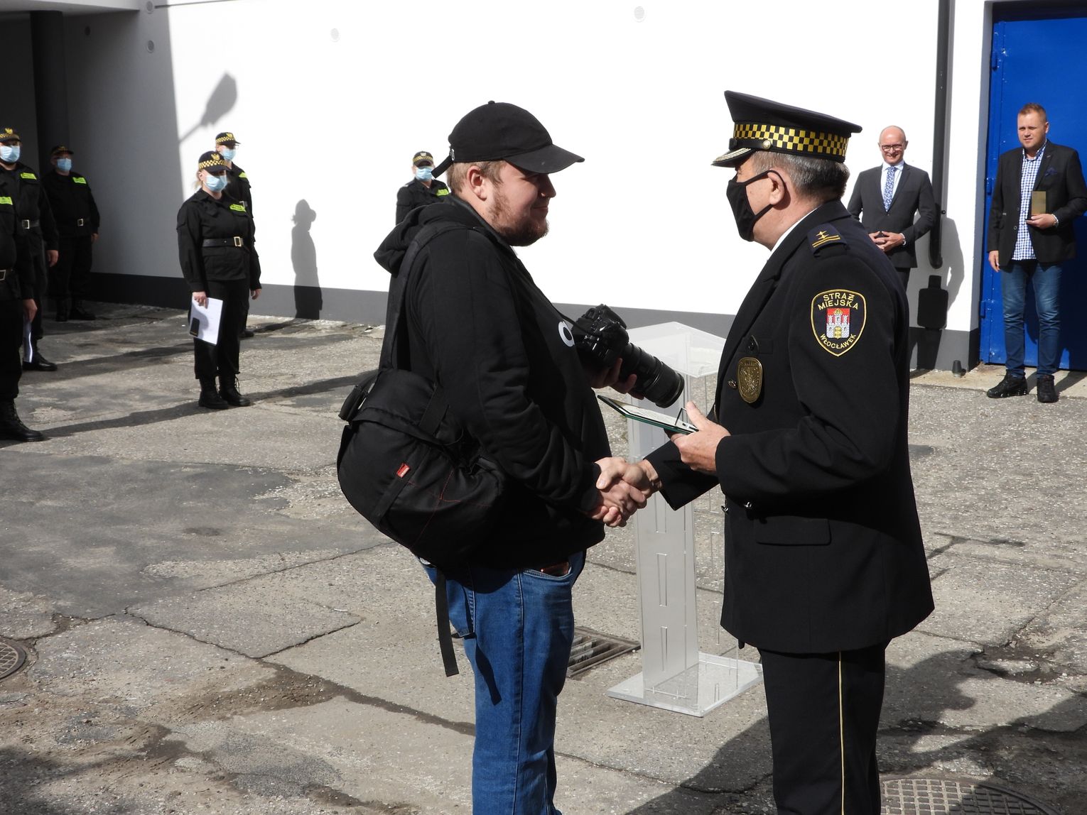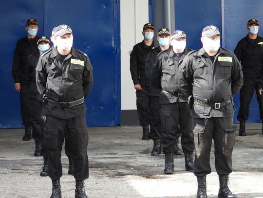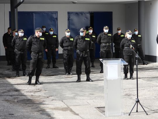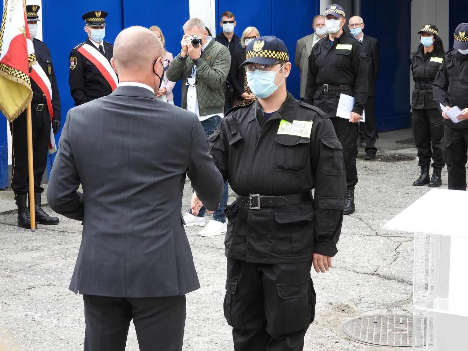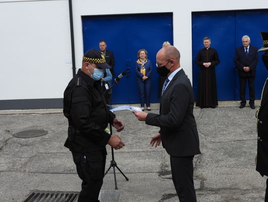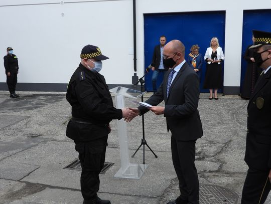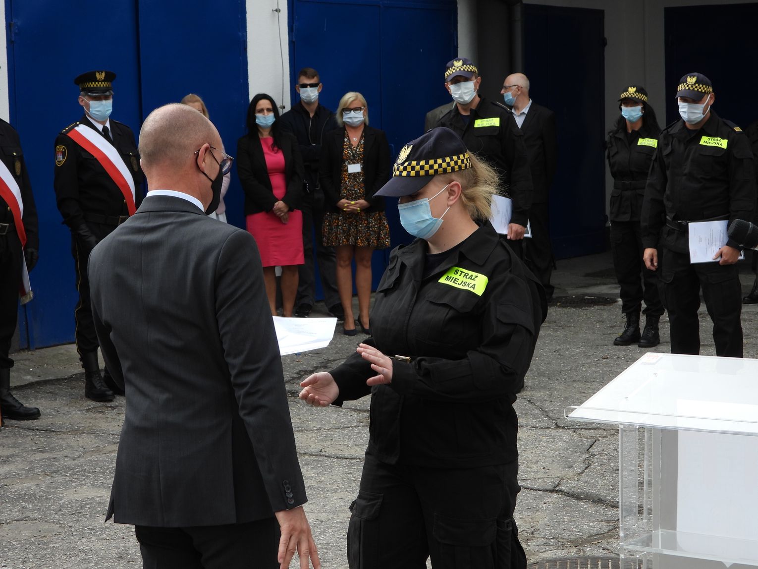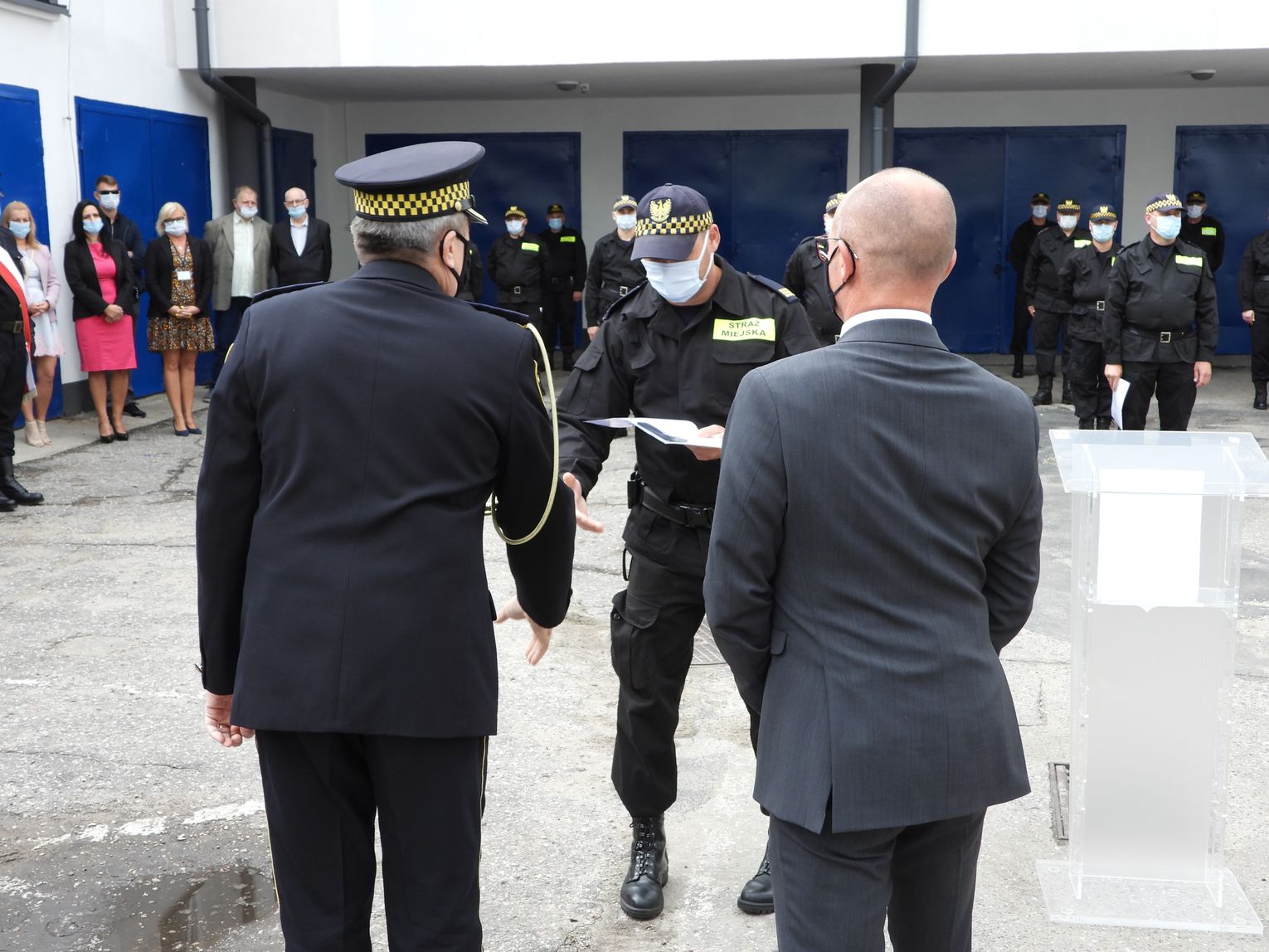 Następnie Prezydent Marek Wojtkowski wręczył strażnikom awanse na wyższe stopnie i podziękował im za ciężką pracę, którą wykonali w czasie pandemii koronawirusa.