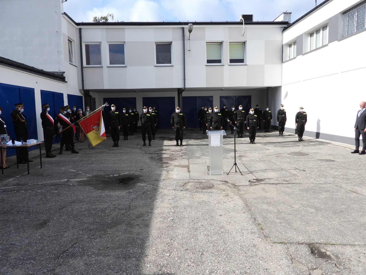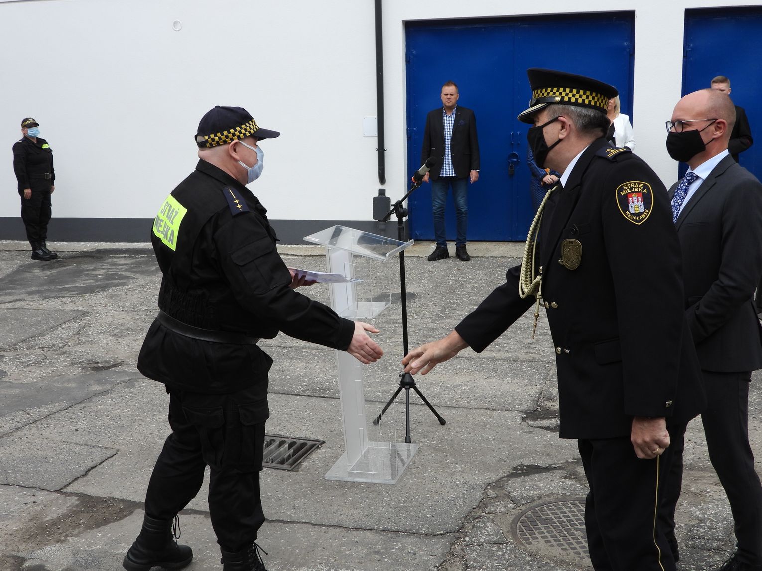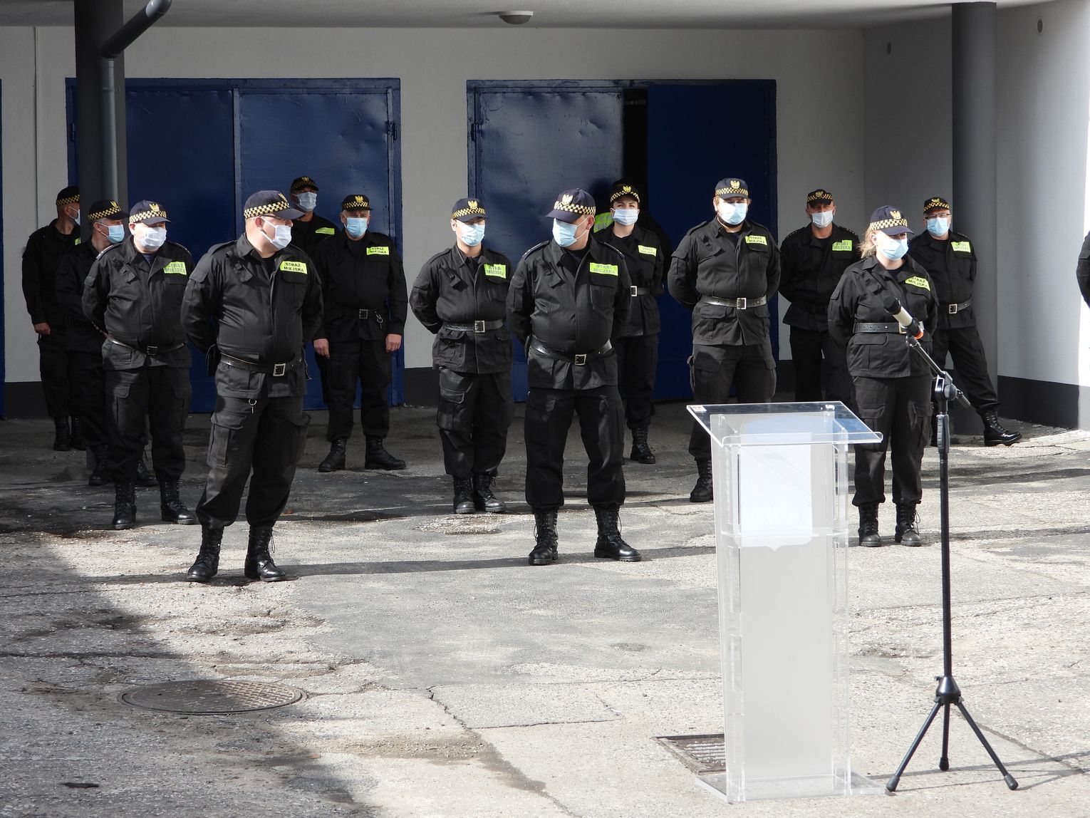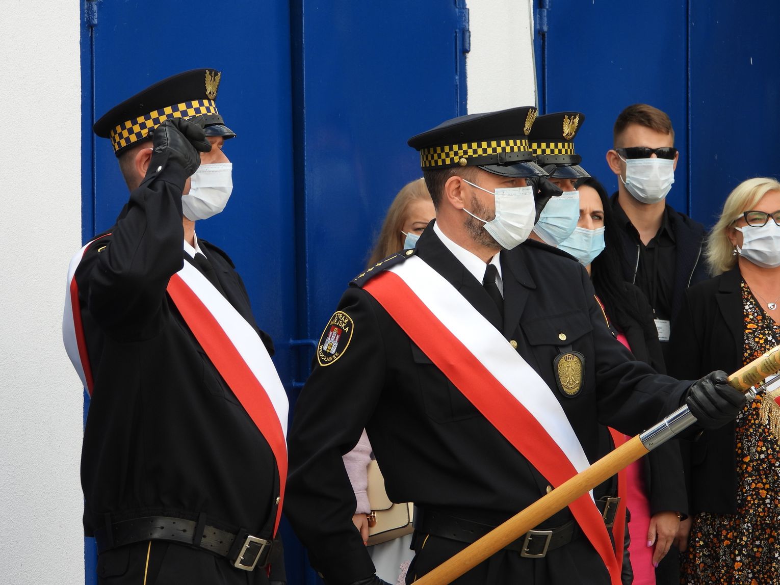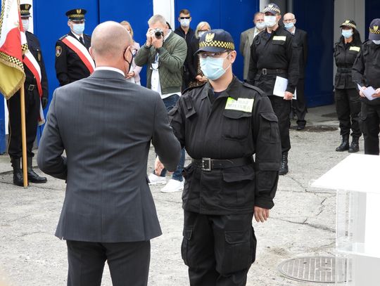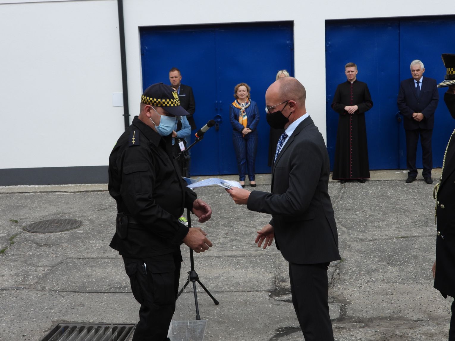 Następnie Prezydent Marek Wojtkowski wręczył strażnikom awanse na wyższe stopnie i podziękował im za ciężką pracę, którą wykonali w czasie pandemii koronawirusa.