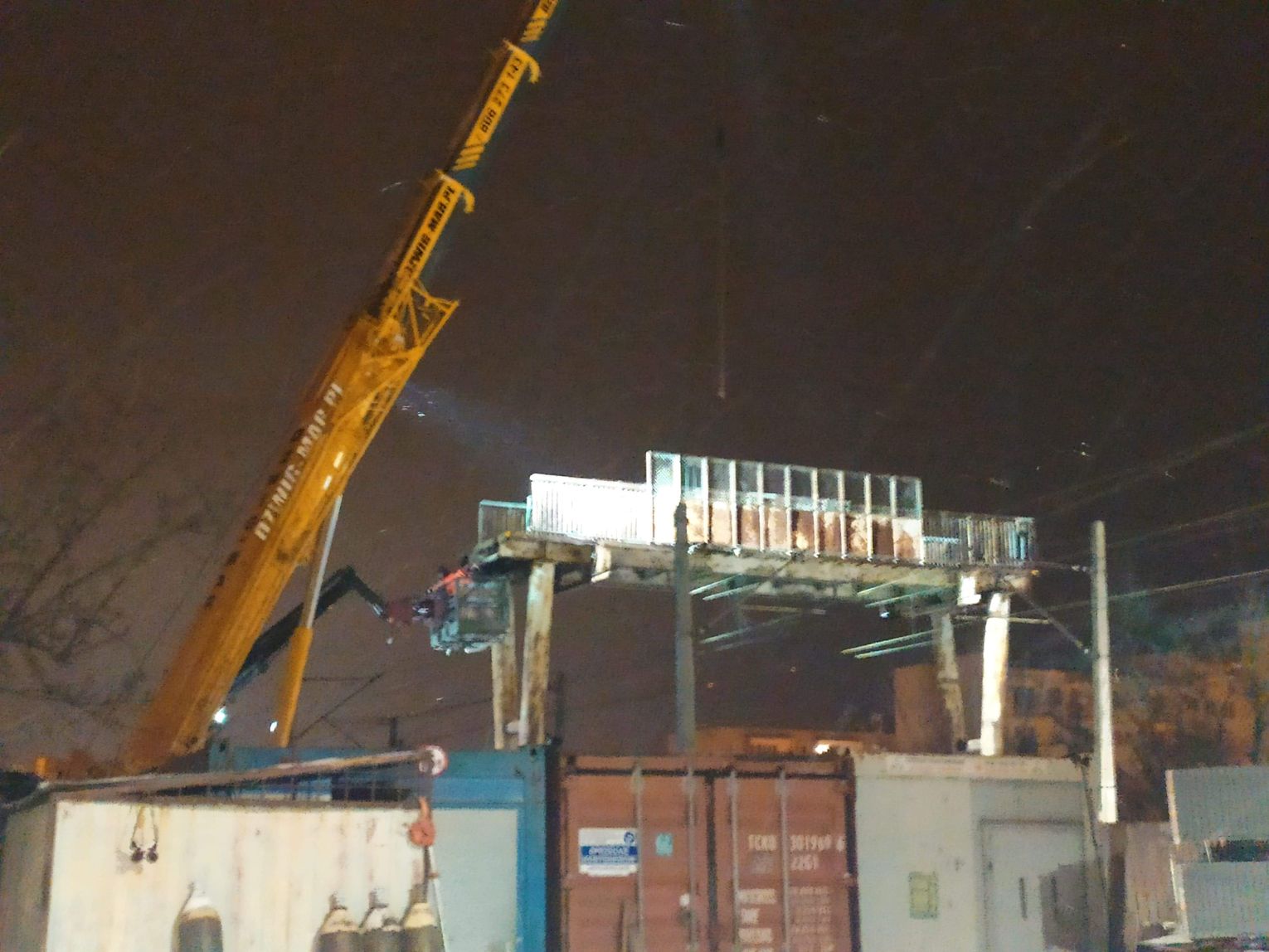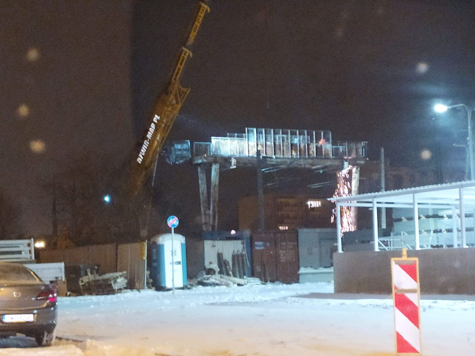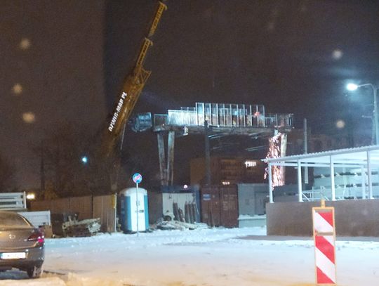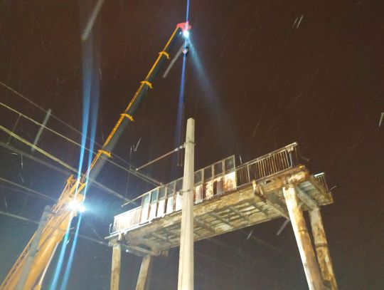 Dzisiejszej nocy otrzymaliśmy zdjęcia od mieszkańca Zazamcza, którego przed północą (08/09 lutego) obudziły prace rozbiórkowe. Z krajobrazu włocławskiego Zazamcza znika bowiem kładka nad torami. Co prawda rozbiórka kładki trwa również w dzień, ale tym razem również trwała nocą. Po tym jak zdemontowano schody został do rozebrania najwyższy fragment kładki i słupy podtrzymujące. Jak widać na fotografiach wykonawca (budowy przejścia podziemnego, który w ramach inwestycji również demontuje kładkę) użył specjalnego dźwigu, który podtrzymywał całą konstrukcje. Z kolei na wysięgniku jeden z pracowników przecinał metalową konstrukcję, co przysparzało najwięcej hałasu. Wygląda na to, że to już ostatni etap rozbiórki kładki, ale nie budowy samego przejścia podziemnego, mimo, że zostało już udostępnione dla włocławian. Trudno znaleźć informacje dotyczące dokładnej daty budowy kładki, jednak jak można przeczytać na stronach internetowych zbliżonych do wiarygodnych ;) powstała na przełomie lat 80 i 90.