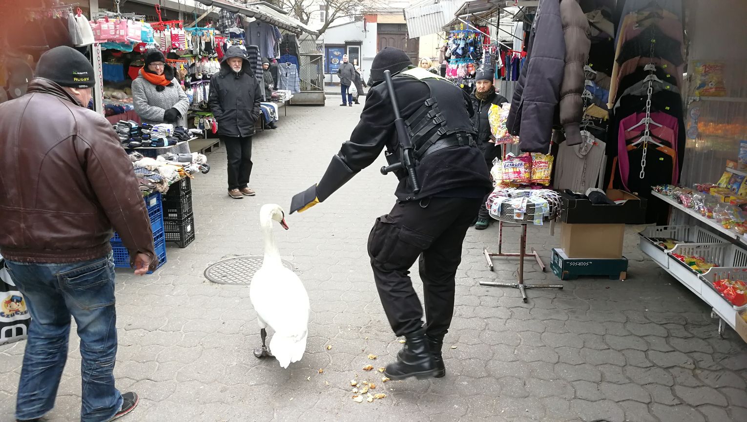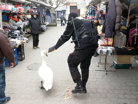 Dziś około godz. 10:45 strażnicy miejscy z „eko-patrolu” zrealizowali interwencję zgłoszoną przez mieszkańców dot. prawdopodobnie rannego łabędzia, który z niewiadomych przyczyn znalazł się na ulicy Młynarskiej w rejonie targowiska miejskiego. Po przybyciu na miejsce zgłoszenia strażnicy zlokalizowali ptaka na terenie targowiska i bardzo sprawnie odłowili zwierzę. Łabędź został również przebadany przez przybyłego do komendy Straży Miejskiej technika weterynarii i następnie wypuszczony na wolność w pobliżu stada przy rzece Zgłowiączka.