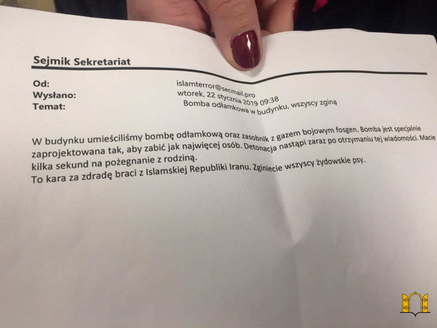 Ostatnia ewakuacja pracowników ratusza spowodowana była e-mailem o podłożeniu ładunku wybuchowego w Urzędzie Miasta. Nadawca napisał w nim m.in "To kara za zdradę braci z Islamskiej Republiki Iranu. Zgniecie wszyscy żydowskie psy". E-mail o identycznej treści trafił także do siedziby Urzędu Marszałkowskiego Województwa Pomorskiego w Gdańsku i Lublinie. O jakiej zdradzie mowa? Przypuszczać można, że chodziło o konferencję jaka odbyć się ma w Warszawie i dotyczyć Bliskiego Wschodu. Iranu na konferencje nie zaproszono. Tajemnicą poliszynela jest, że miała być wymierzona przeciwko Iranowi, z którym Rzeczpospolita Polska od setek lat (niektóre źródła podają 550 lat) ma poprawne stosunki dyplomatyczne. Warszawa została wyznaczona jako miejsce konferencji przez USA (niejako narzucona). Polski rząd na nią przystał. W związku z powyższym ambasador irański w Polsce stwierdził, że "Polska niszczy 500 lat przyjaźni", zaś rząd Iranu komentował m.in "Wstyd, którego Polska nie zmyje". Odwołano również Festiwal Polski w Teheranie, a także wstrzymano wydawanie wiz turystycznych dla Polaków.