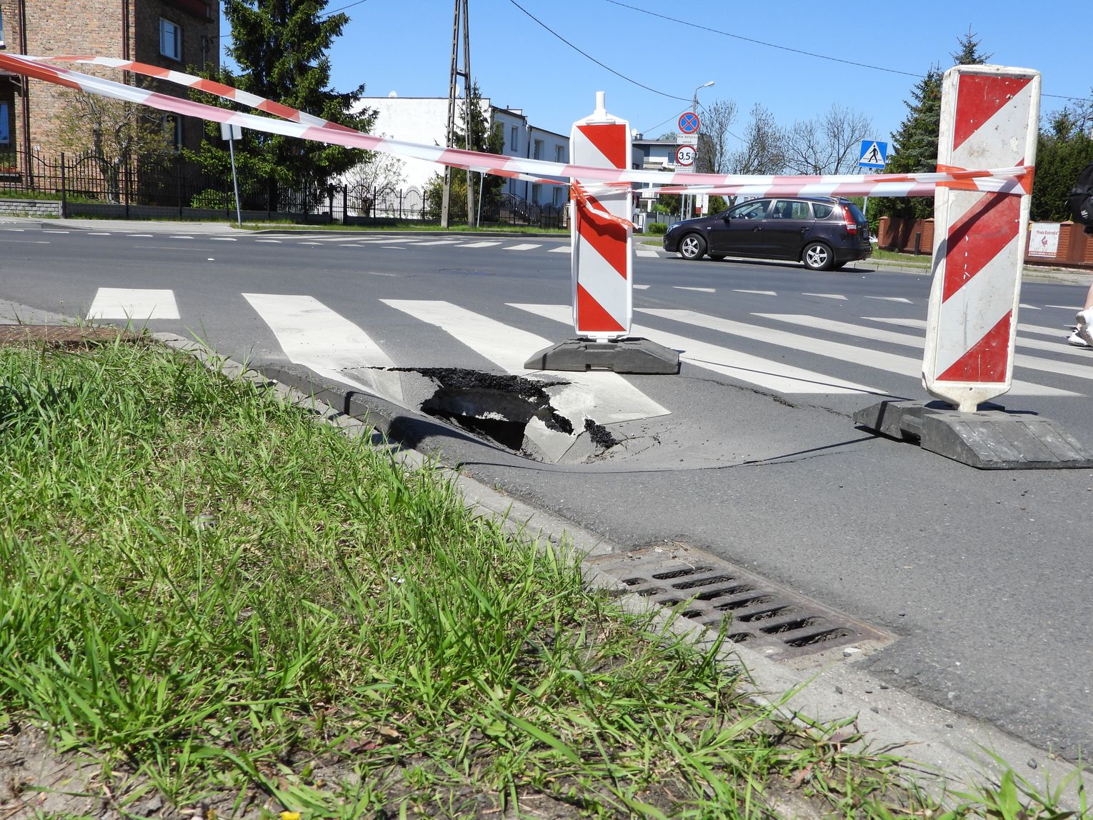 Na skrzyżowaniu ulic Wiejskiej i Prusa, na przejściu dla pieszych powstała dużych rozmiarów dziura. Została zabezpieczona dwoma słupkami ostrzegawczymi i biało-czerwoną taśmą. Zapadlisko stanowi zagrożenie zarówna dla pojazdów jak i pieszych. Dodatkowo wygląda na to, że wielki ubytek w jezdni może niebawem jeszcze się powiększyć, na co wskazuje wyginający się wokół otworu asfalt. Skontaktowaliśmy się z MPWiK sądząc, że awaria ma związek z instalacją kanalizacyjną bądź wodociągową. W odpowiedzi usłyszeliśmy, że dziura nie powstała w wyniku usterki instalacji zarządzanych przez MPWiK i zalecono nam kontakt z zarządcą drogi, a więc Miejskim Zarządem Infrastruktury Drogowej i Transportu we Włocławku.