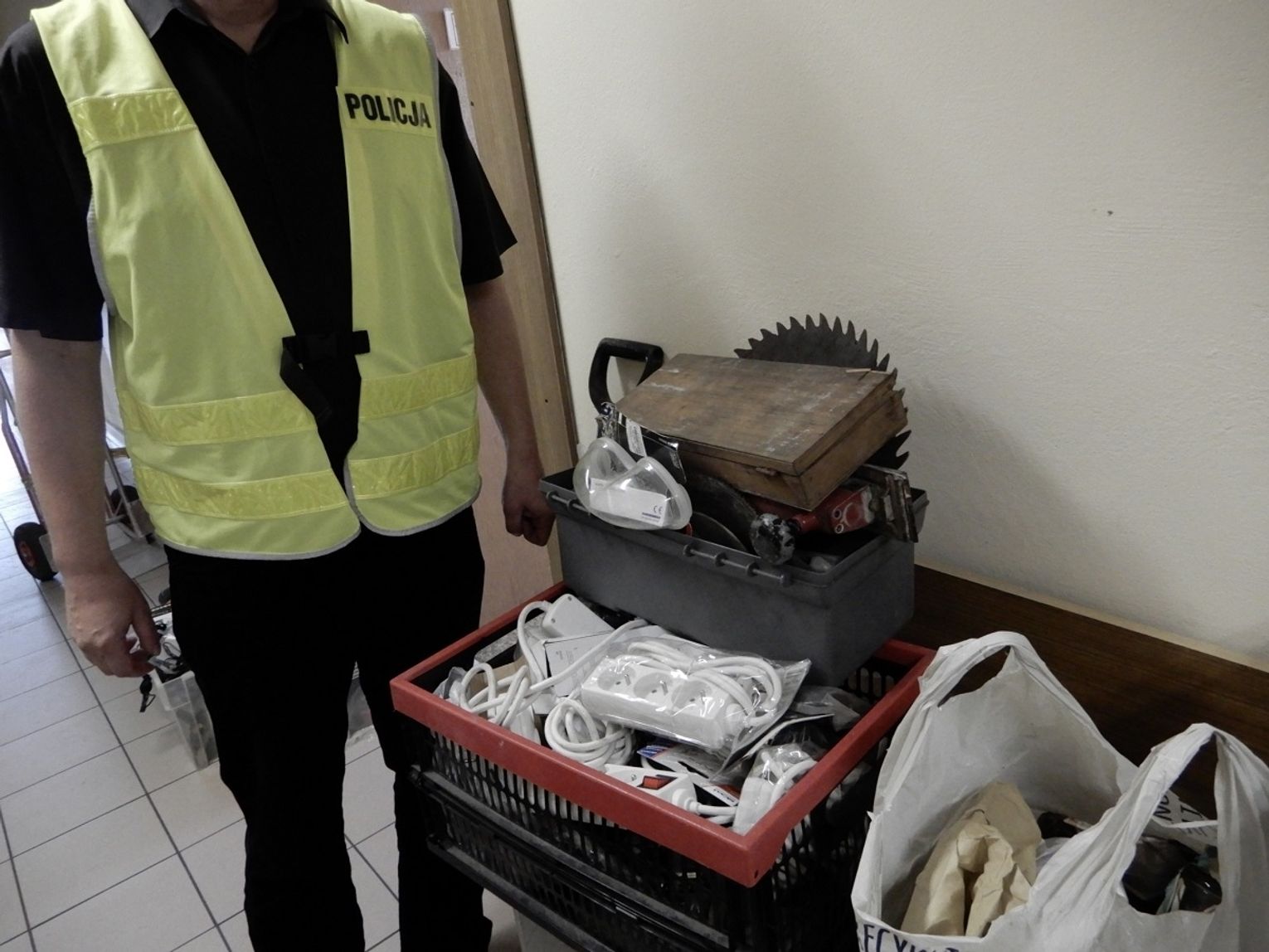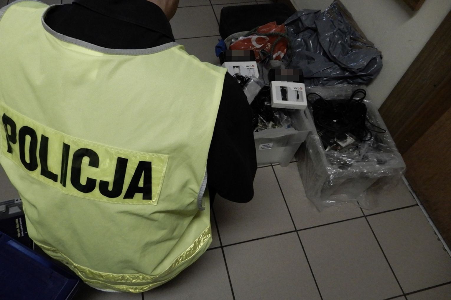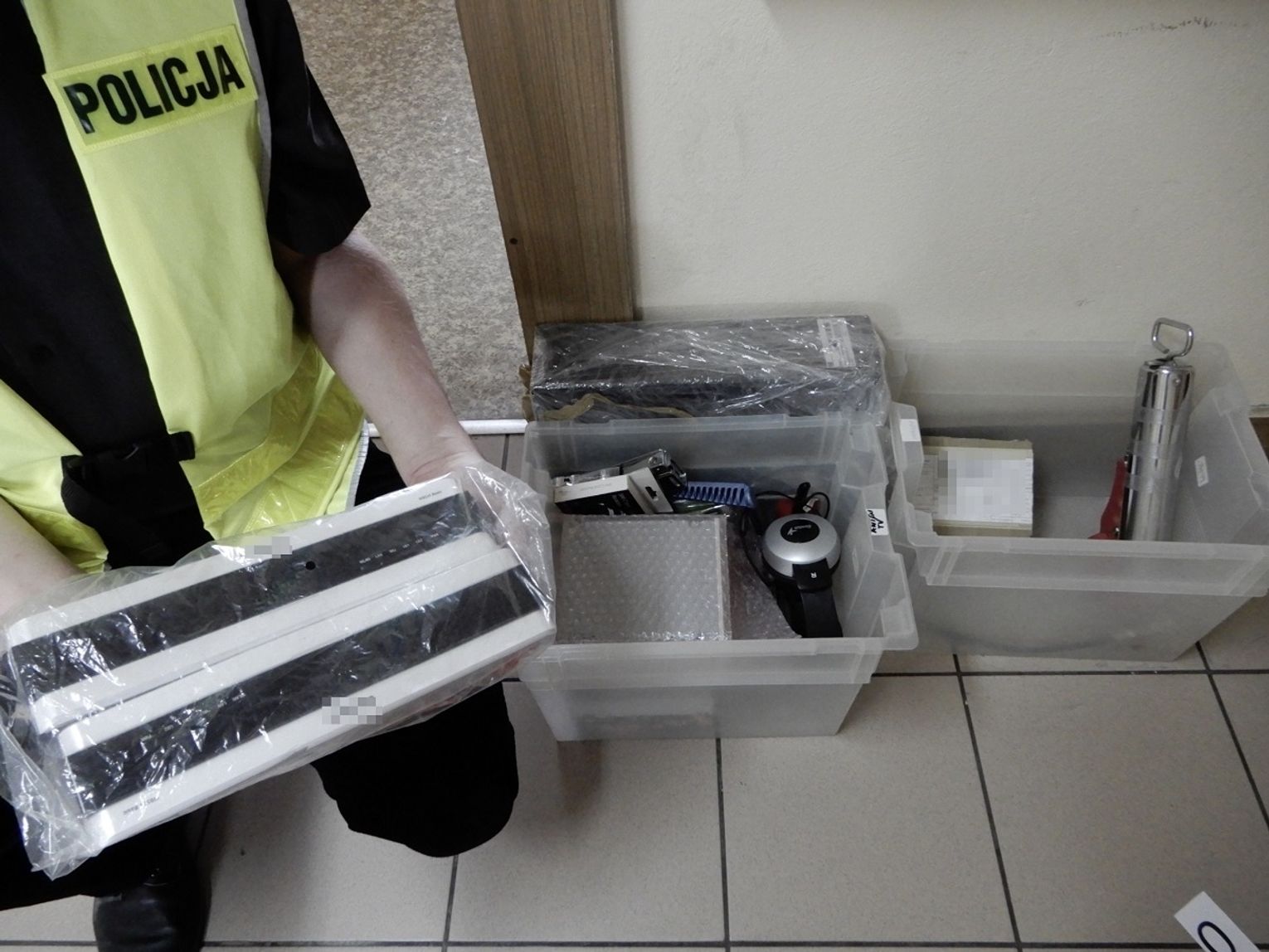 Przed pomieszczeniami magazynu mundurowi ujawnili dużą ilość sprzętu elektronicznego, w tym słuchawki, głośniki, przewody komputerowe i tonery. Jak się okazało, to właśnie złodziej uprzednio wyniósł te rzeczy z magazynu, a następnie chciał je ukryć. Nie zdążył jednak, bo został namierzony przez właścicieli.