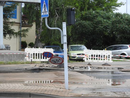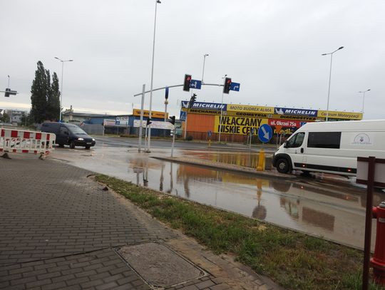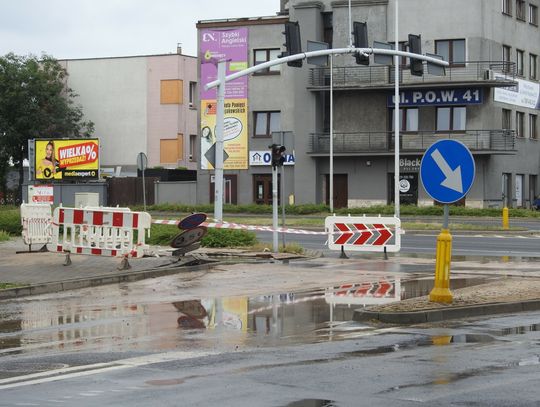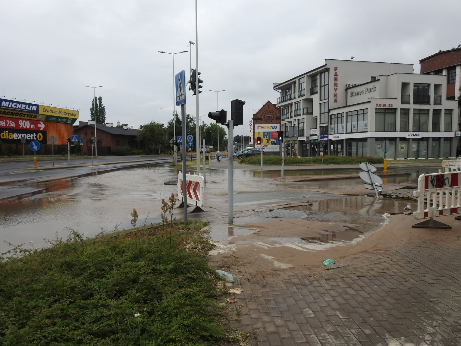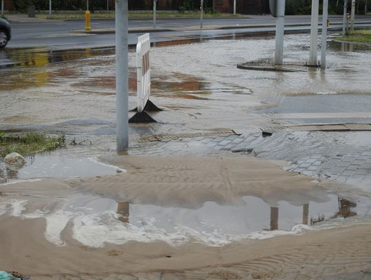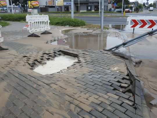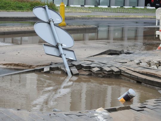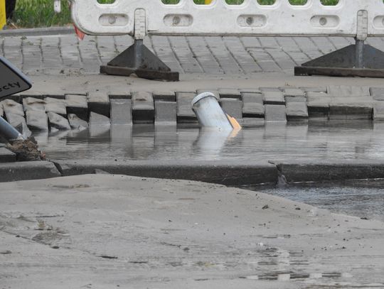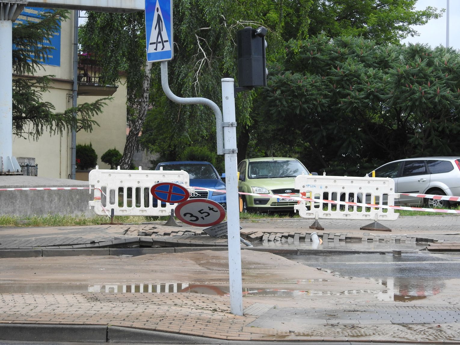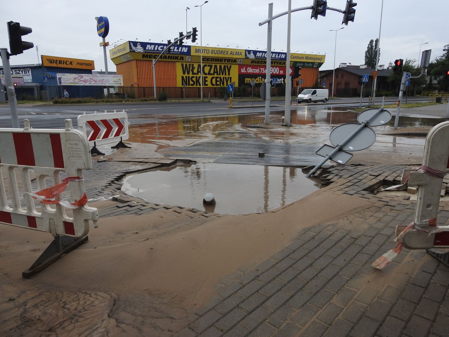 Około godz. 5.00 na skrzyżowaniu ul. POW i Okrzei doszło do poważnej awarii wodociągowej. Woda podmyła obszar w okolicach przejścia dla pieszych w efekcie czego w ogromnej dziurze z wodą wylądował znak drogowy oraz słupek z przyciskiem dla pieszych. Zapadł się także kostka. W wyniku awarii zalane zostało całe skrzyżowanie z ulicą Okrzei. Pracownicy MPWiK odcięli dopływ wody na ul. P.O.W w pobliżu placu Wolności oraz w okolicy torów kolejowych przy ul. Spółdzielczej. Nie odcięto jednak dopływu prądu do słupka z przyciskiem dla pieszych, który zatopiony jest w wodzie. Kostka dookoła miejsca awarii jest ruchoma i zapada się, apelujemy o ostrożność. Ulica P.O.W. w kwietniu w całości była remontowana. Prace wykonywała firma Drogtom za kwotę 229 tys zł. Wyremontowano m.in chodniki i wpusty deszczowe. Ten odcinek w ciągu ostatnich kilkunastu lat był dwukrotnie poddawany generalnej przebudowie. Czy przy tworzeniu tego odcinka zapomniano o wymianie rur, czy użyto niewłaściwej ich jakości? Podmyty pas drogowy zapewne wkrótce da o sobie znać. Kiepska jakość wykonania inwestycji miejskich z pewnością wpływa na cenę wody, a ta jak wiadomo kilka dni temu mocno podrożała... O przyczyny awarii zapytamy niebawem w MPWiK.
