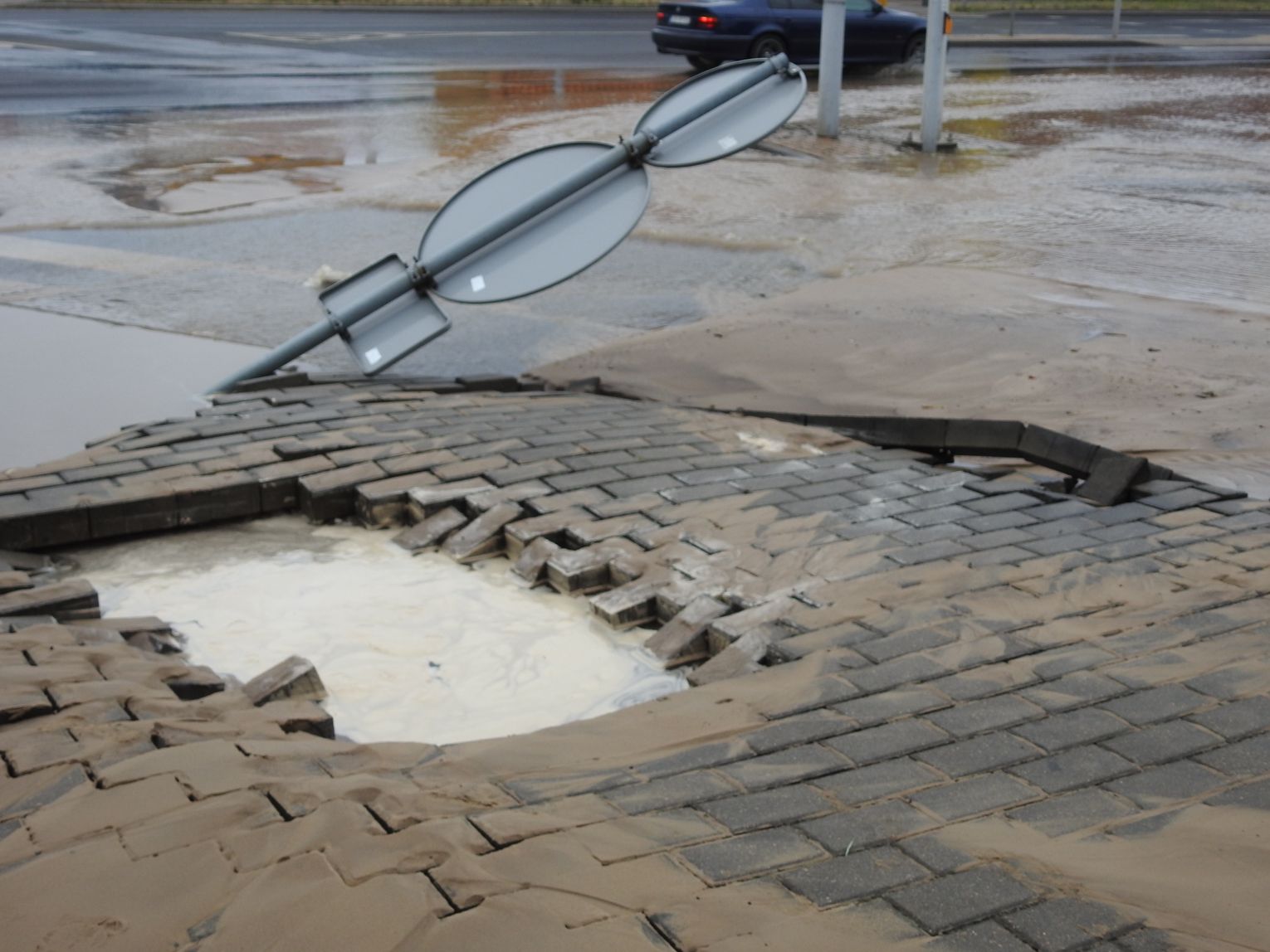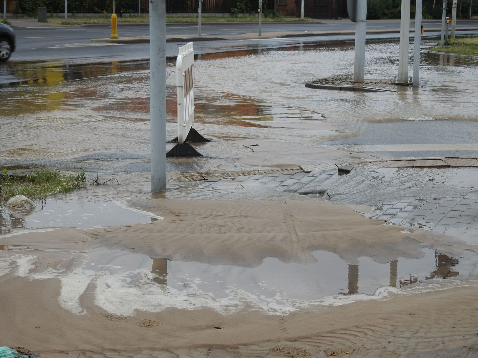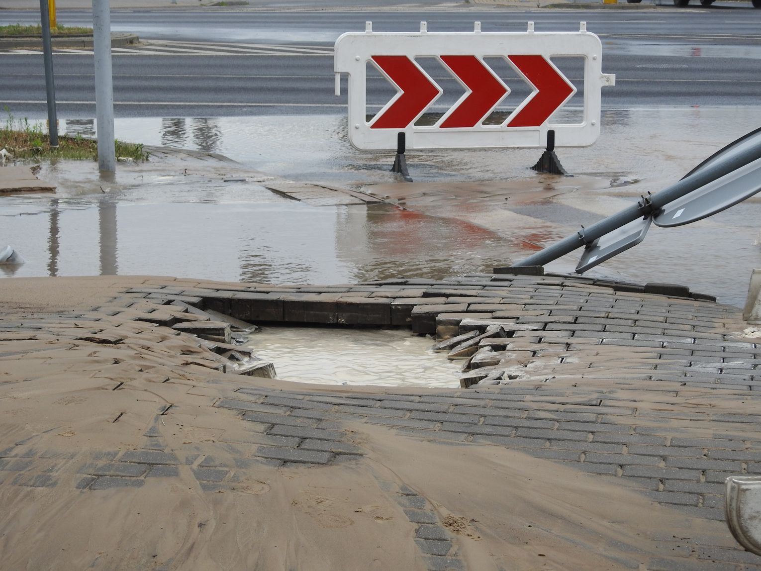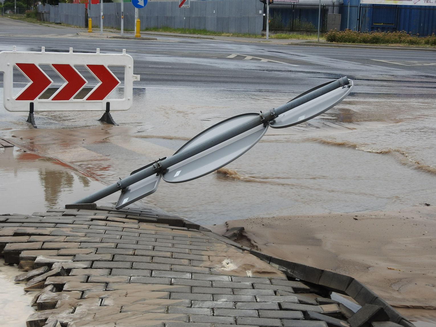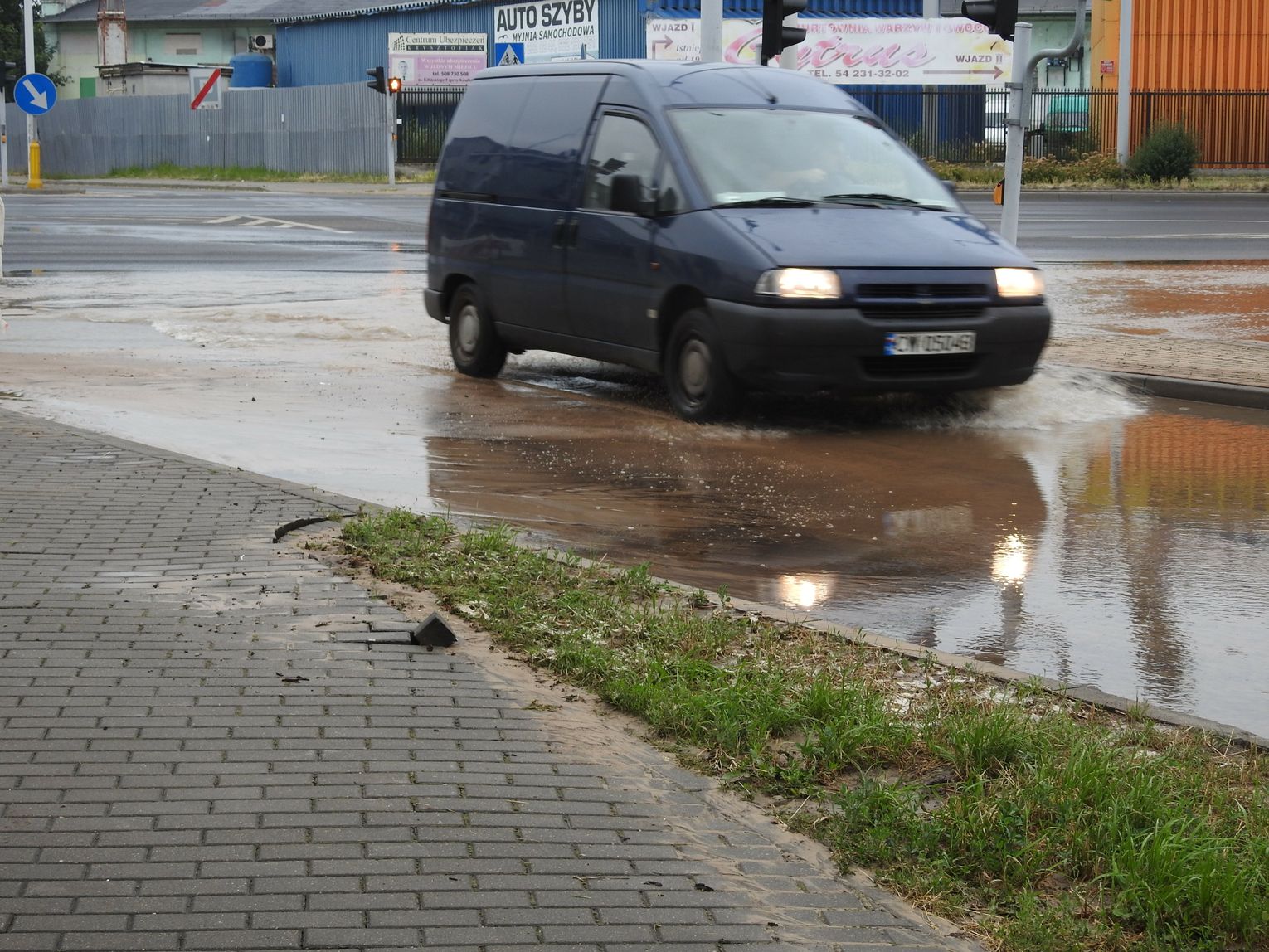 Około godz. 5.00 na skrzyżowaniu ul. POW i Okrzei doszło do poważnej awarii wodociągowej. Woda podmyła obszar w okolicach przejścia dla pieszych w efekcie czego w ogromnej dziurze z wodą wylądował znak drogowy oraz słupek z przyciskiem dla pieszych. Zapadł się także kostka. W wyniku awarii zalane zostało całe skrzyżowanie z ulicą Okrzei. Pracownicy MPWiK odcięli dopływ wody na ul. P.O.W w pobliżu placu Wolności oraz w okolicy torów kolejowych przy ul. Spółdzielczej. Nie odcięto jednak dopływu prądu do słupka z przyciskiem dla pieszych, który zatopiony jest w wodzie. Kostka dookoła miejsca awarii jest ruchoma i zapada się, apelujemy o ostrożność. Ulica P.O.W. w kwietniu w całości była remontowana. Prace wykonywała firma Drogtom za kwotę 229 tys zł. Wyremontowano m.in chodniki i wpusty deszczowe. Ten odcinek w ciągu ostatnich kilkunastu lat był dwukrotnie poddawany generalnej przebudowie. Czy przy tworzeniu tego odcinka zapomniano o wymianie rur, czy użyto niewłaściwej ich jakości? Podmyty pas drogowy zapewne wkrótce da o sobie znać. Kiepska jakość wykonania inwestycji miejskich z pewnością wpływa na cenę wody, a ta jak wiadomo kilka dni temu mocno podrożała... O przyczyny awarii zapytamy niebawem w MPWiK.