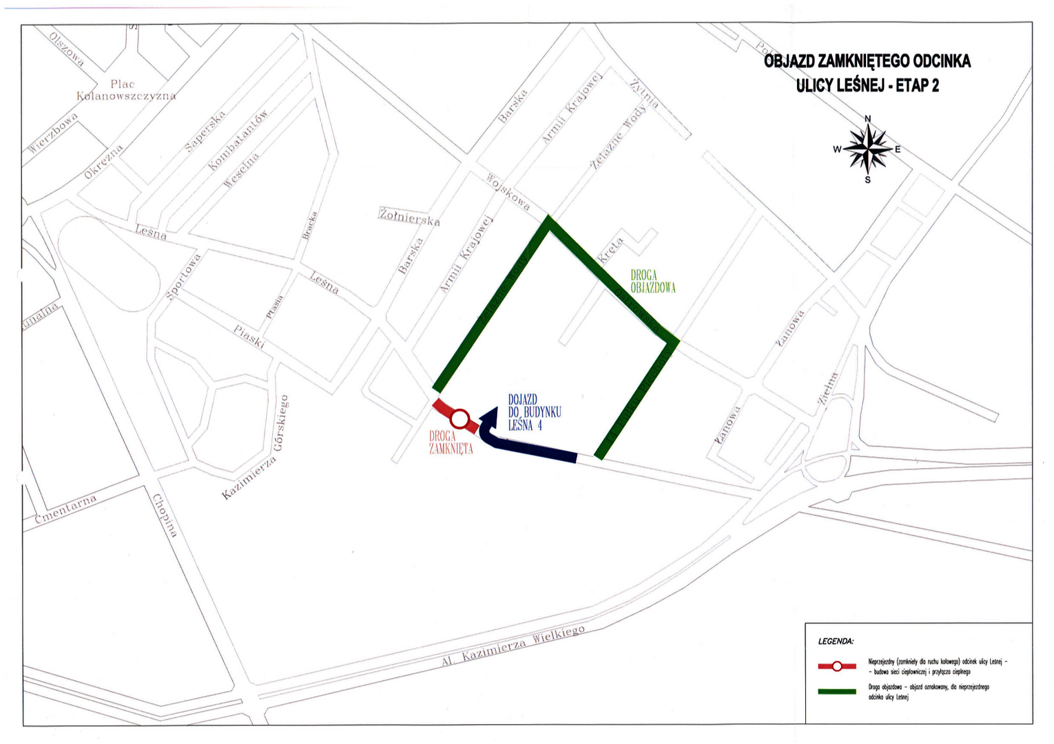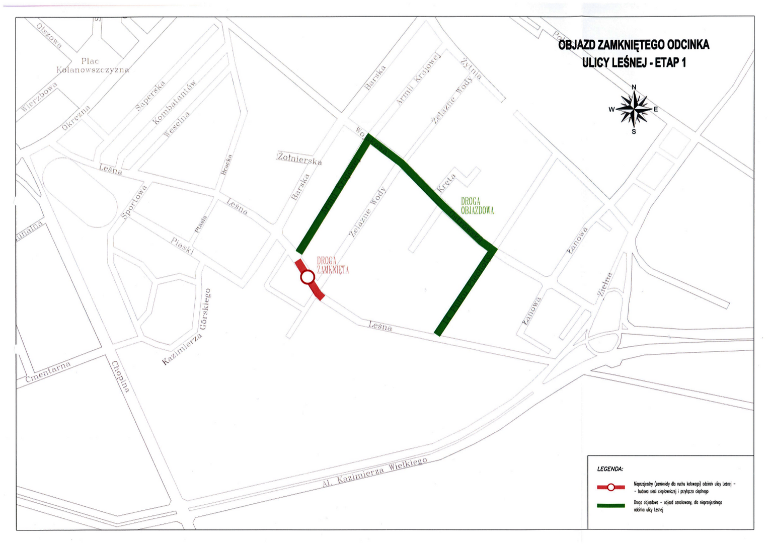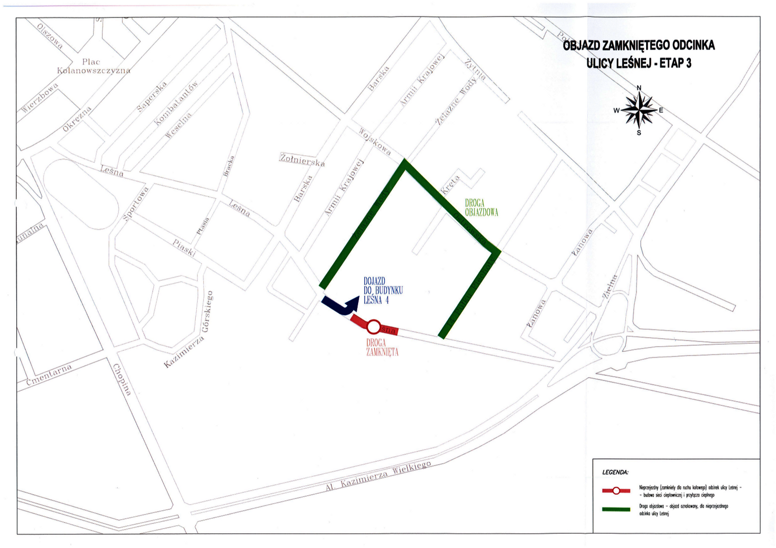 "Na zajęcie pasa drogowego ulicy Leśnej sporządzony został Projekt Czasowej Zmiany Oznakowania Organizacji Ruchu. W celu zminimalizowania utrudnień w ruchu, firma realizująca projekt otrzymała wytyczne, by w oparciu o istniejącą infrastrukturę dróg w tej części naszego miasta, podzielić zajmowanie pasa drogowego ulicy Leśnej na III etapy. Na podstawie przekazanej wykonawcy robót dokumentacji technicznej, w tym Projektu Czasowej Zmiany Oznakowania Organizacji Ruchu, wykonawca w dniu 11 lutego br. złożył w Miejskim Zarządzie Usług Komunalnych i Dróg we Włocławku, wniosek o czasowe zajęcie pasa drogowego ulicy Leśnej w celu prowadzenia robót związanych z wykonaniem przedmiotowej sieci ciepłowniczej i określił w tymże wniosku, że pas drogowy ulicy Leśnej będzie zajmowany etapowo".