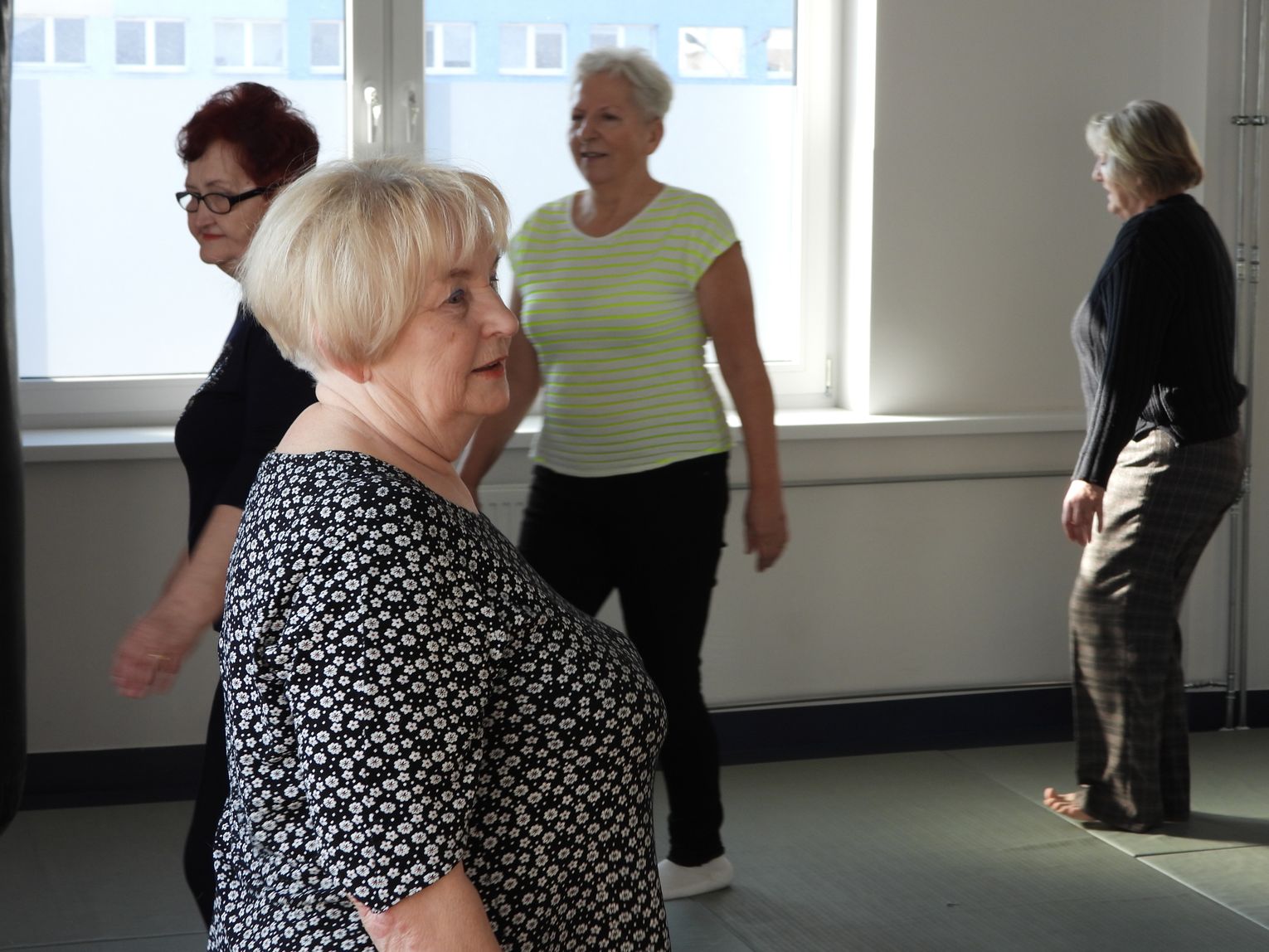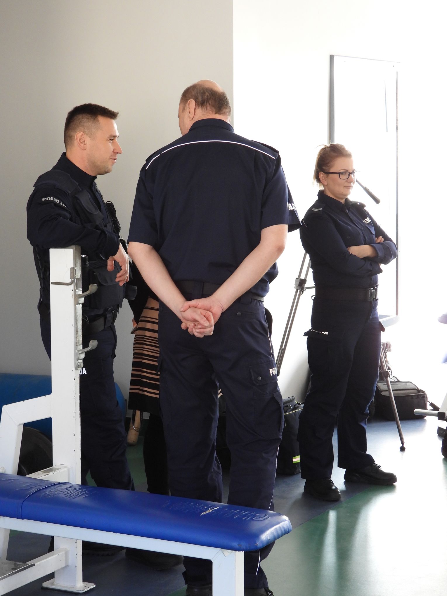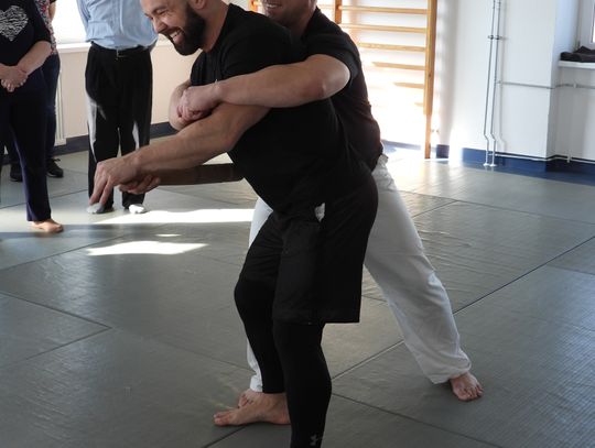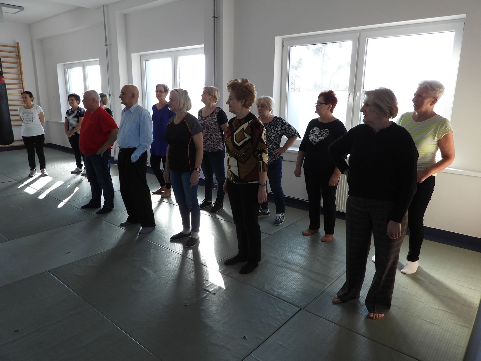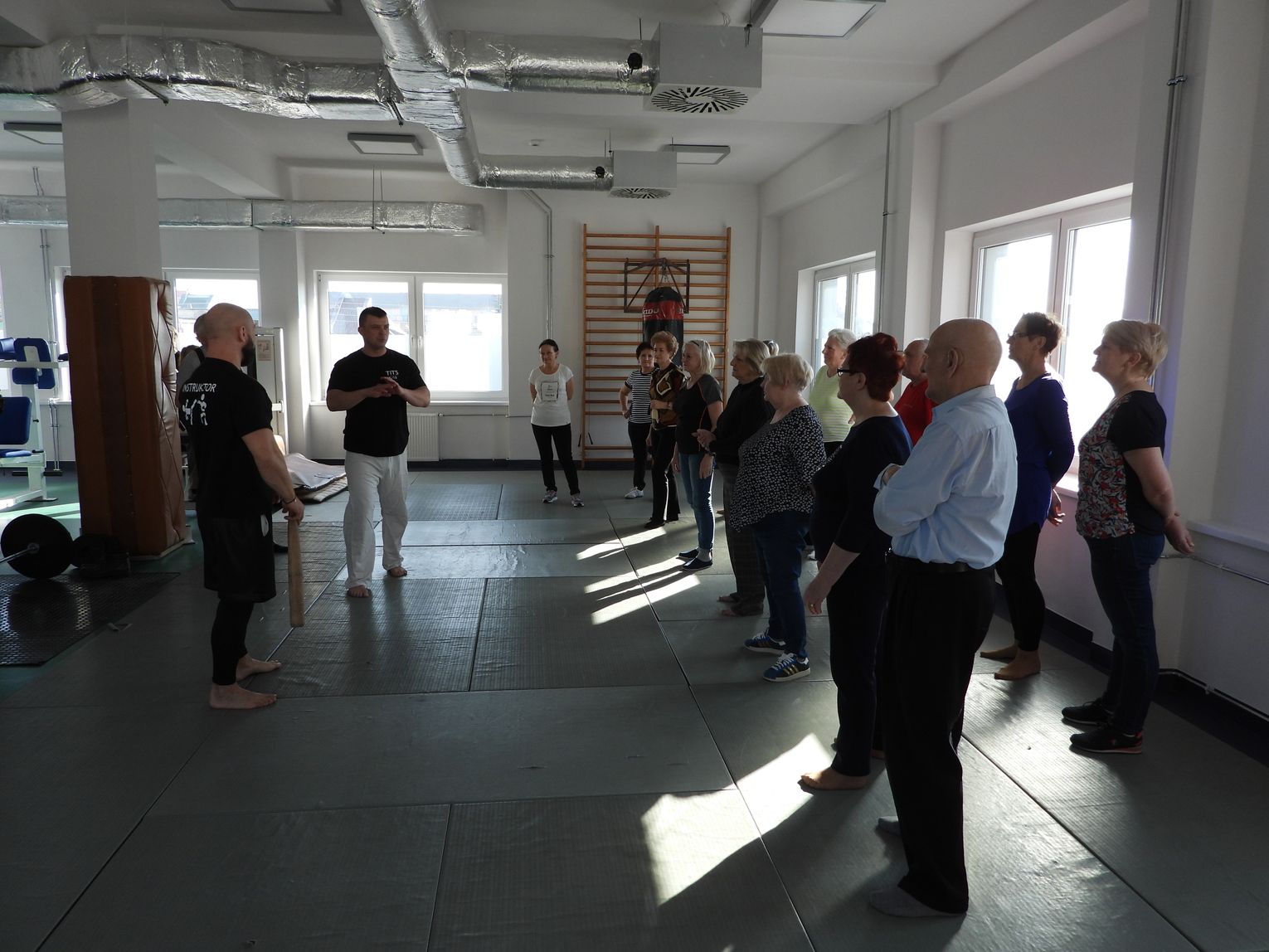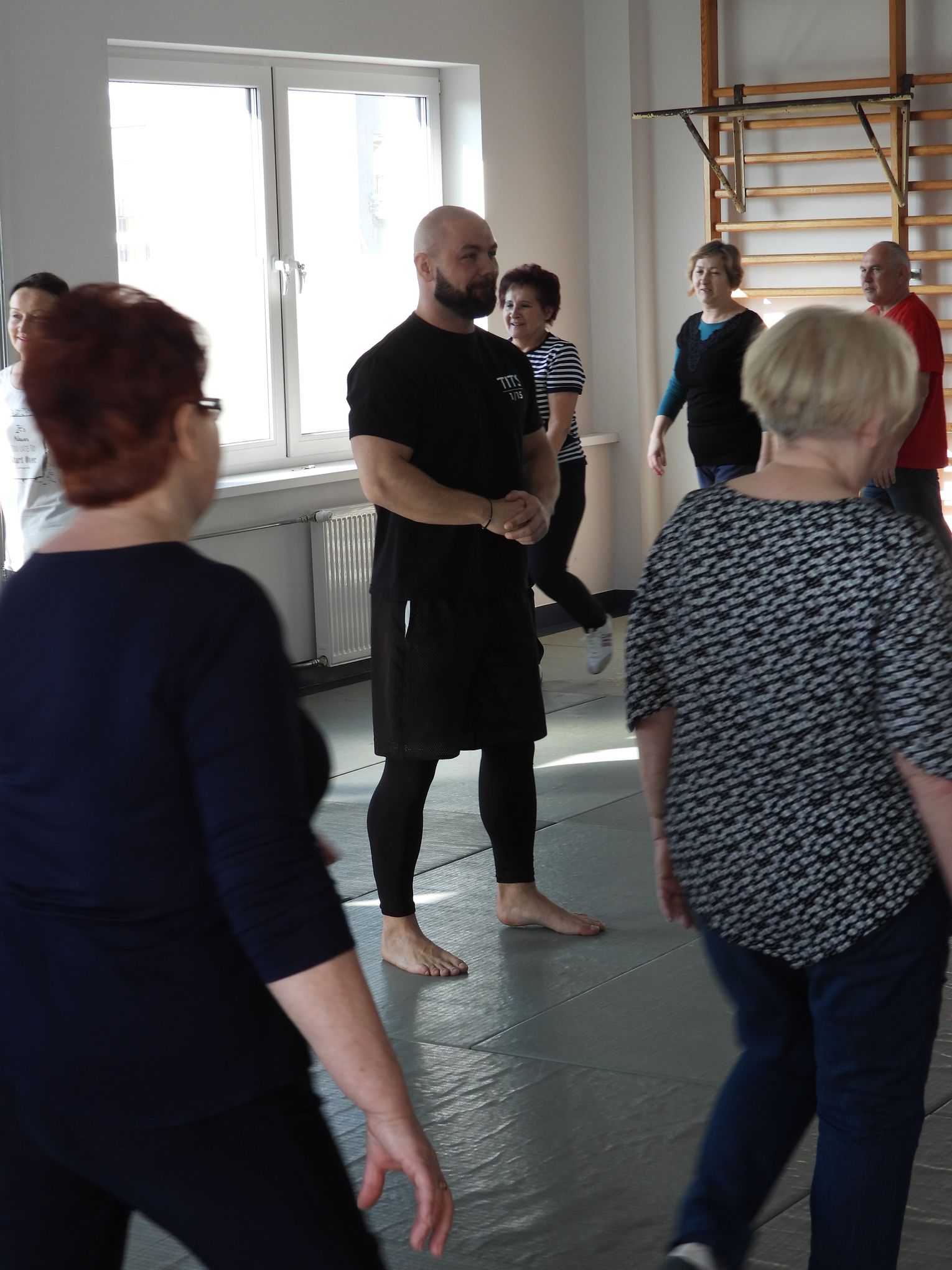 W kolejnej części spotkania seniorzy mogli zapoznać się z podstawowymi ruchami ułatwiającymi wydostanie się z uchwytu potencjalnego napastnika. Ćwiczenia prowadzili policjanci wydziału patrolowo-interwencyjnego. Rozdano także breloczki z numerami do włocławskich dzielnicowych oraz kamizelki odblaskowe. Seniorzy dowiedzieli się o zasadach funkcjonowania numerów alarmowych, przyjmowania zgłoszeń oraz otrzymali materiały informacyjne dotyczące tych zagadnień.