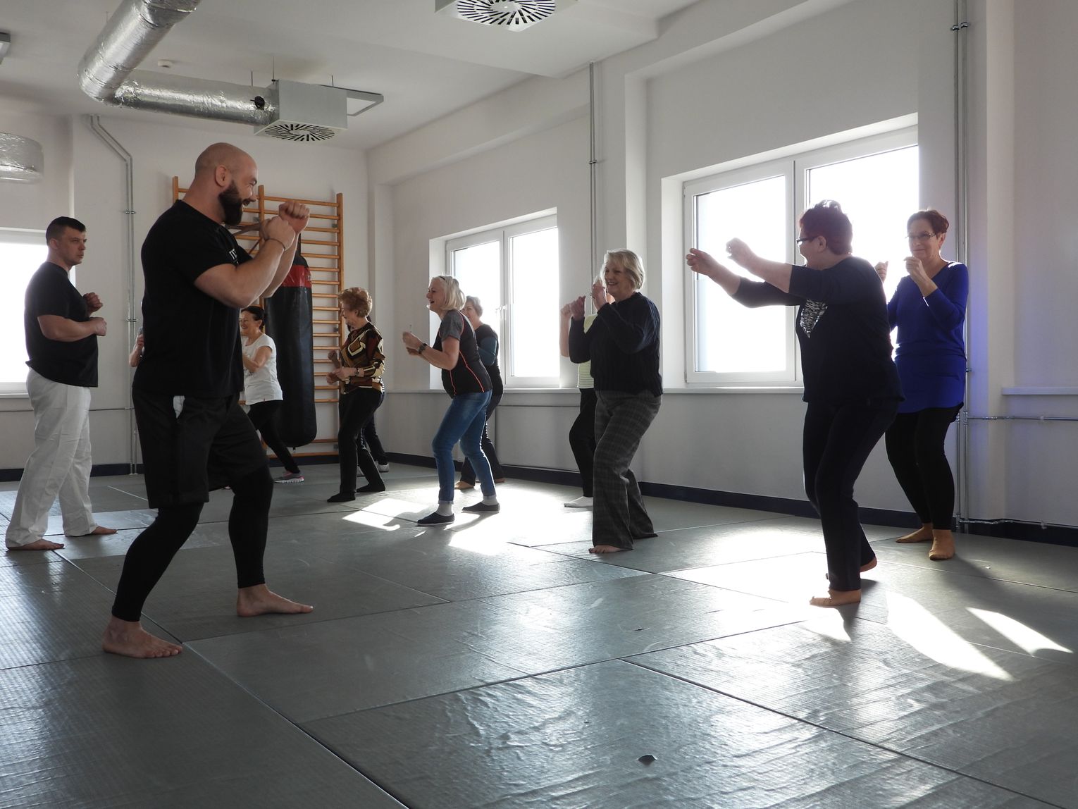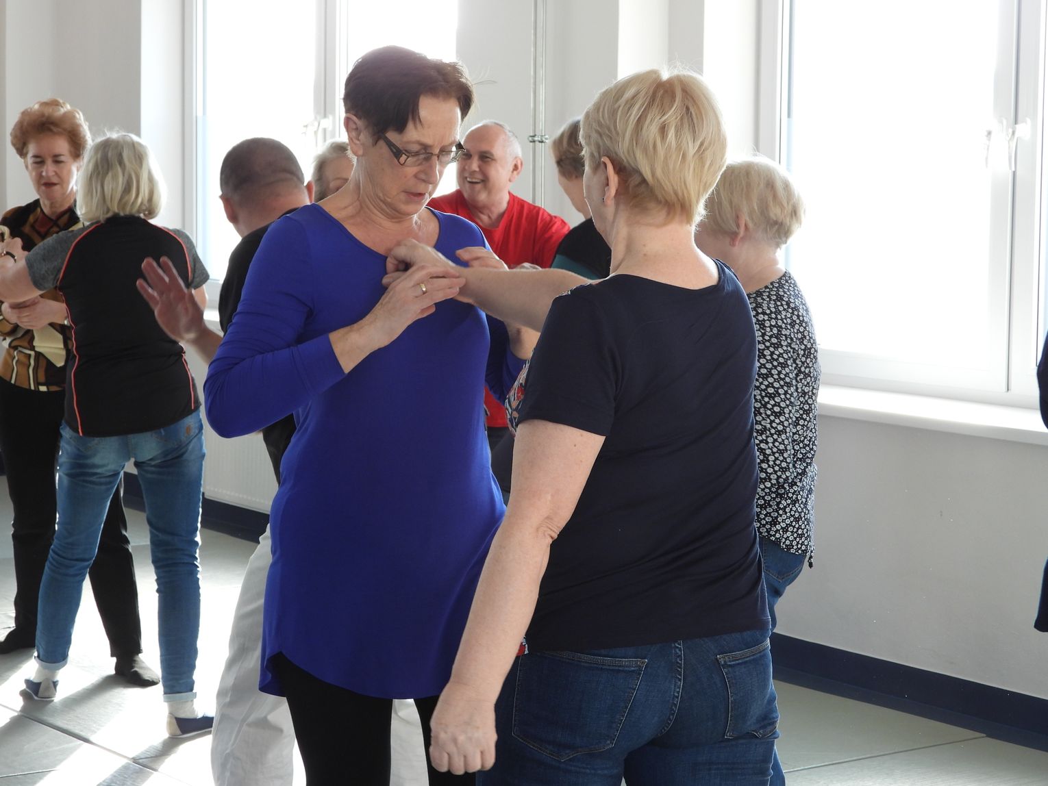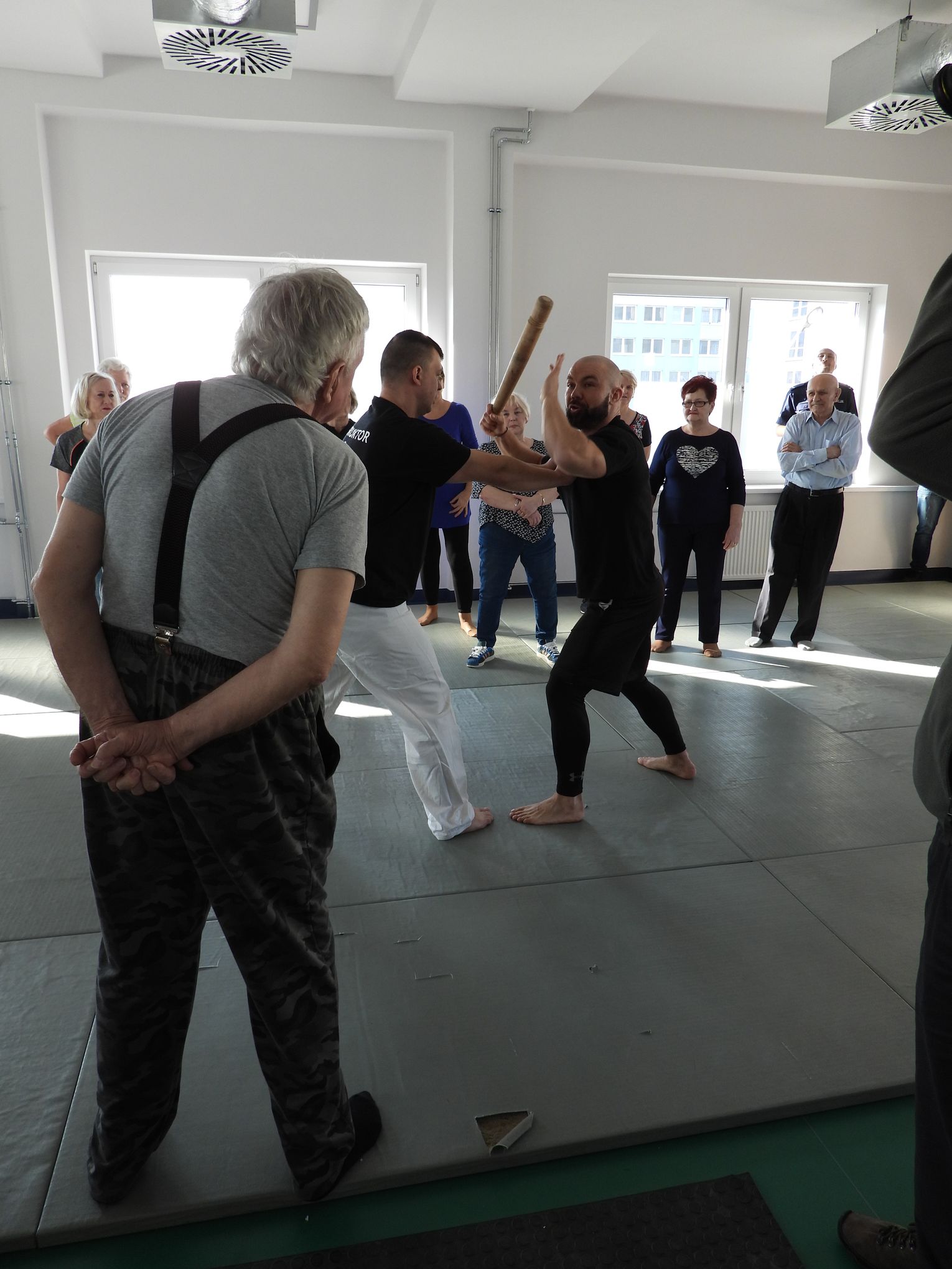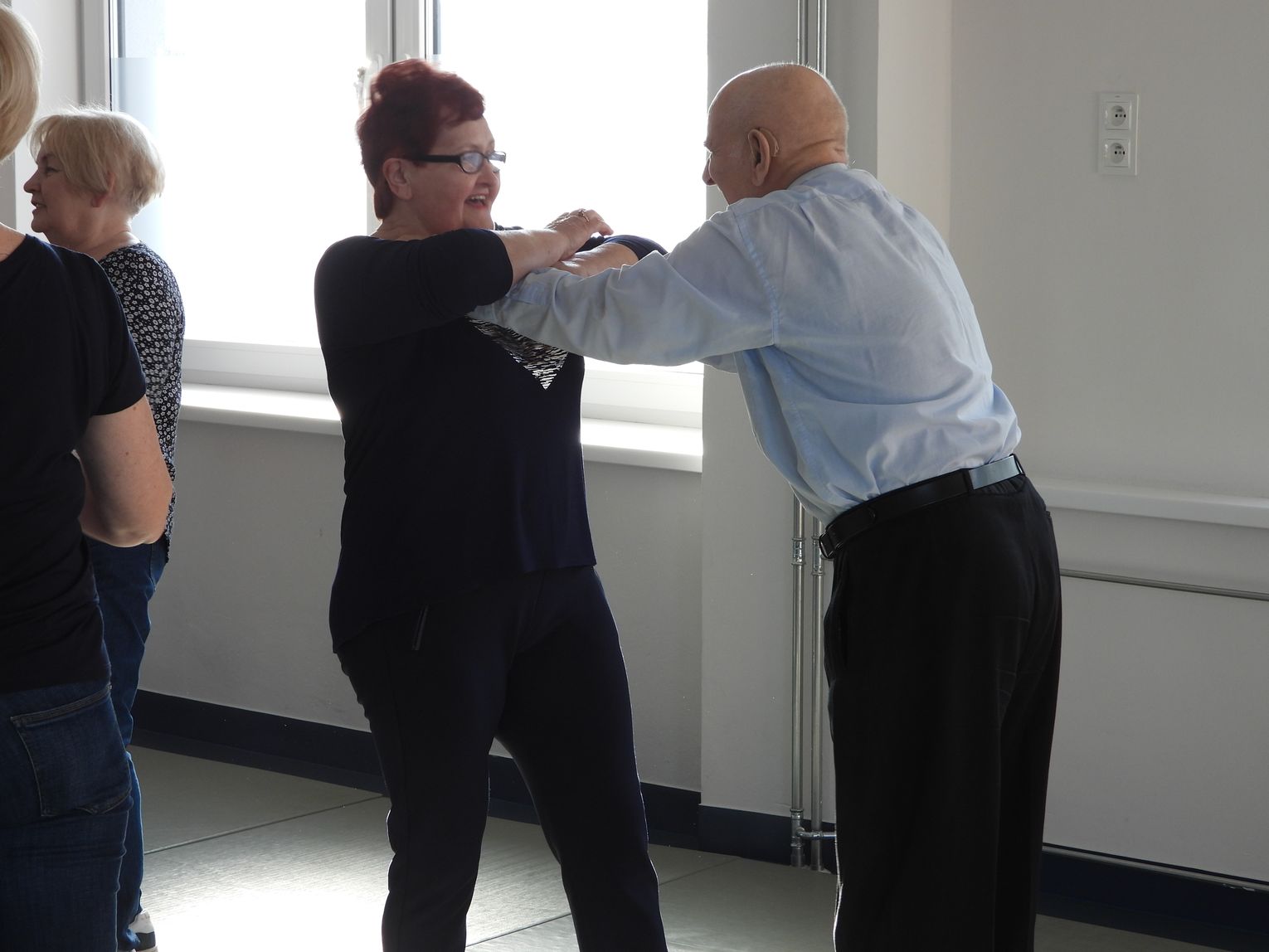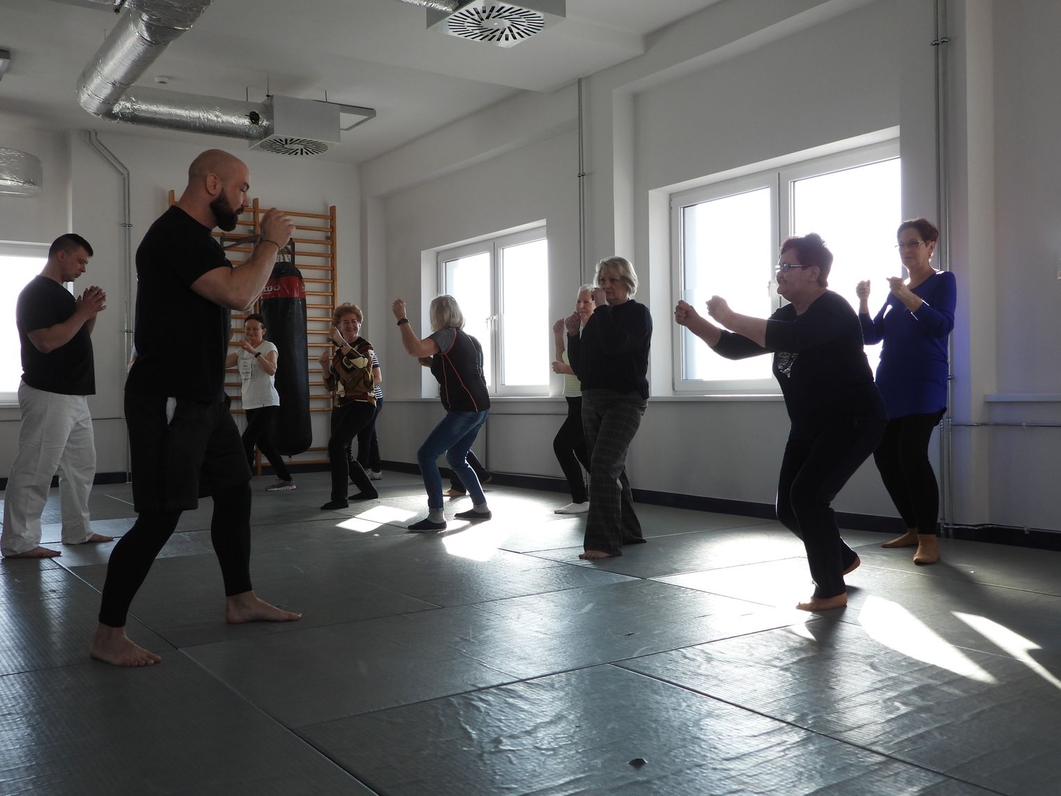 W kolejnej części spotkania seniorzy mogli zapoznać się z podstawowymi ruchami ułatwiającymi wydostanie się z uchwytu potencjalnego napastnika. Ćwiczenia prowadzili policjanci wydziału patrolowo-interwencyjnego. Rozdano także breloczki z numerami do włocławskich dzielnicowych oraz kamizelki odblaskowe. Seniorzy dowiedzieli się o zasadach funkcjonowania numerów alarmowych, przyjmowania zgłoszeń oraz otrzymali materiały informacyjne dotyczące tych zagadnień.